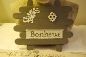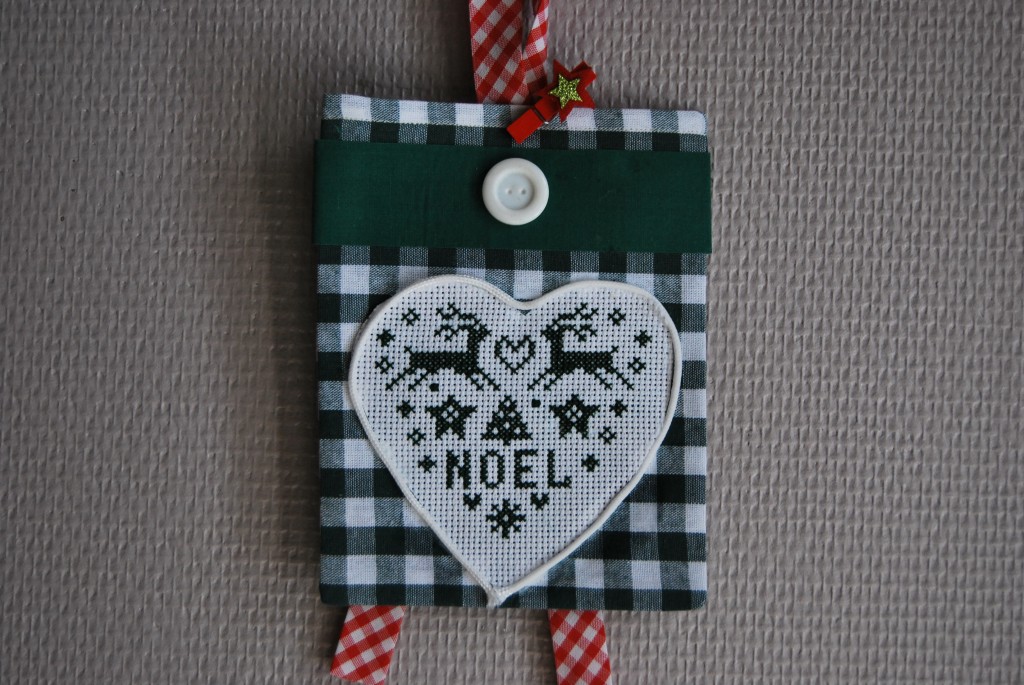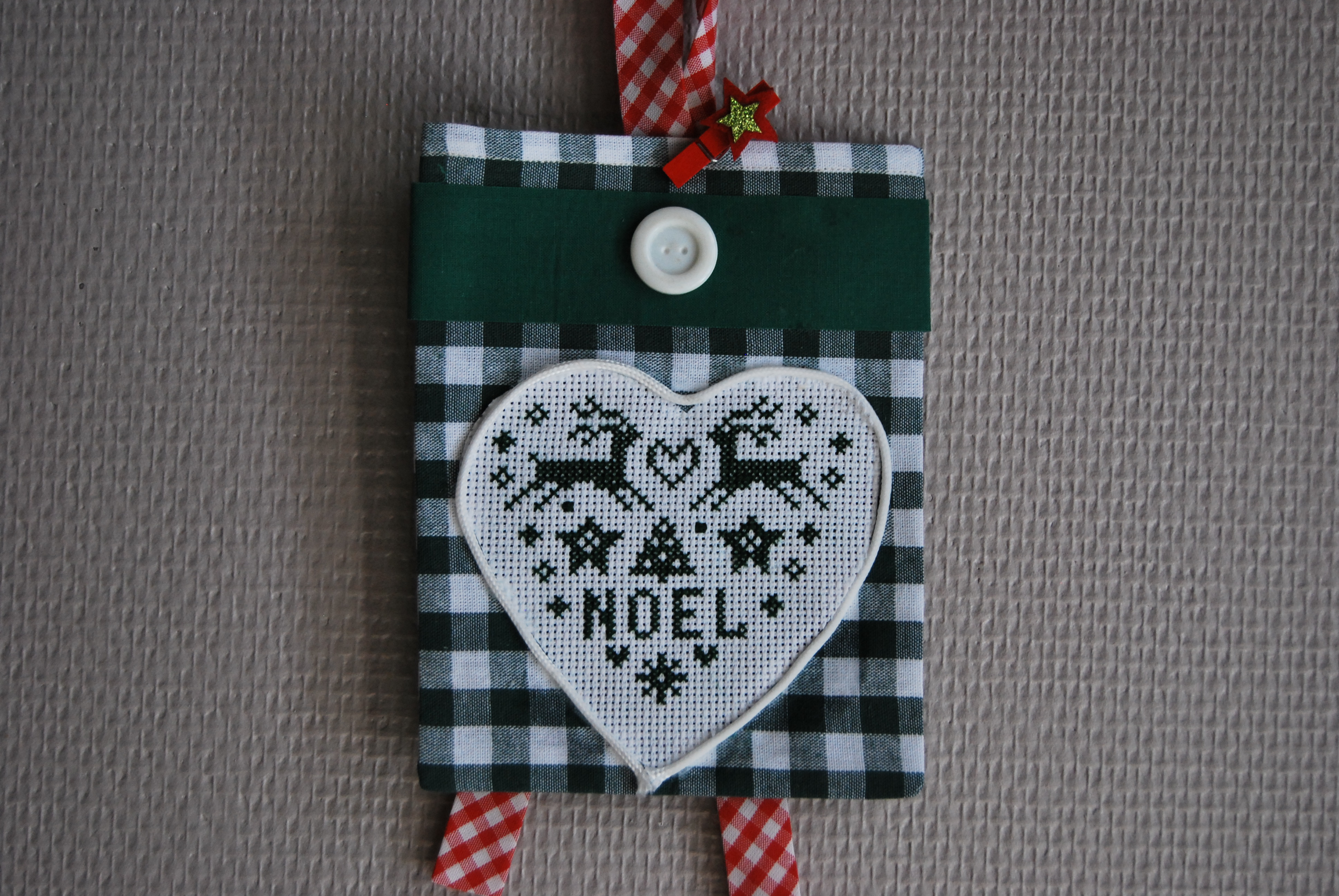 Et là, en dépit des « vices de fabrication » que les brodeuses et autres cartonneuses ne manqueront pas de déceler, je préfère cette version beaucoup plus « douce »… Un charm « papillon » et un coeur en bois (issus de mes achats à Creativa Bruxelles) ajoutent une petite touche originale et habillent l’espace.