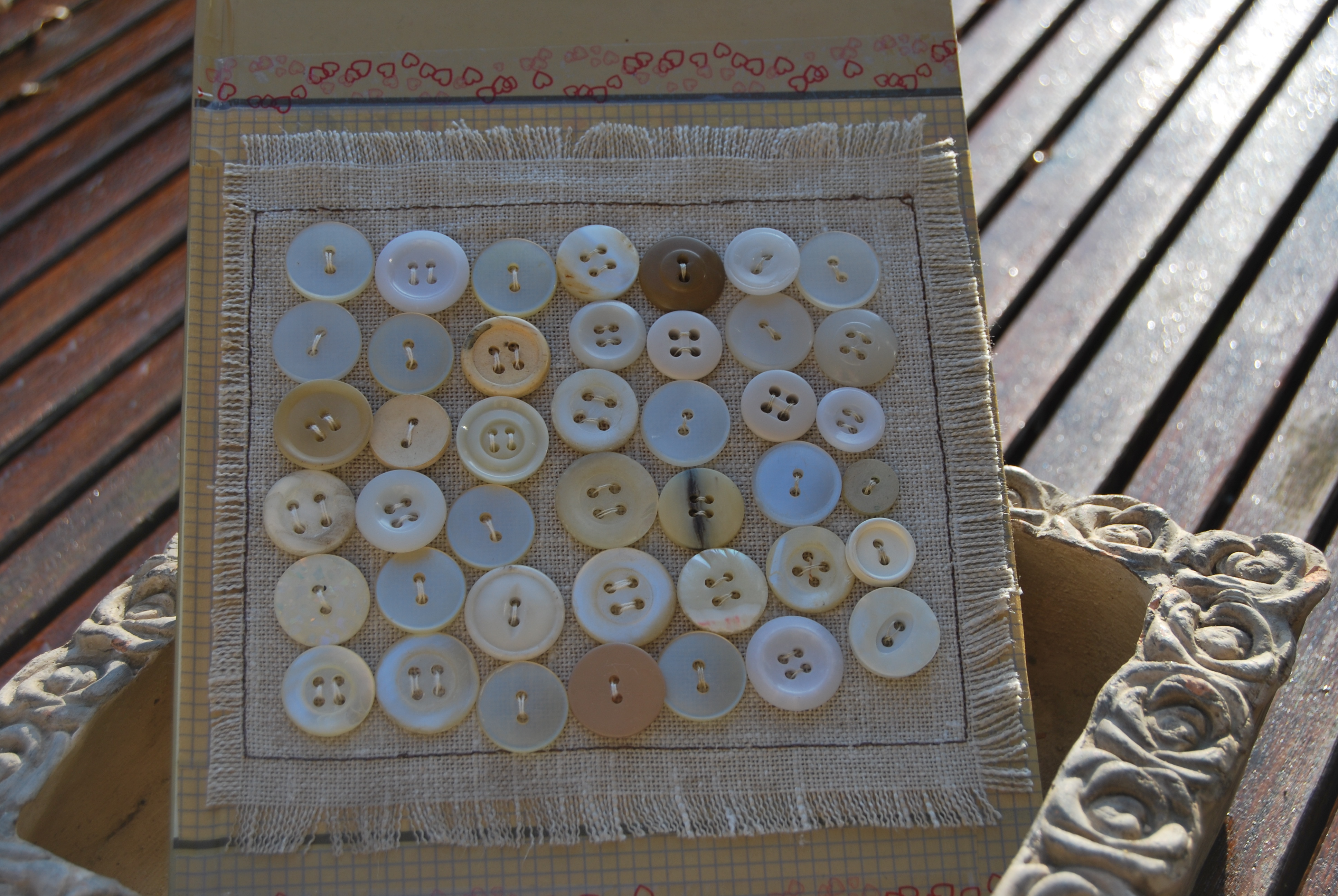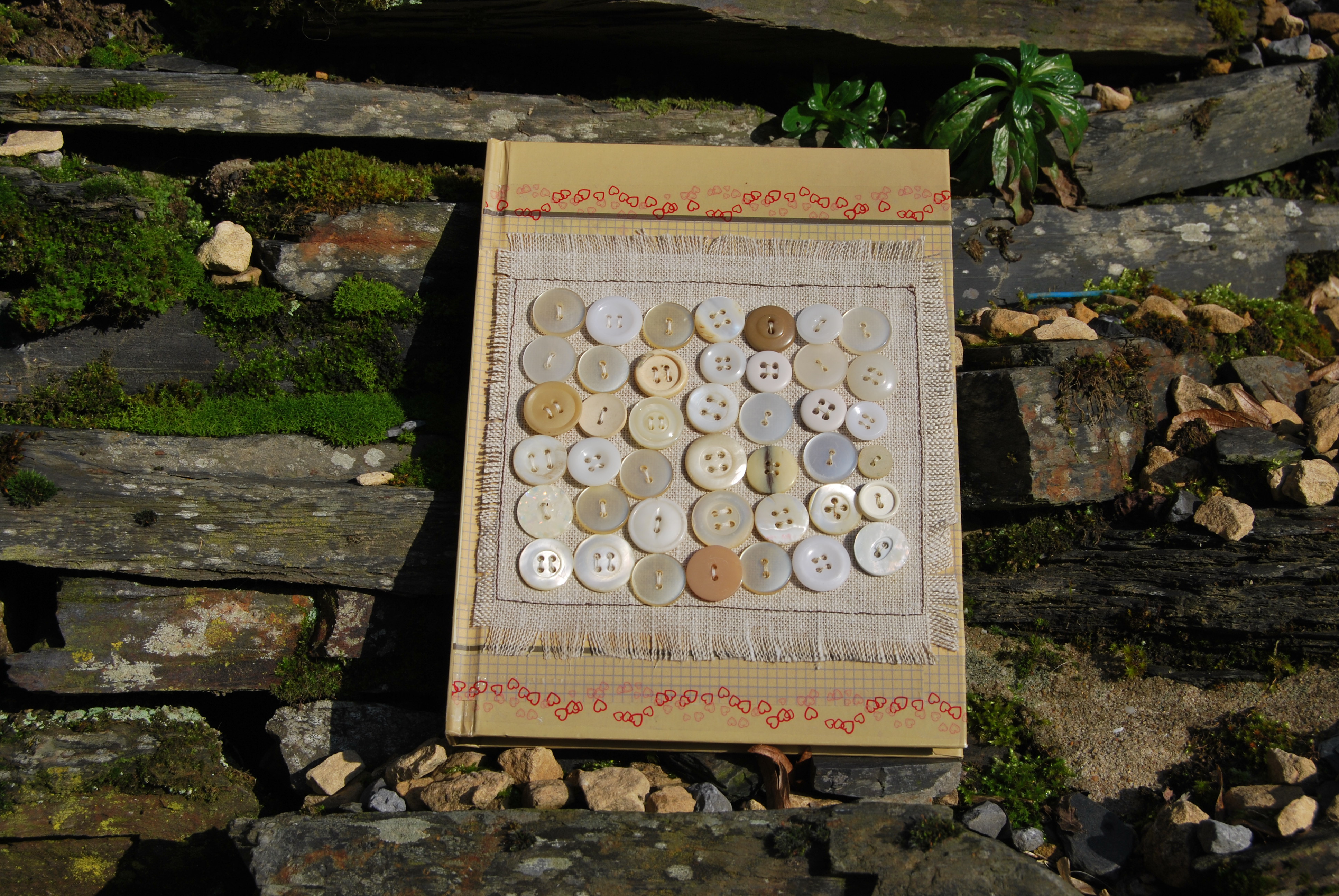 Toujours dans la même lignée que le précédent billet … une autre idée d’utilisation des boutons. Je les ai cousus sur un coupon de lin, lequel a fini sur un carnet de notes assez rigide car les boutons, ça pèse lourd !! Et après l’apposition de masking tape pour habiller le tout, voici ce que cela donne sous un rayon de soleil à l’extérieur :