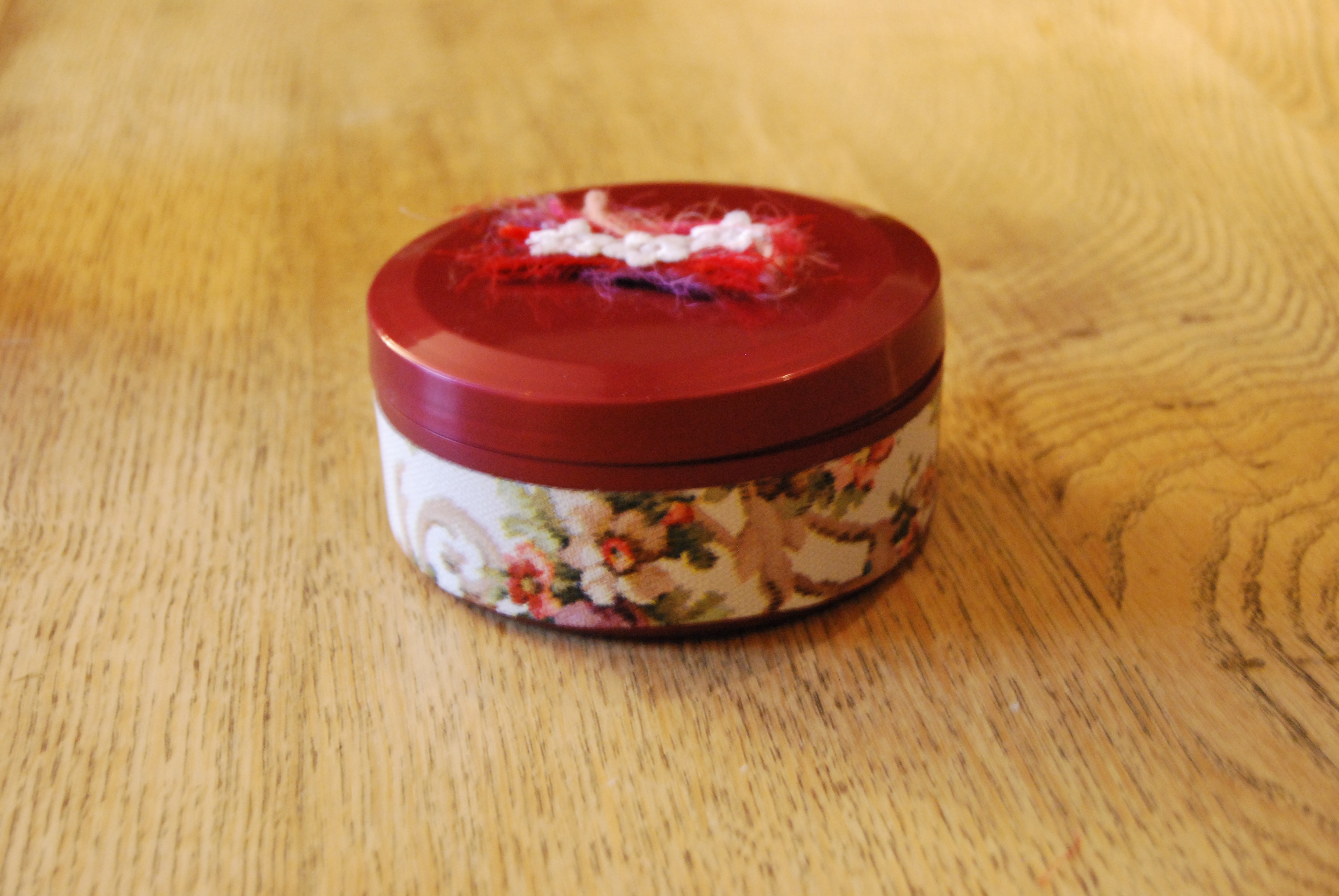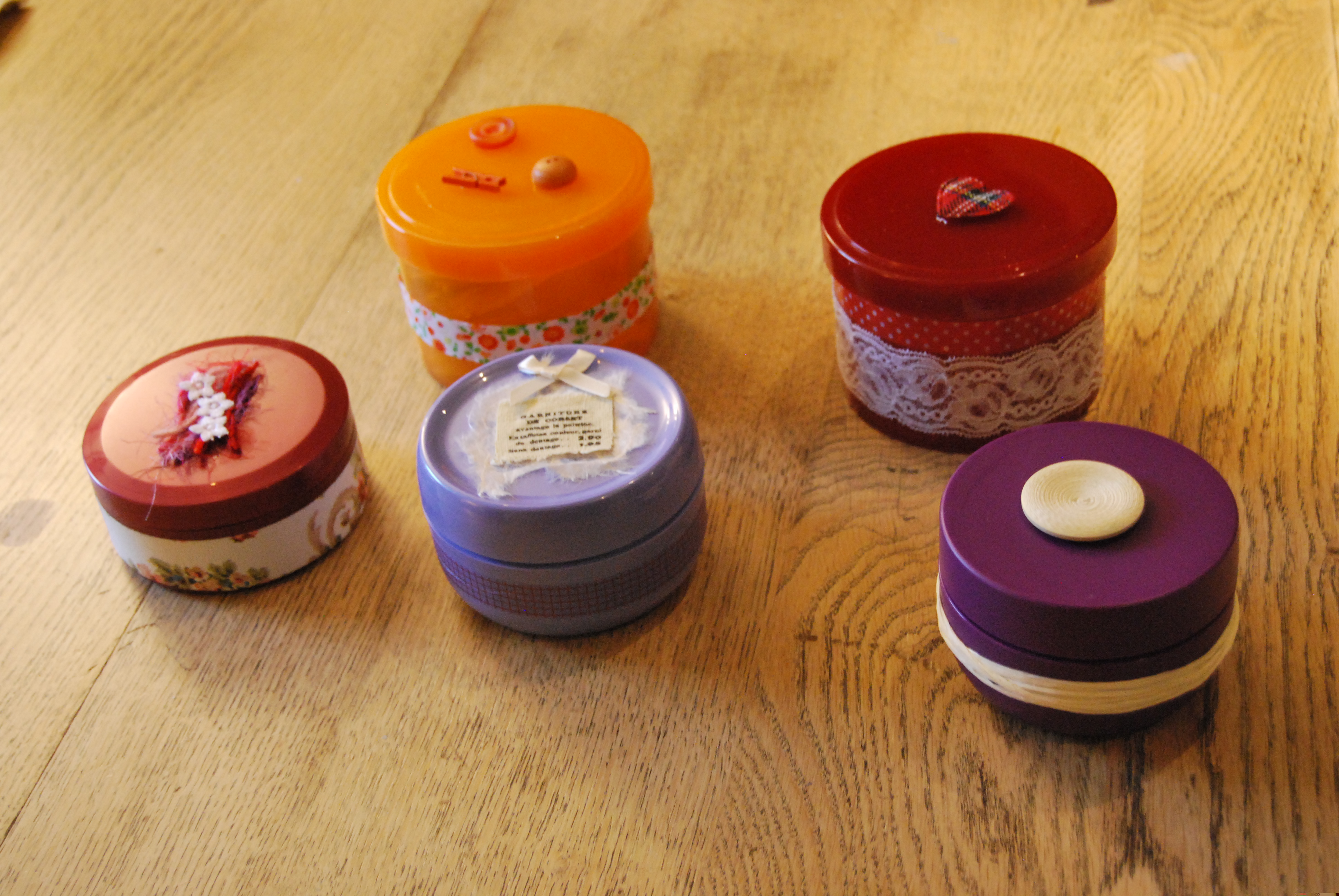 Ayant récupéré quelques boîtes colorées en plastique (merci, maman !!) je les ai customisées tout simplement et sans prétention afin d’y ranger toutes sortes de petit matériel de bricolage, une étiquette au verso indique son contenu.