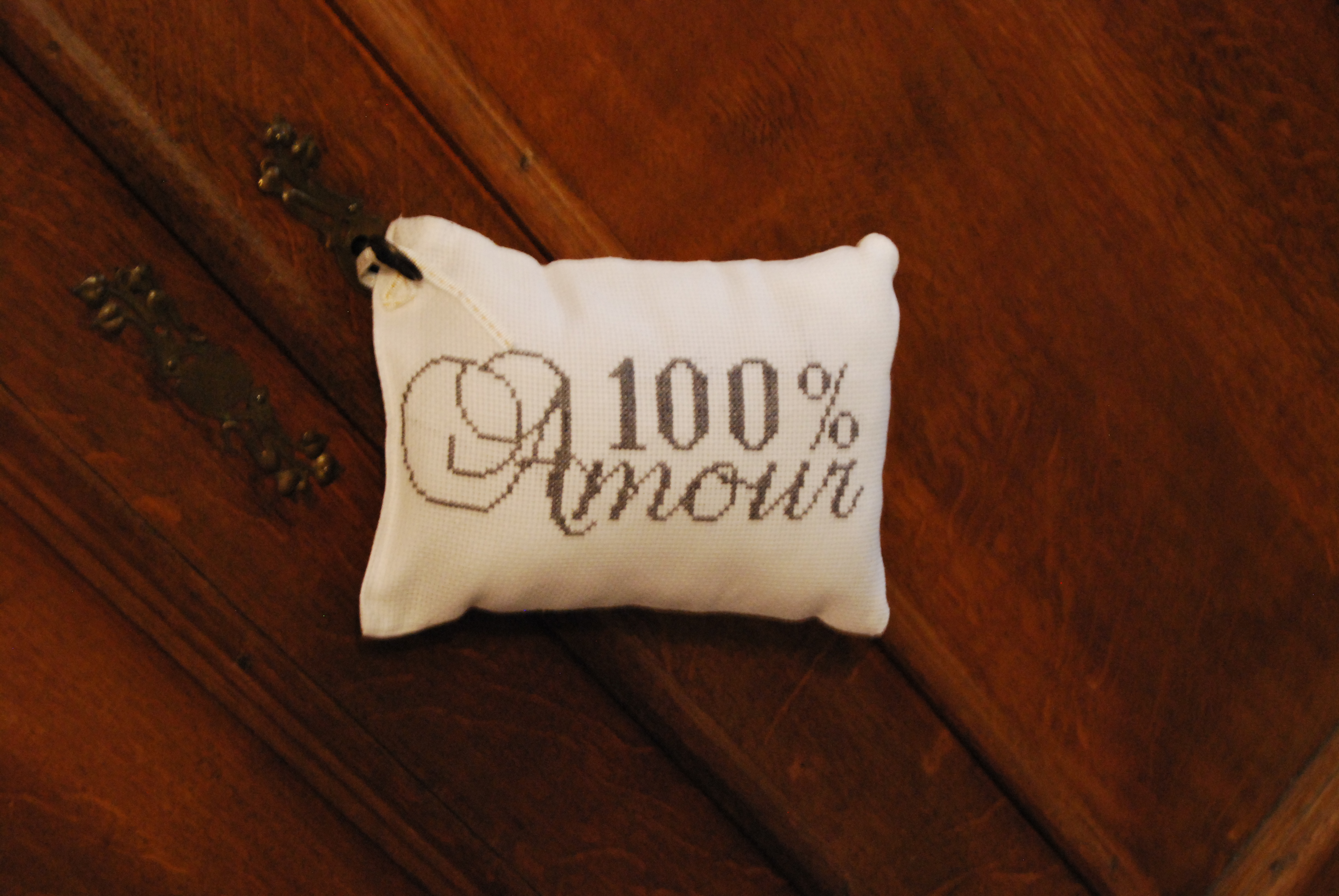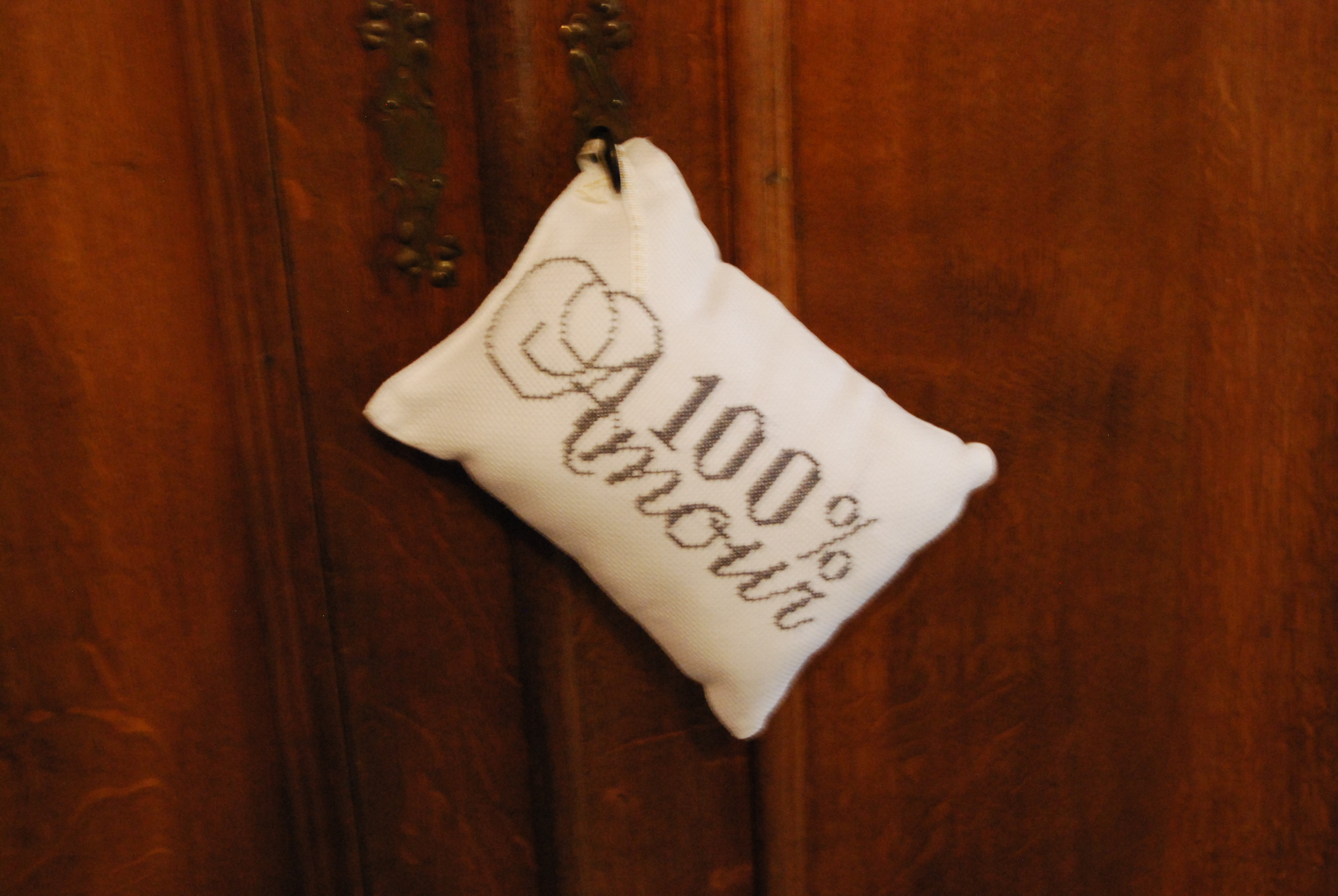 Un coussin de porte brodé l’an dernier qui a trouvé naturellement sa place sur l’armoire de la chambre à coucher. J’aime beaucoup le graphisme tiré d’une revue « passion fil » de 2013.