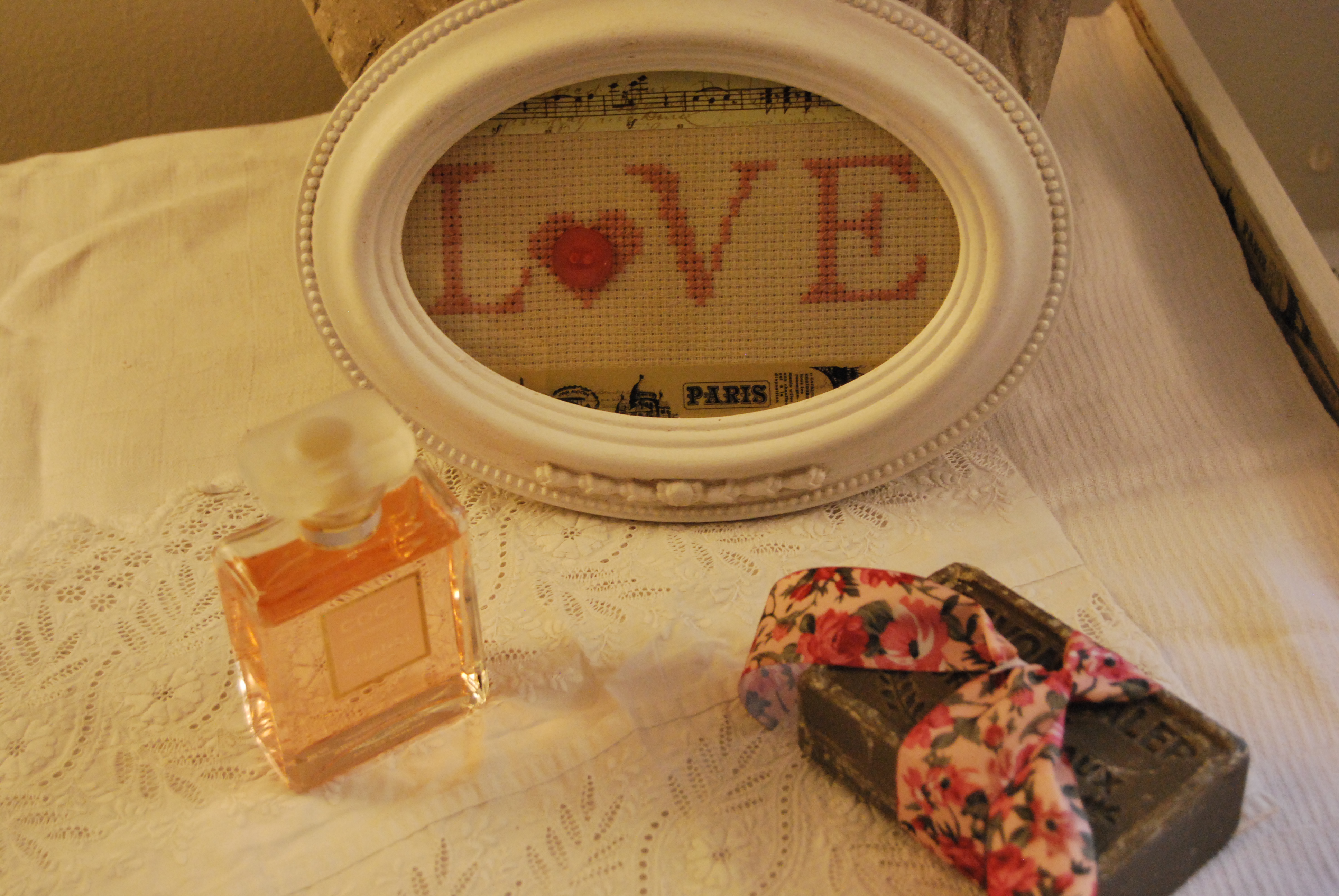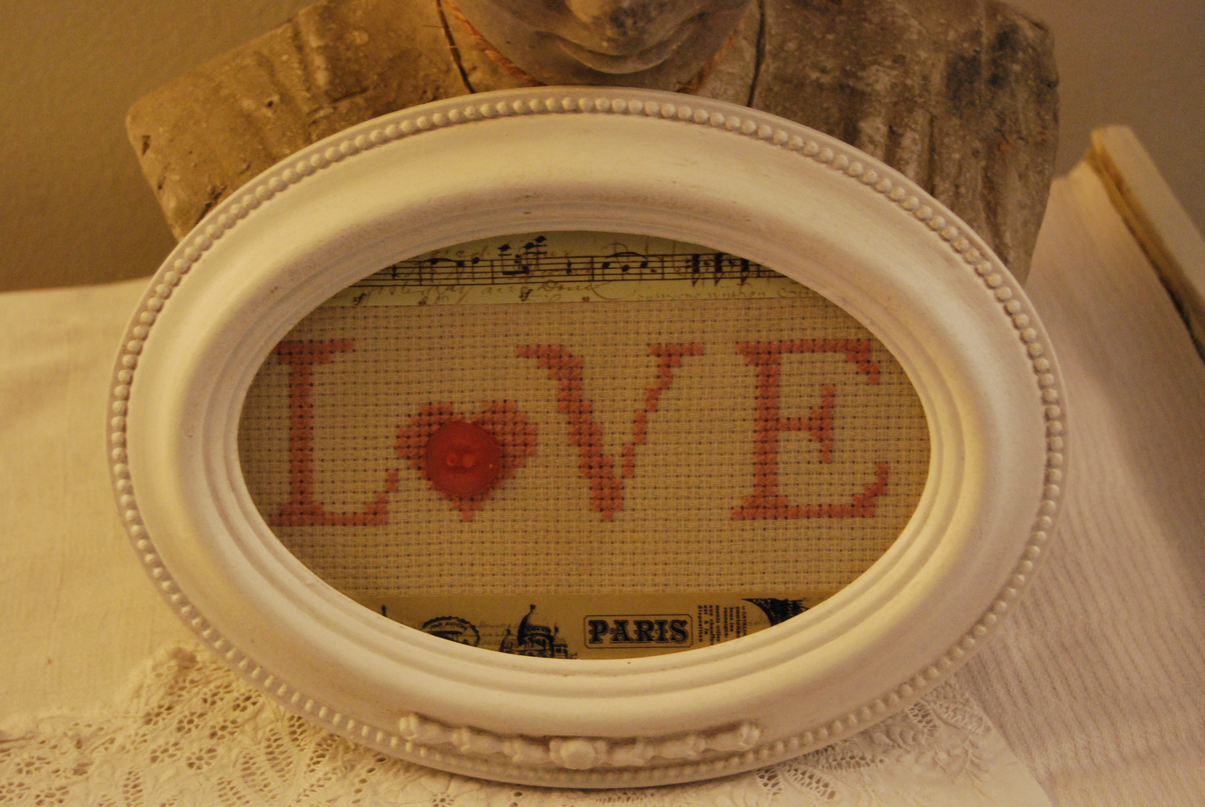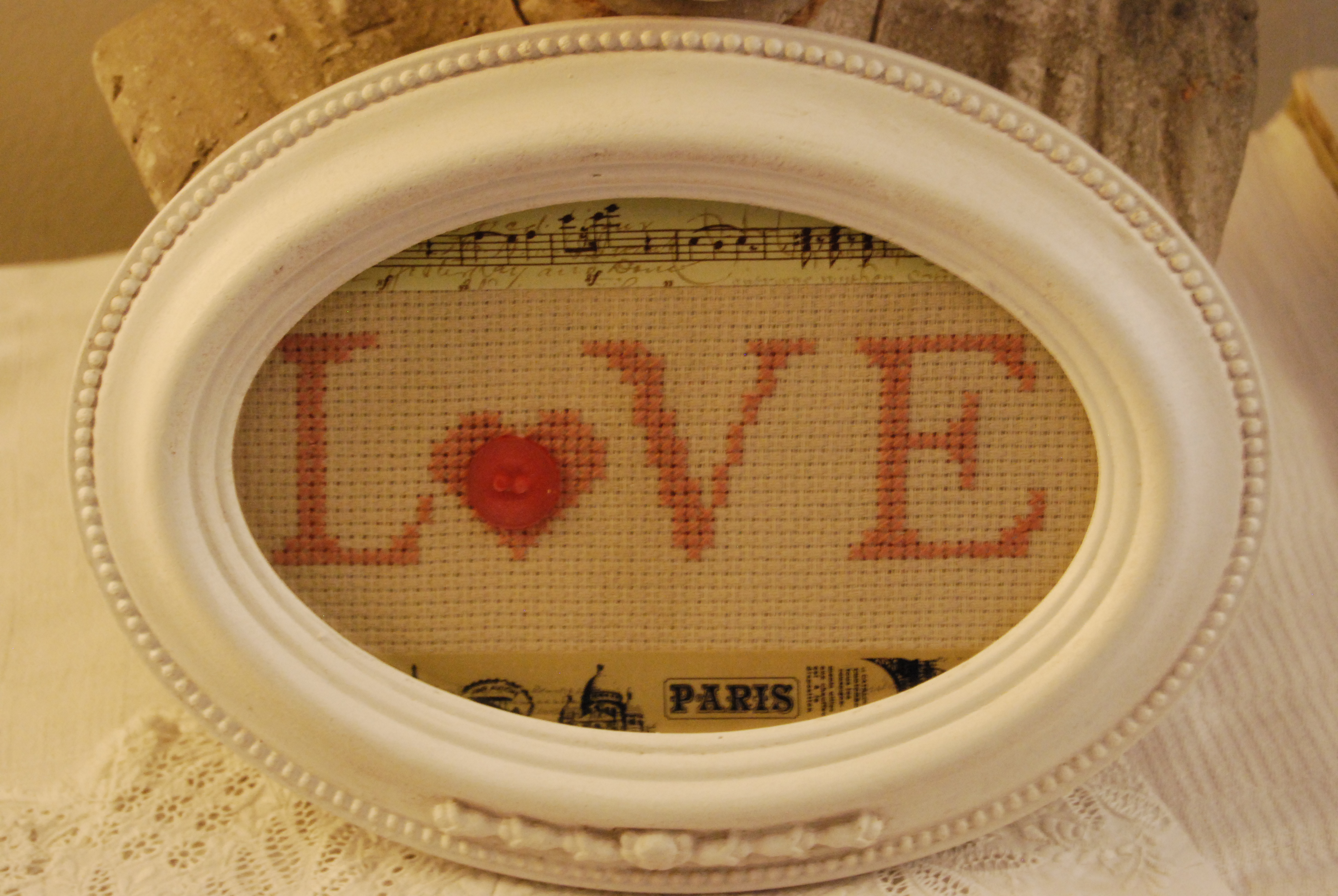 La grille agréable et rapide à broder provient en free du blog « la comtesse et le point de croix » ( http://lacontesselepointdecroix.blogspot.be/). Je l’ai montée dans un cadre MDM romantique acheté lors de notre dernier séjour à Lyon, un peu de masking tape et bien sûr, un bouton rose (THE détail indispensable !) personnalisent l’ensemble :