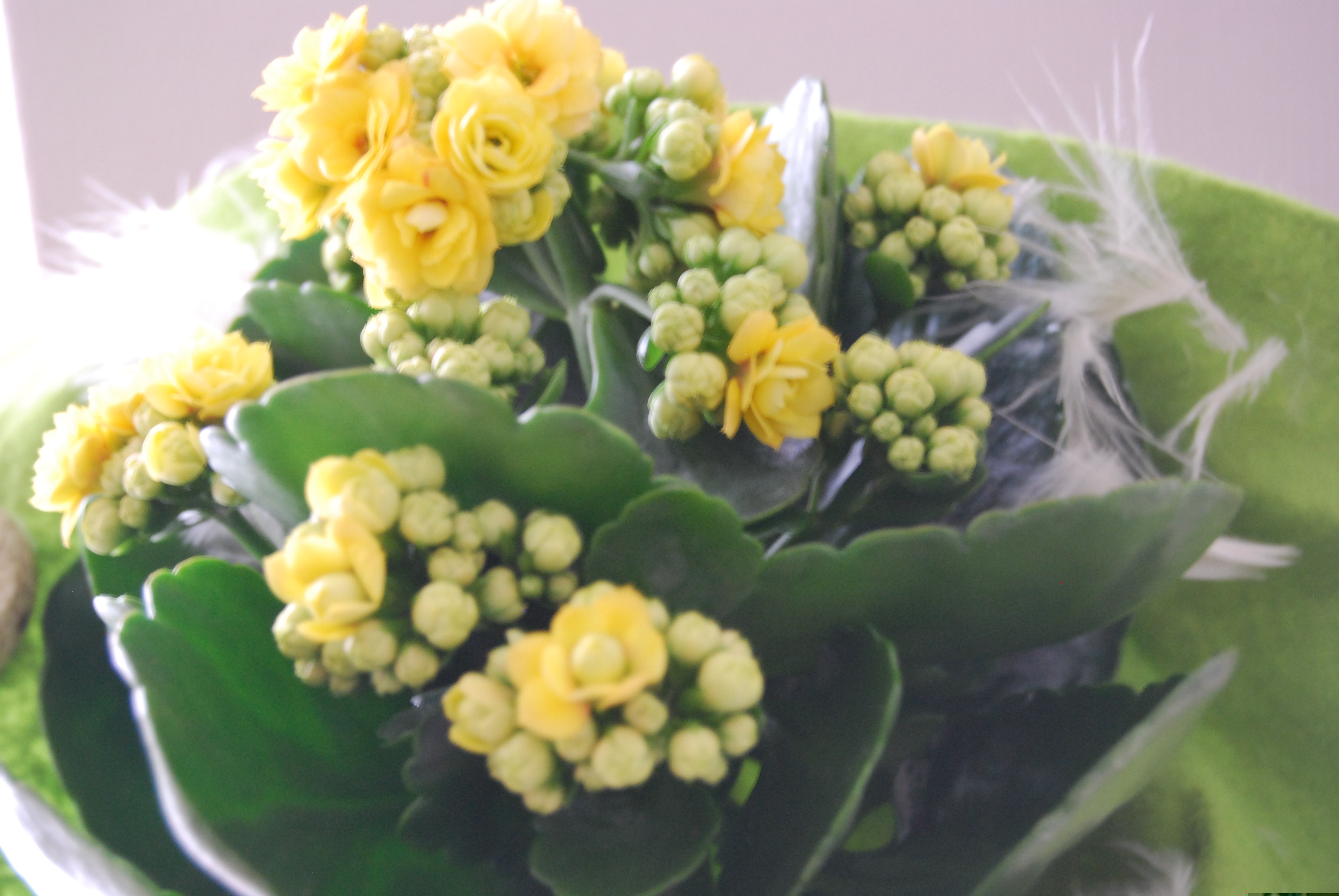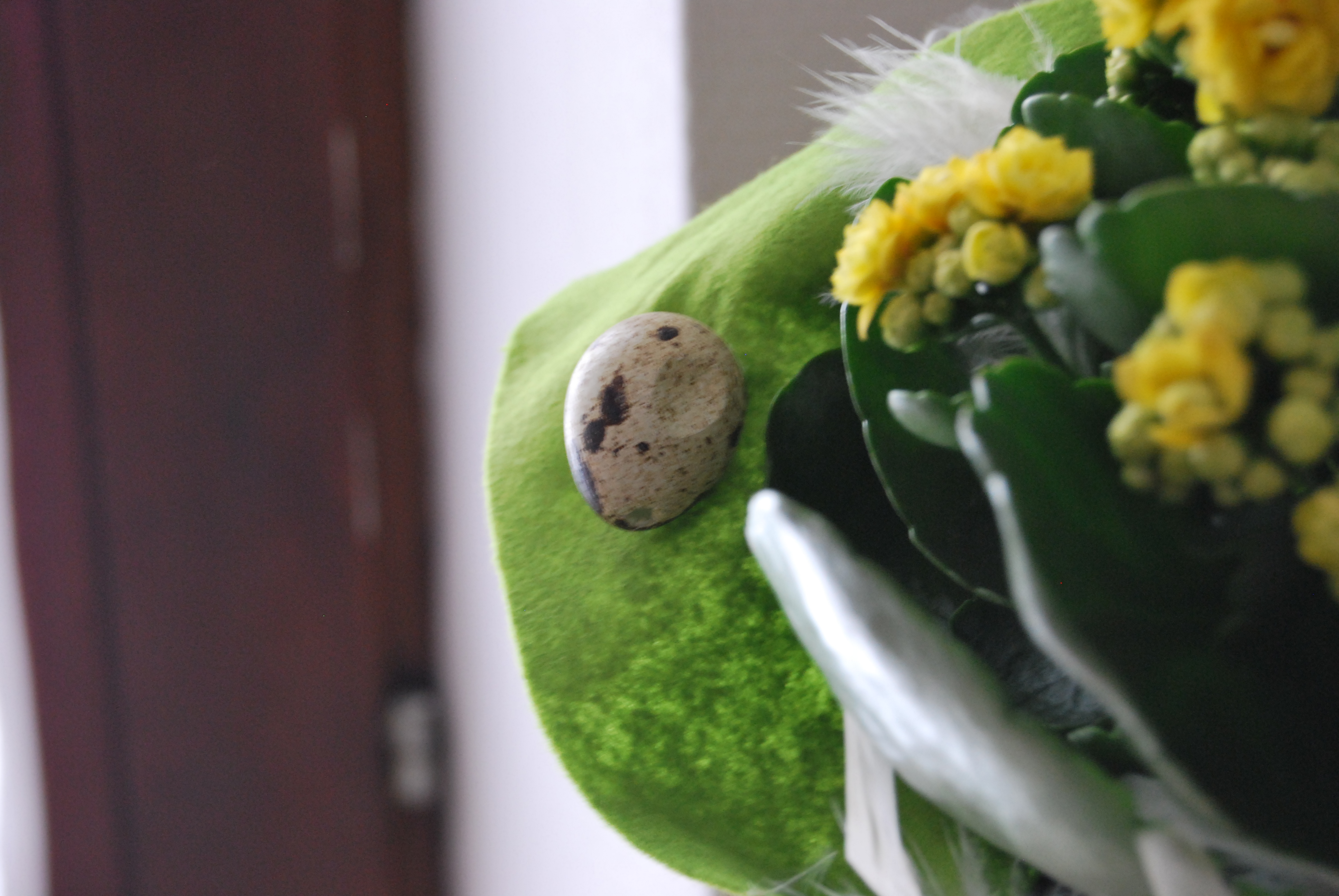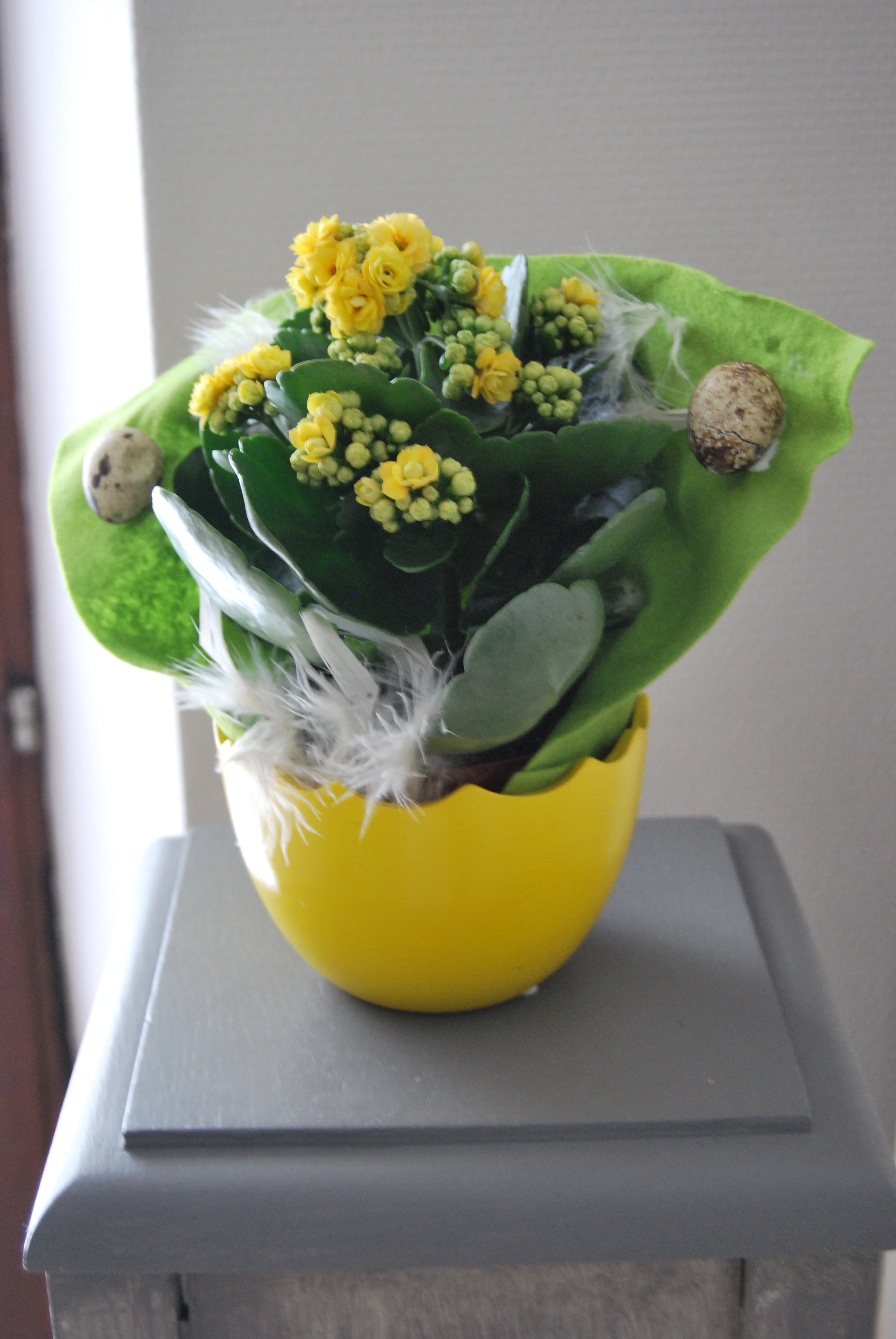 D’abord une petite plante colorée que j’ai agrémentée d’un fond de feutrine, d’oeufs de caille et de quelques plumes et installée sur une sellette patinée en gris l’an dernier.
