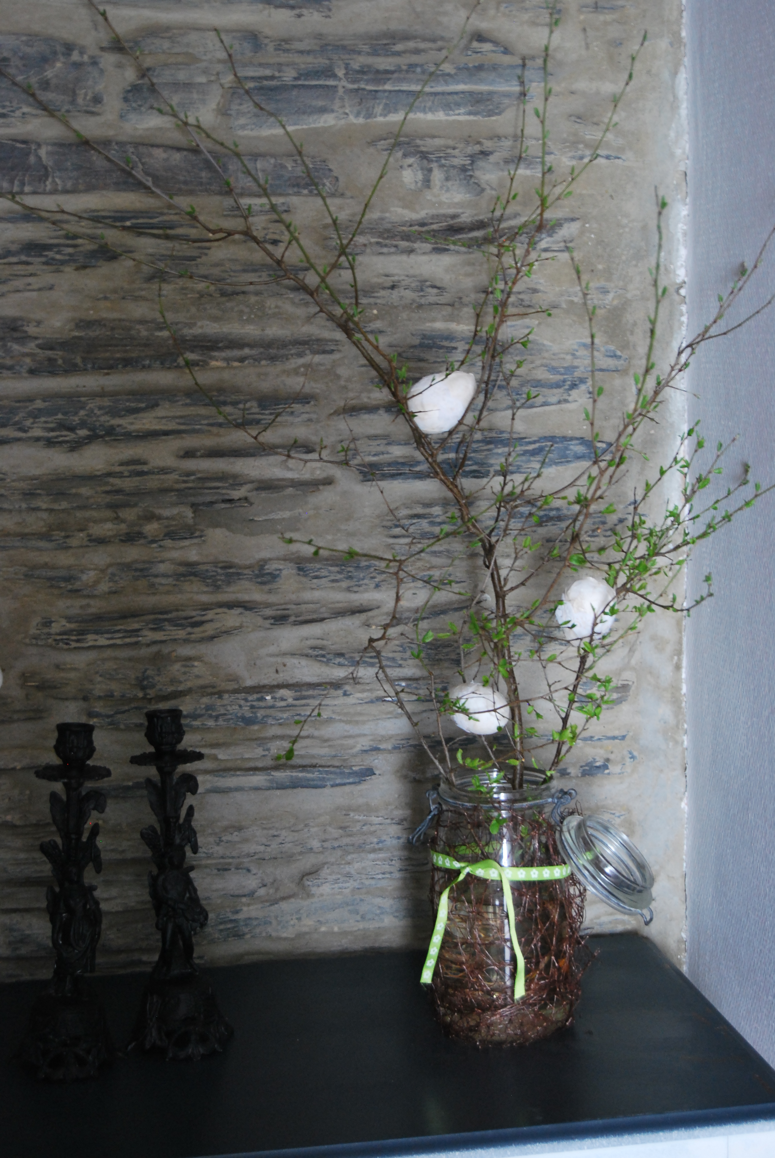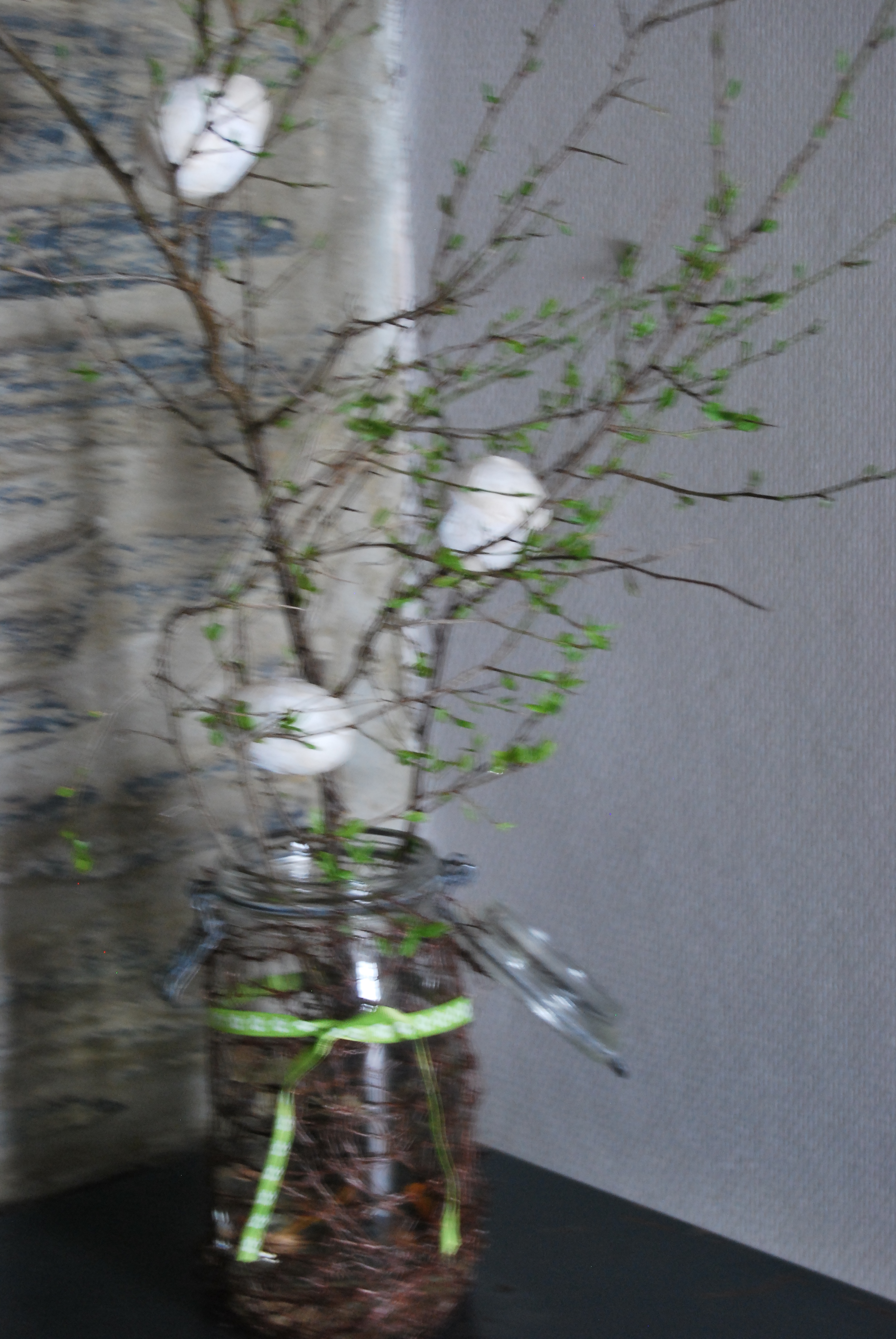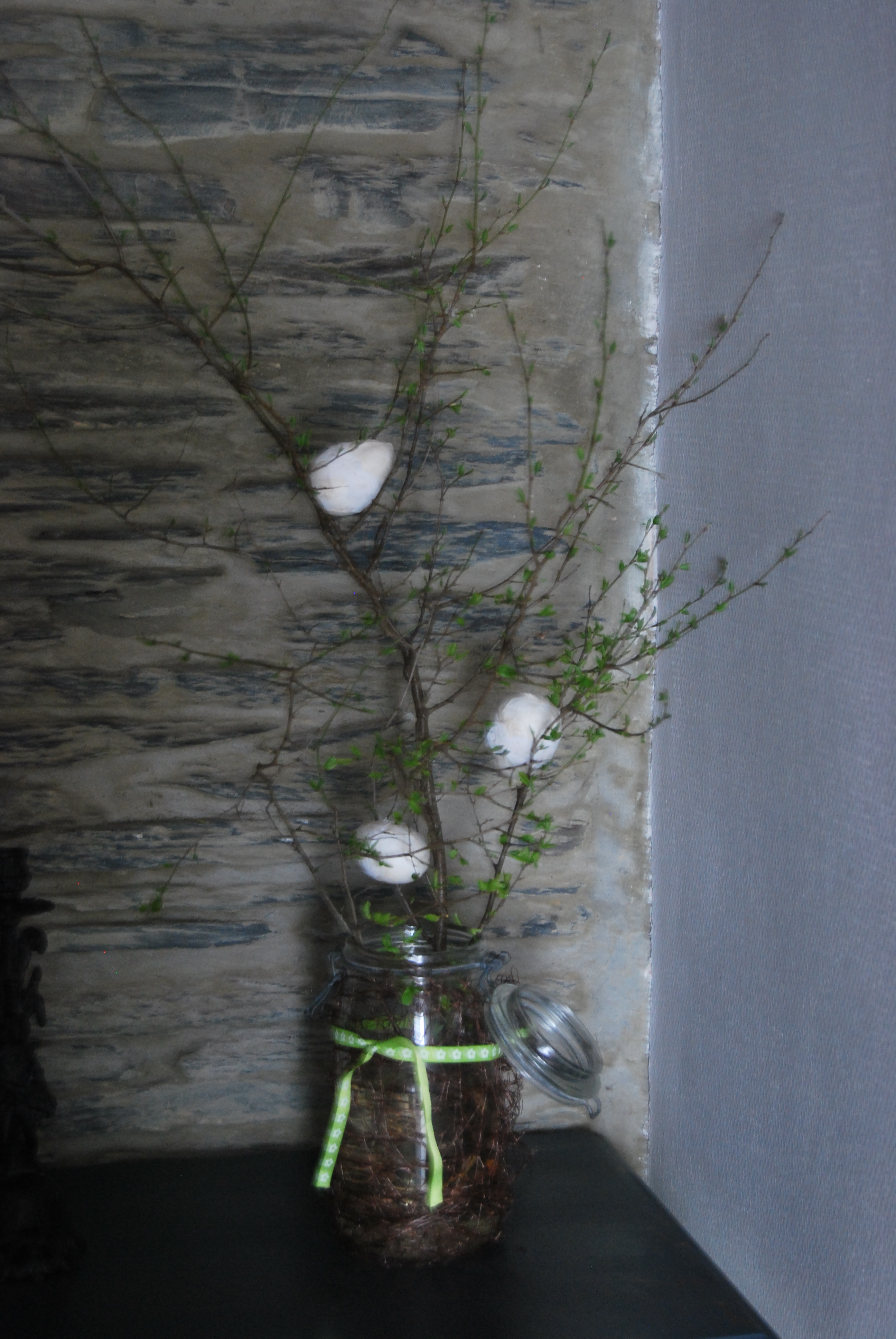 Et une branche du jardin pour une touche rustique sur laquelle sont posés 3 oeufs en polystyrène customisés le week end dernier.