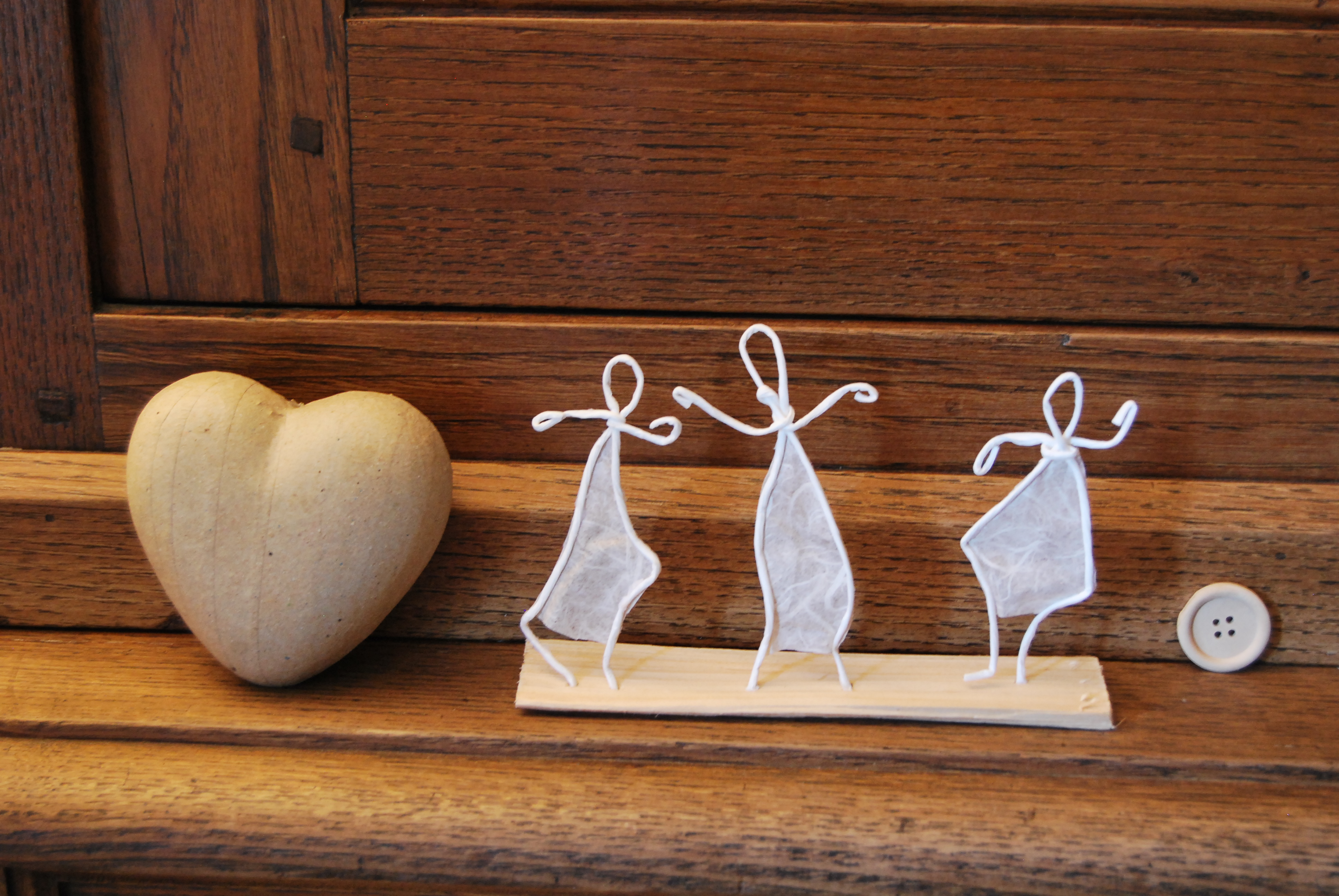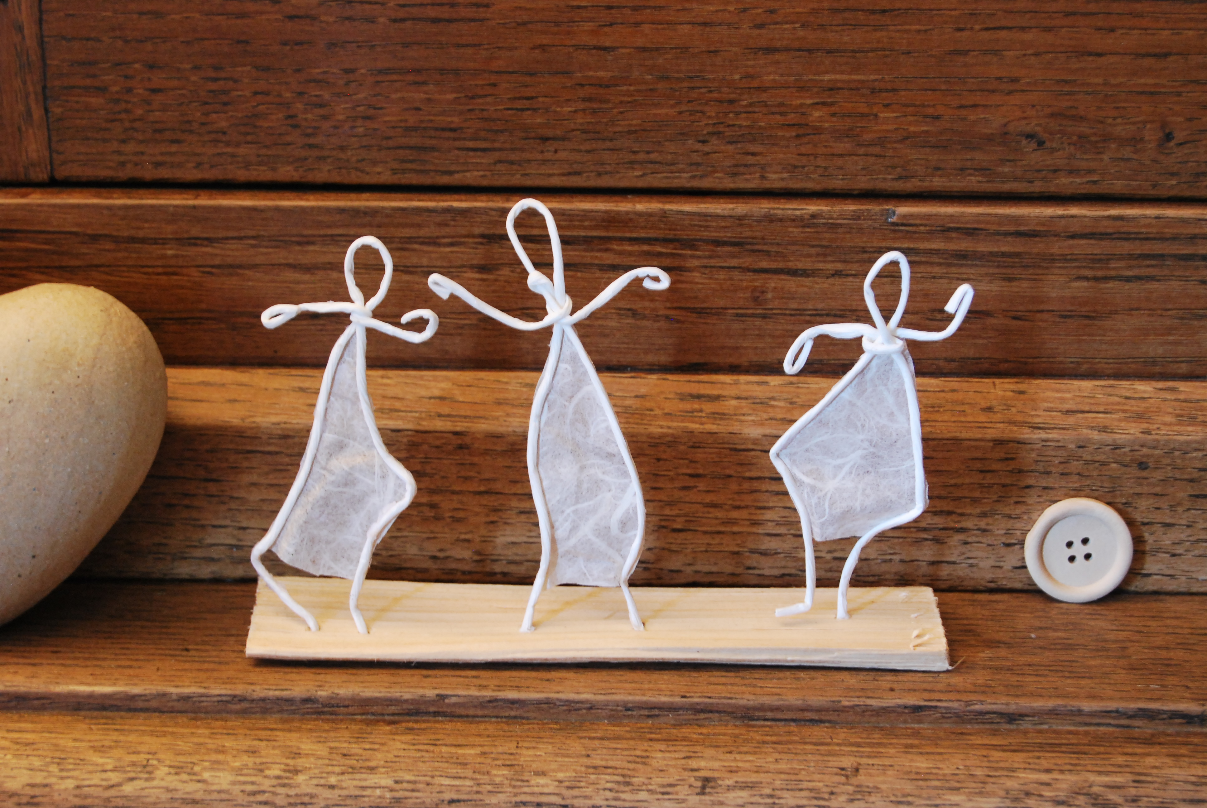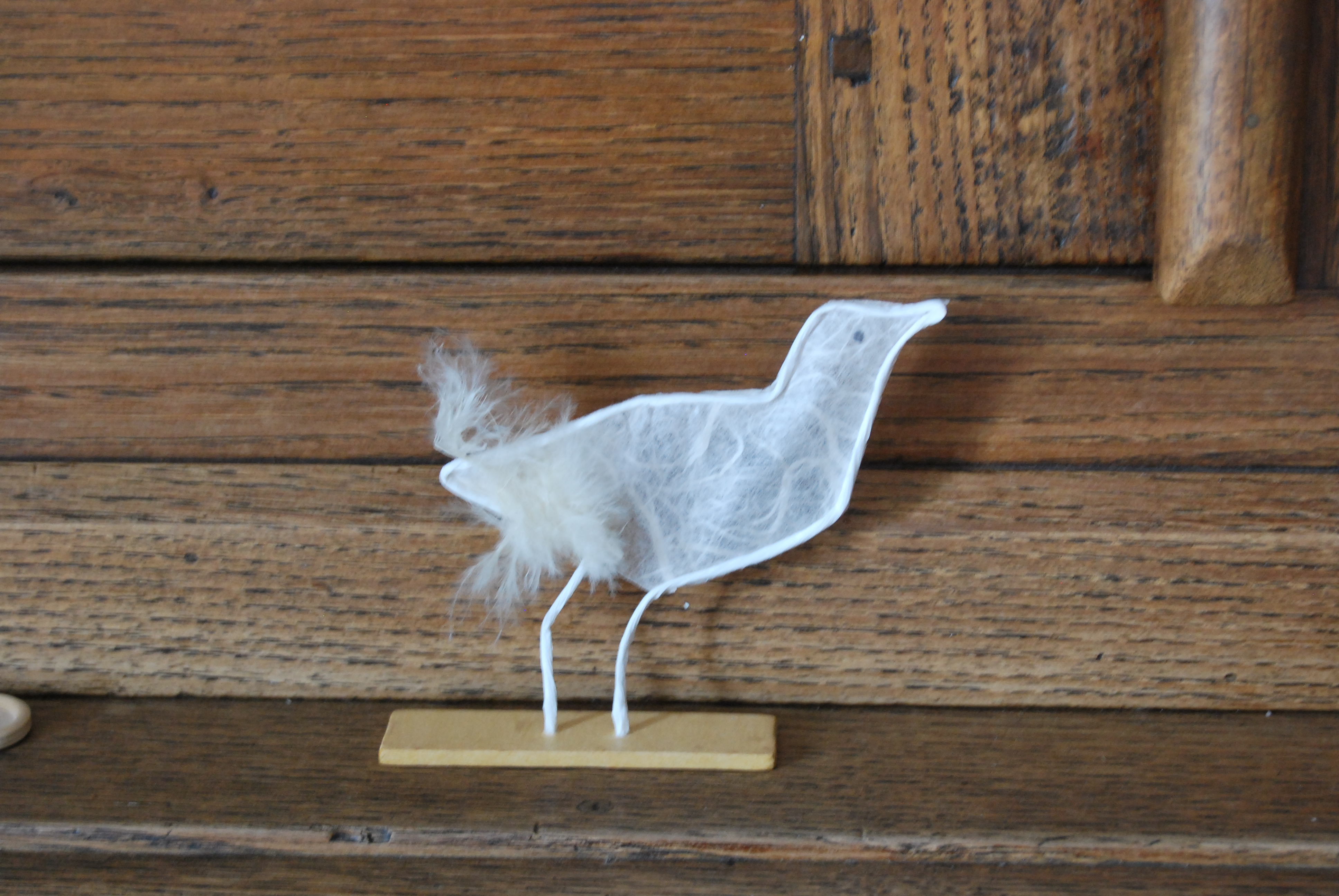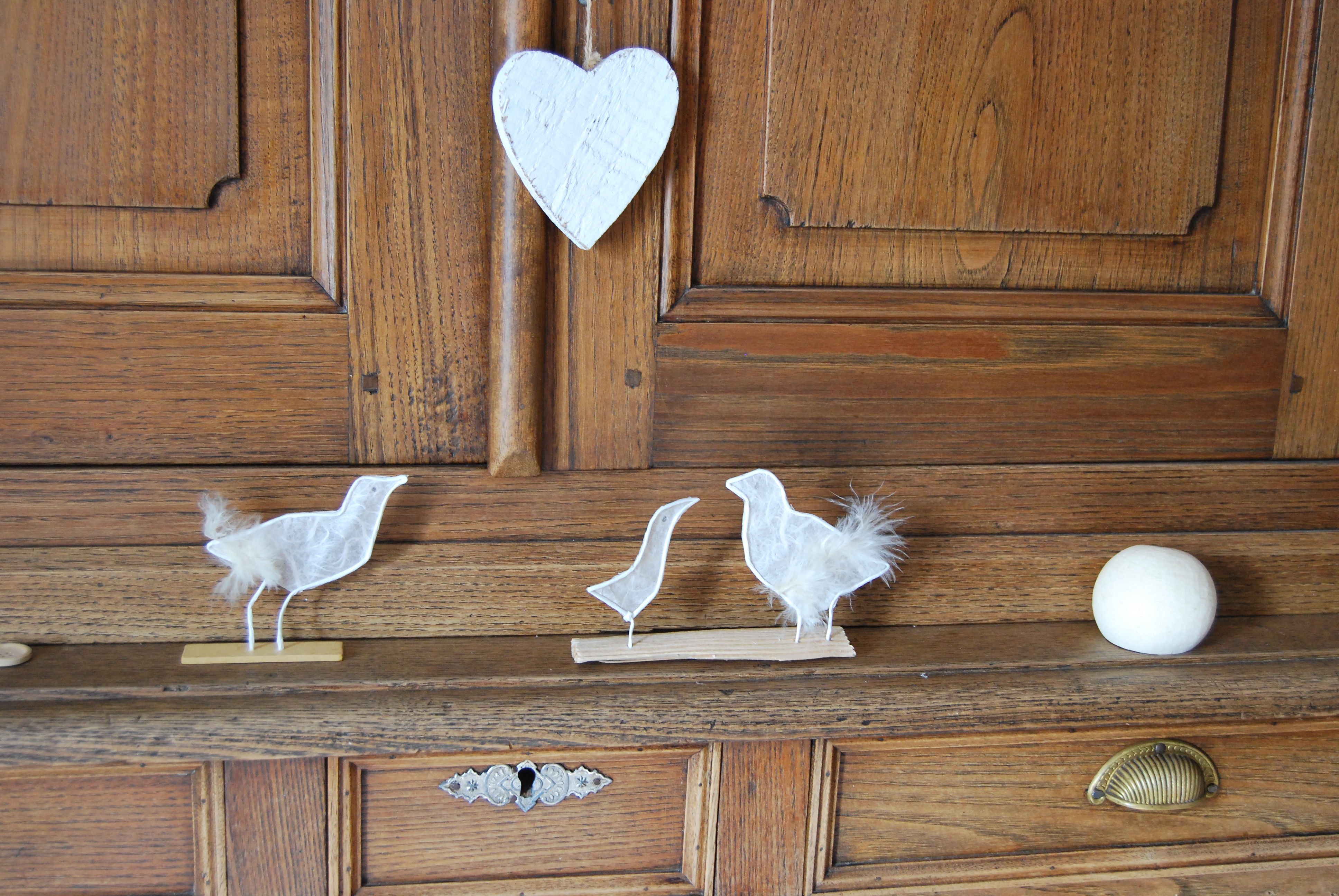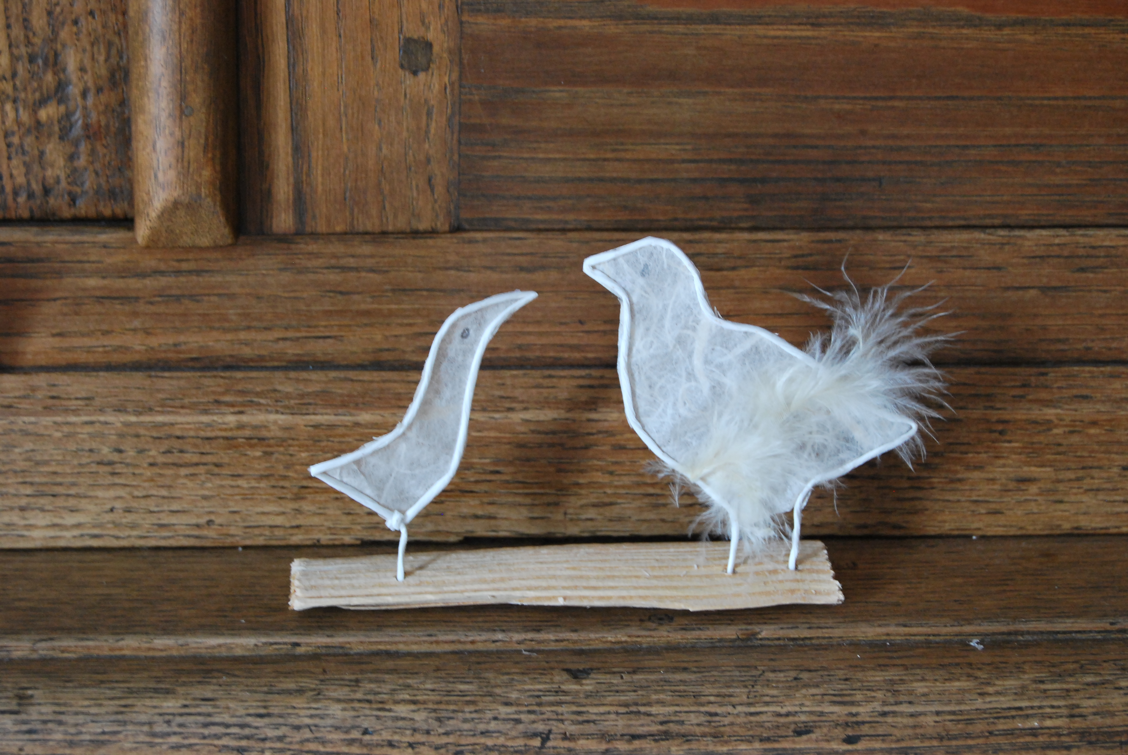 J’ai ajouté quelques plumes sur les oiseaux et trouvé parmi mes petits bois « allume-feu » le socle qui convenait, eurêka !