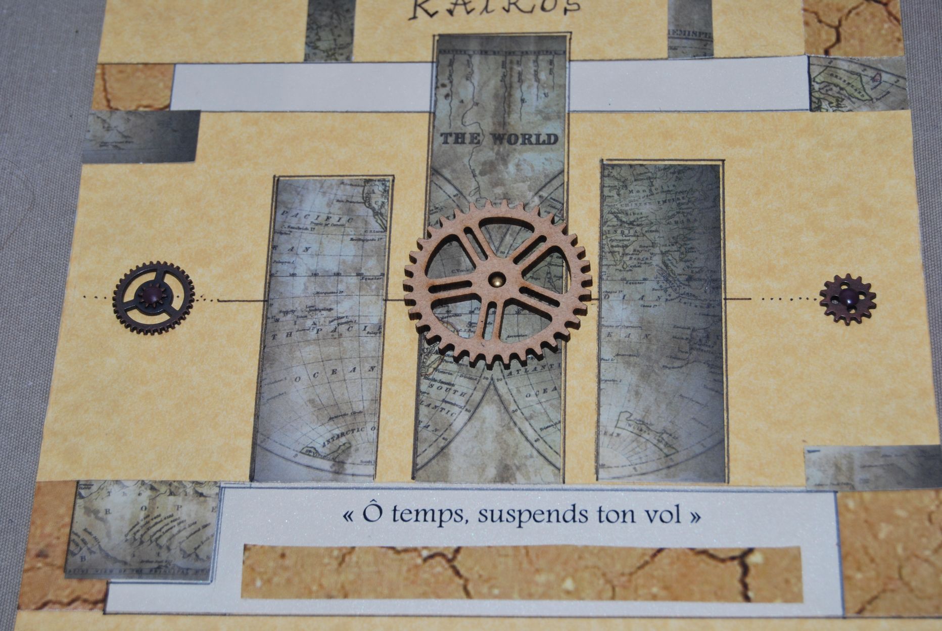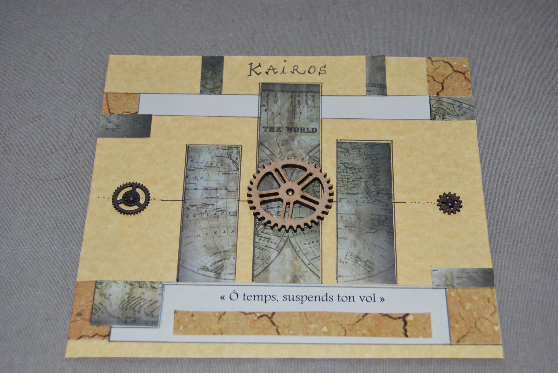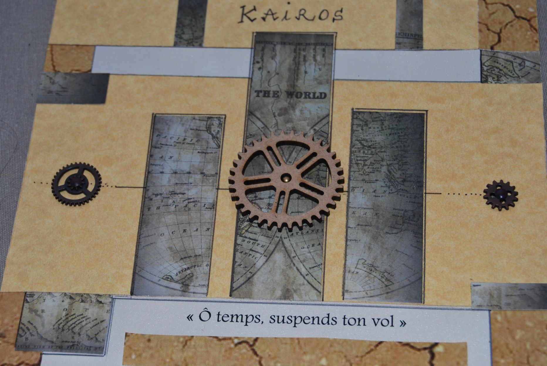 J’ai choisi de représenter Kairos avec une symbolique universelle (la planisphère et les rouages du temps ….) Mais je dois avouer qu’il m’a fallu pas mal de réflexion en préalable pour matérialiser cette notion plutôt philosophique.