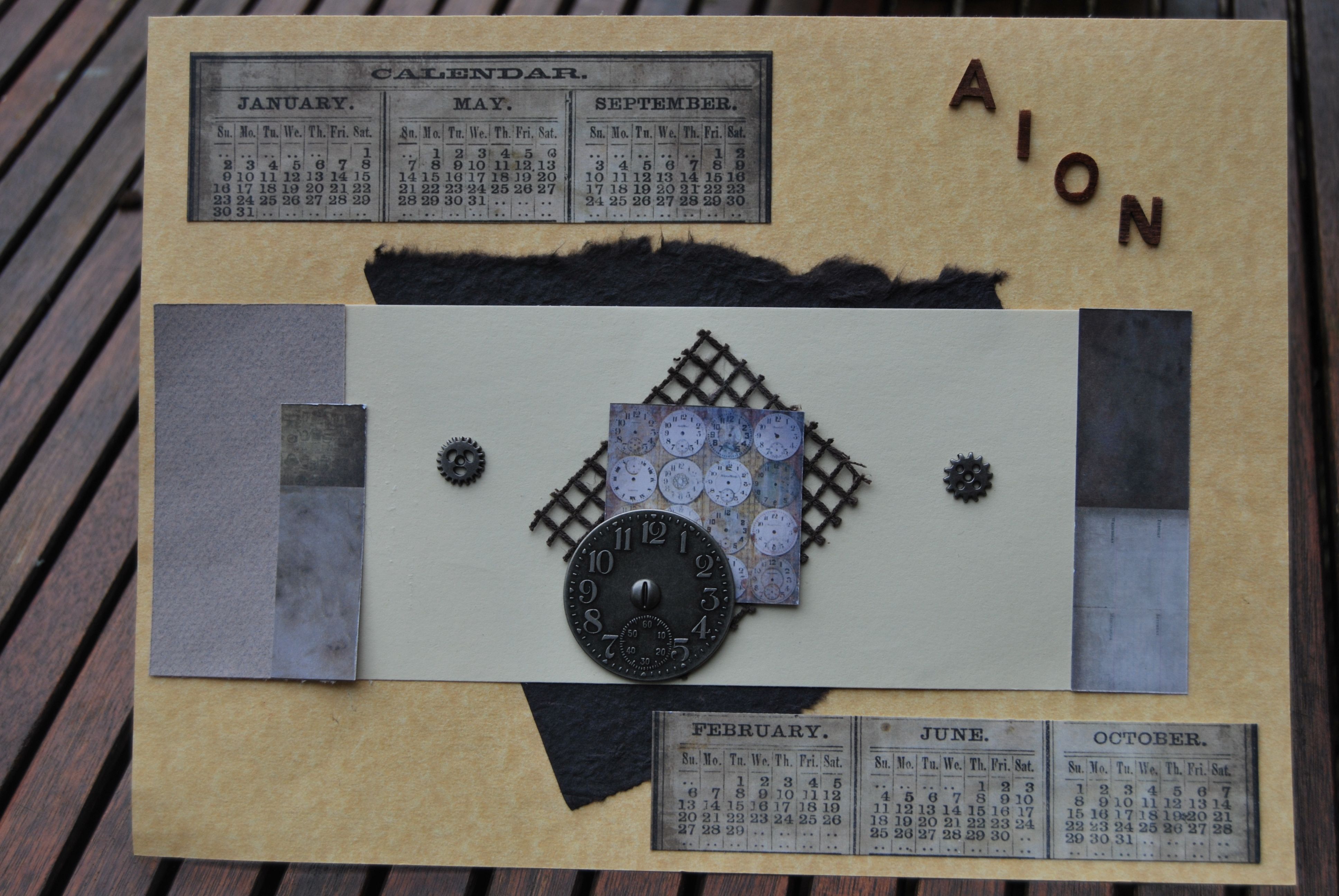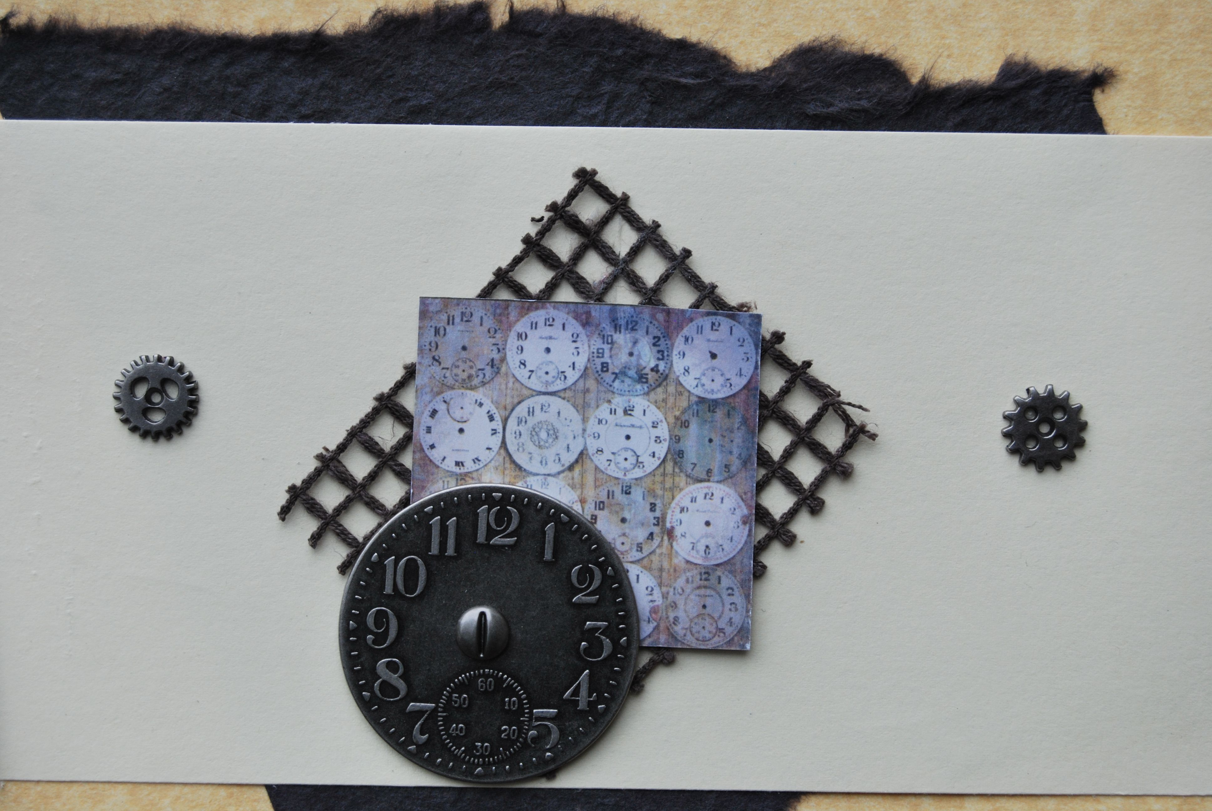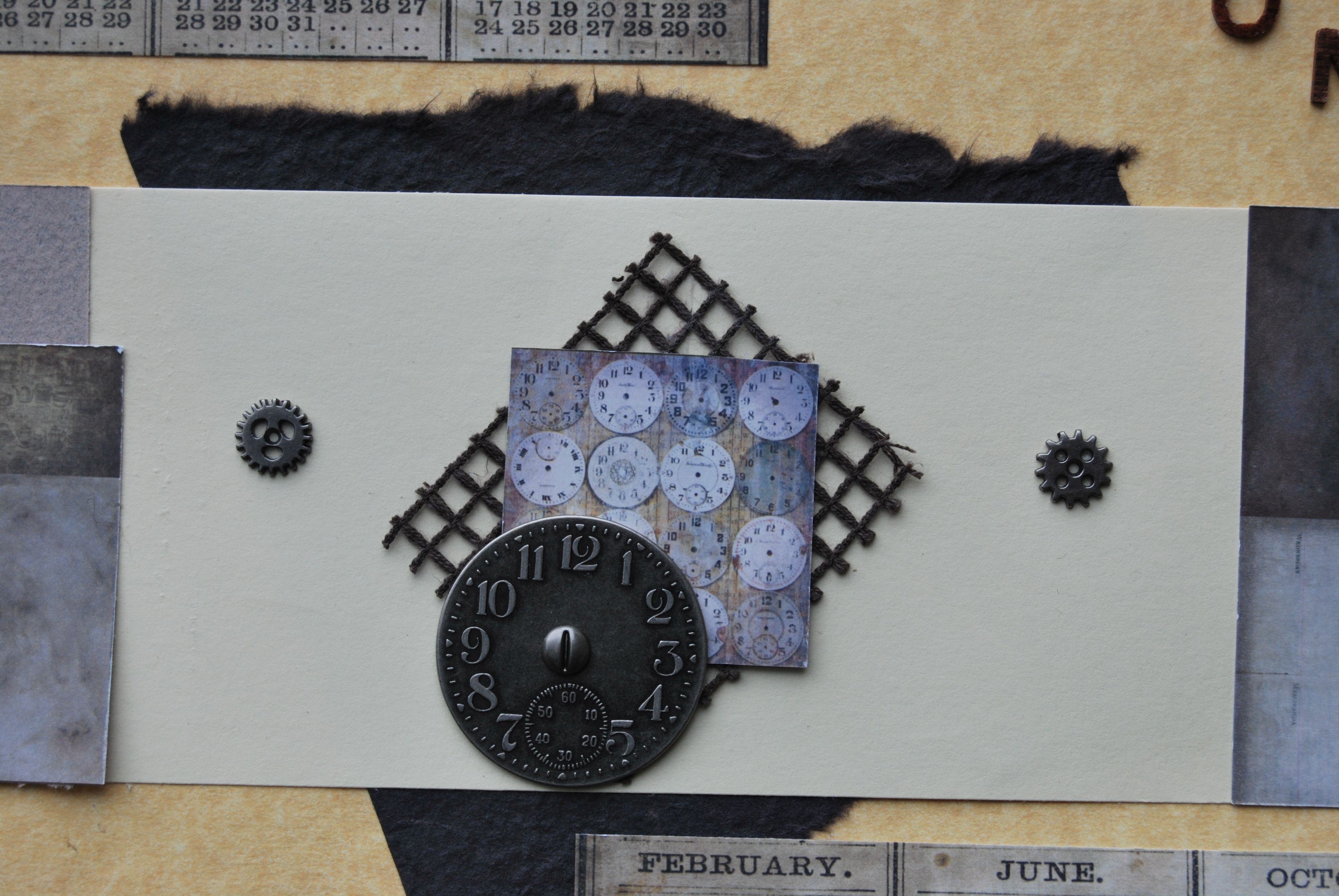 L’horloge, les engrenages et les papiers hors fond sont toujours de Tim Holtz, une magnifique collection reçue en cadeau à Noël et dont je ne me lasse pas !!! Avis à mes généreux donateurs … je suis devenue fan de ce créateur qu’ils m’ont fait découvrir 🙂