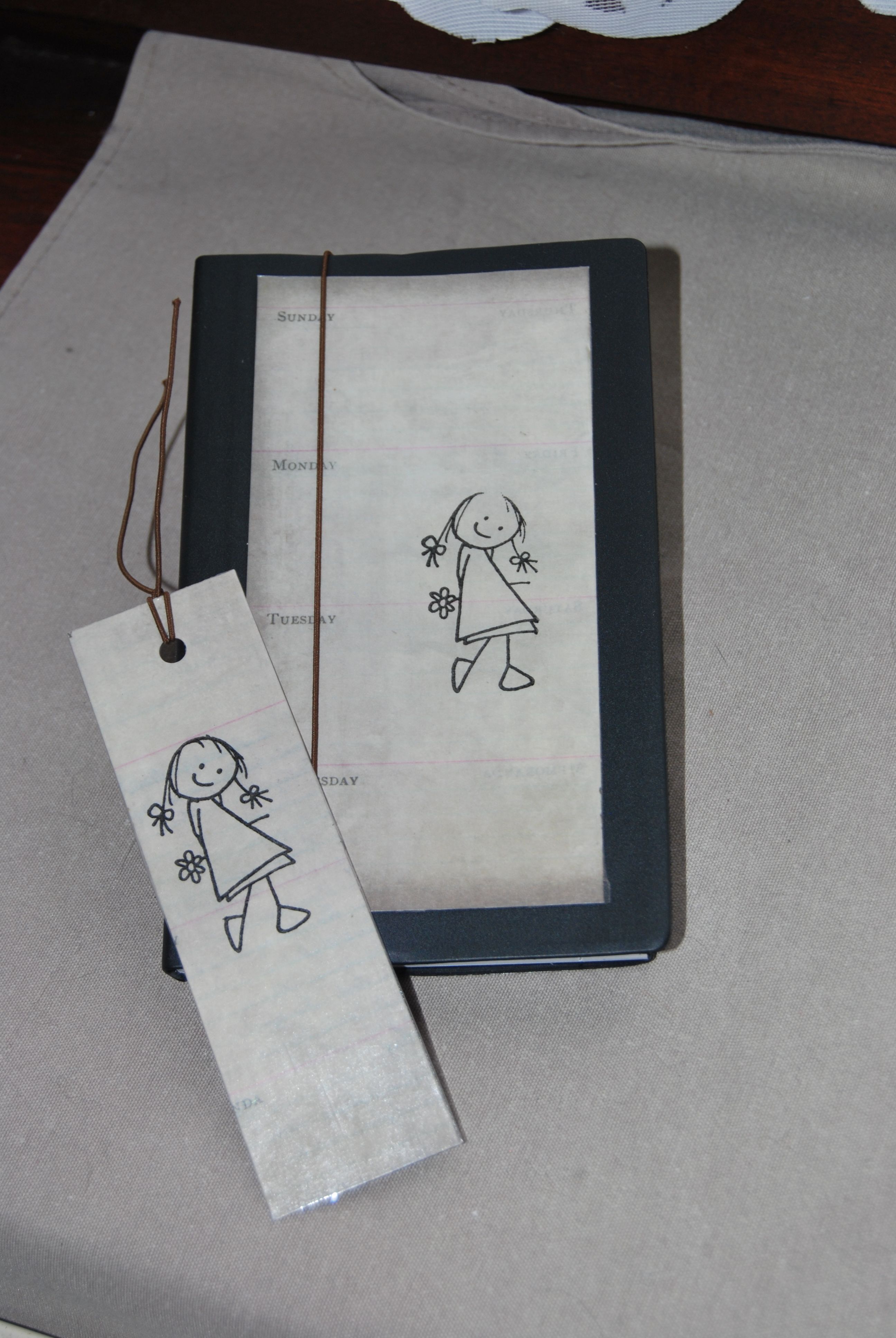 Et dans un tout autre style, bien différent, j’ai customisé de manière très simple, voire naïve, mais qui je pense fait son effet l’agenda lambda de ma fille. Du papier Tim Holtz (encore !!), un tampon Artemio (là aussi, j’apprécie beaucoup cette marque belge !) et un cordon élastique pour bien maintenir la couverture plastique assez légère et hop, voilà le résultat en deux temps trois mouvements … Dans la foulée, j’ai même réalisé le marque page assorti !!