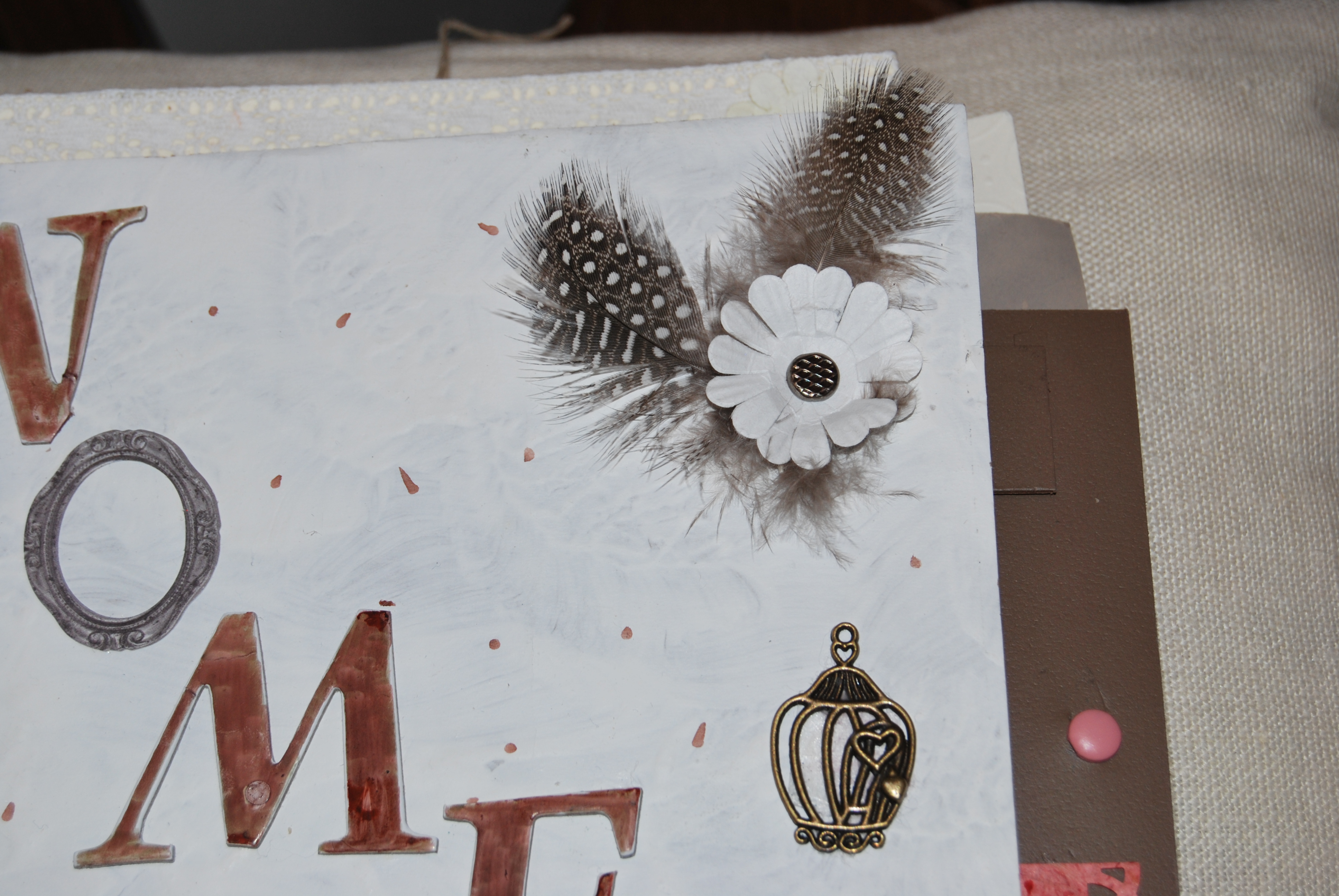 Un zeste de plumes, un brad Artemio (je crois !), une fleur de la Fourmi créative, des lettres Artemio coloriées sommairement en brun et un petit embellissement en métal trouvée l’an dernier à Creativa complètent l’ensemble.