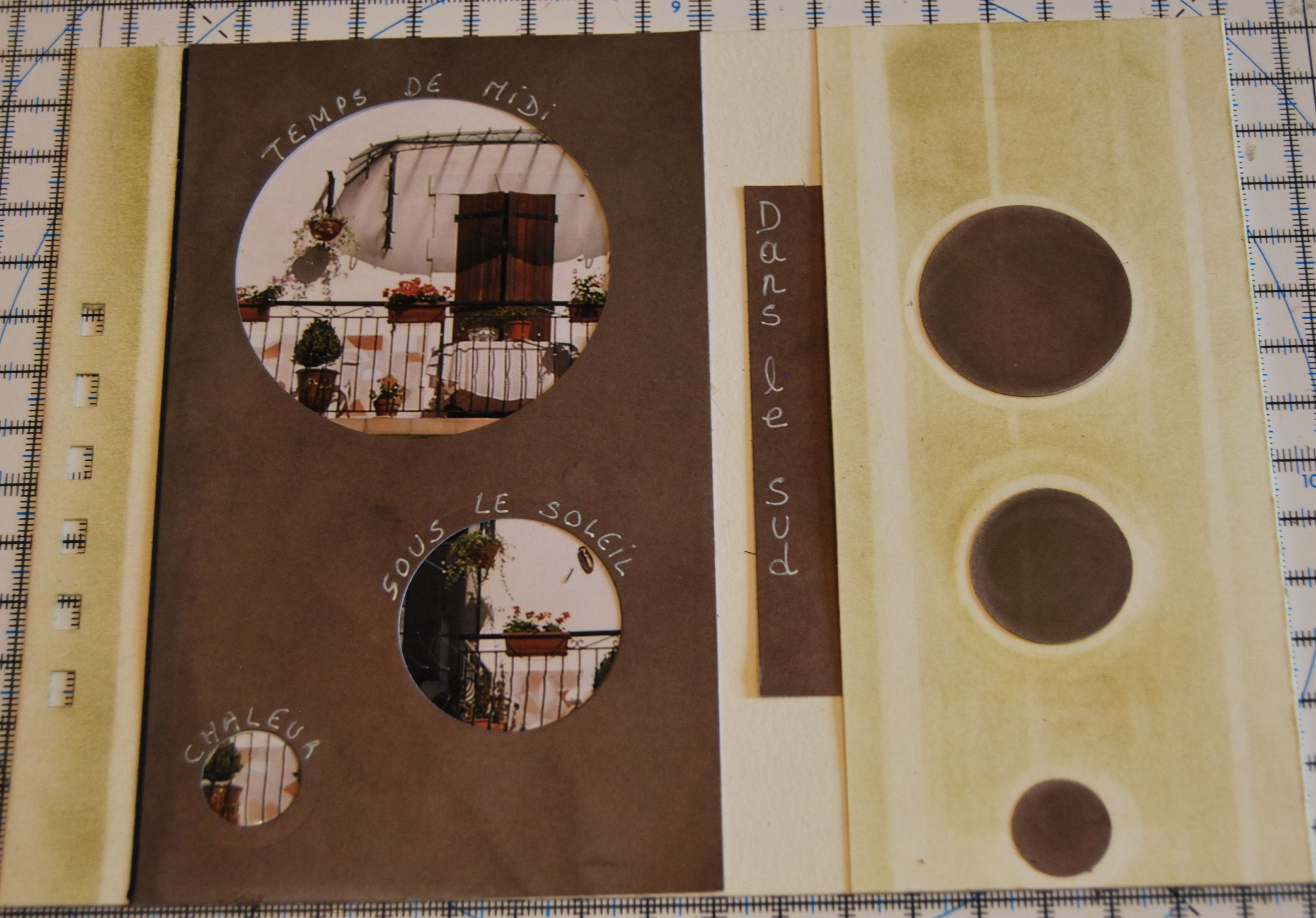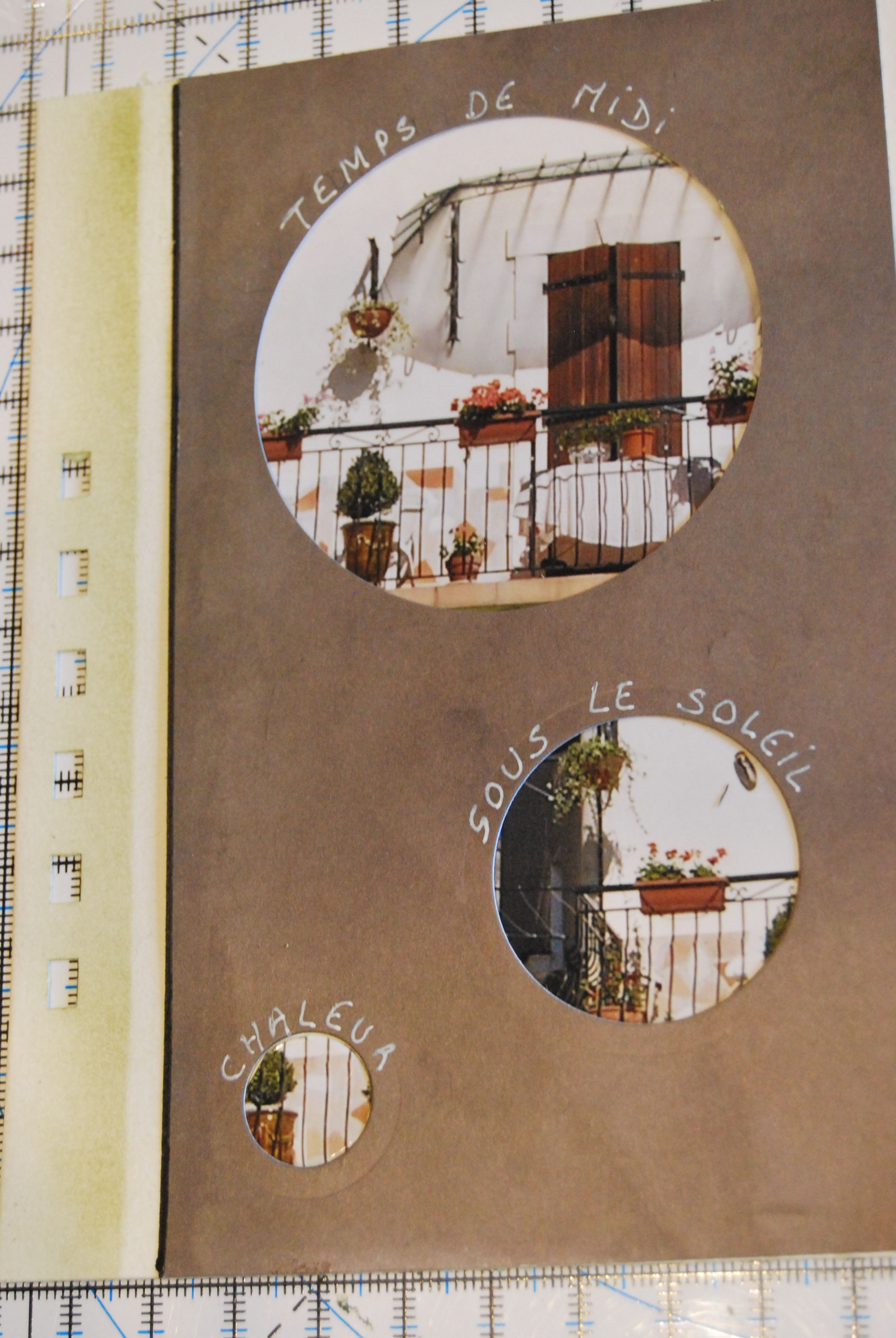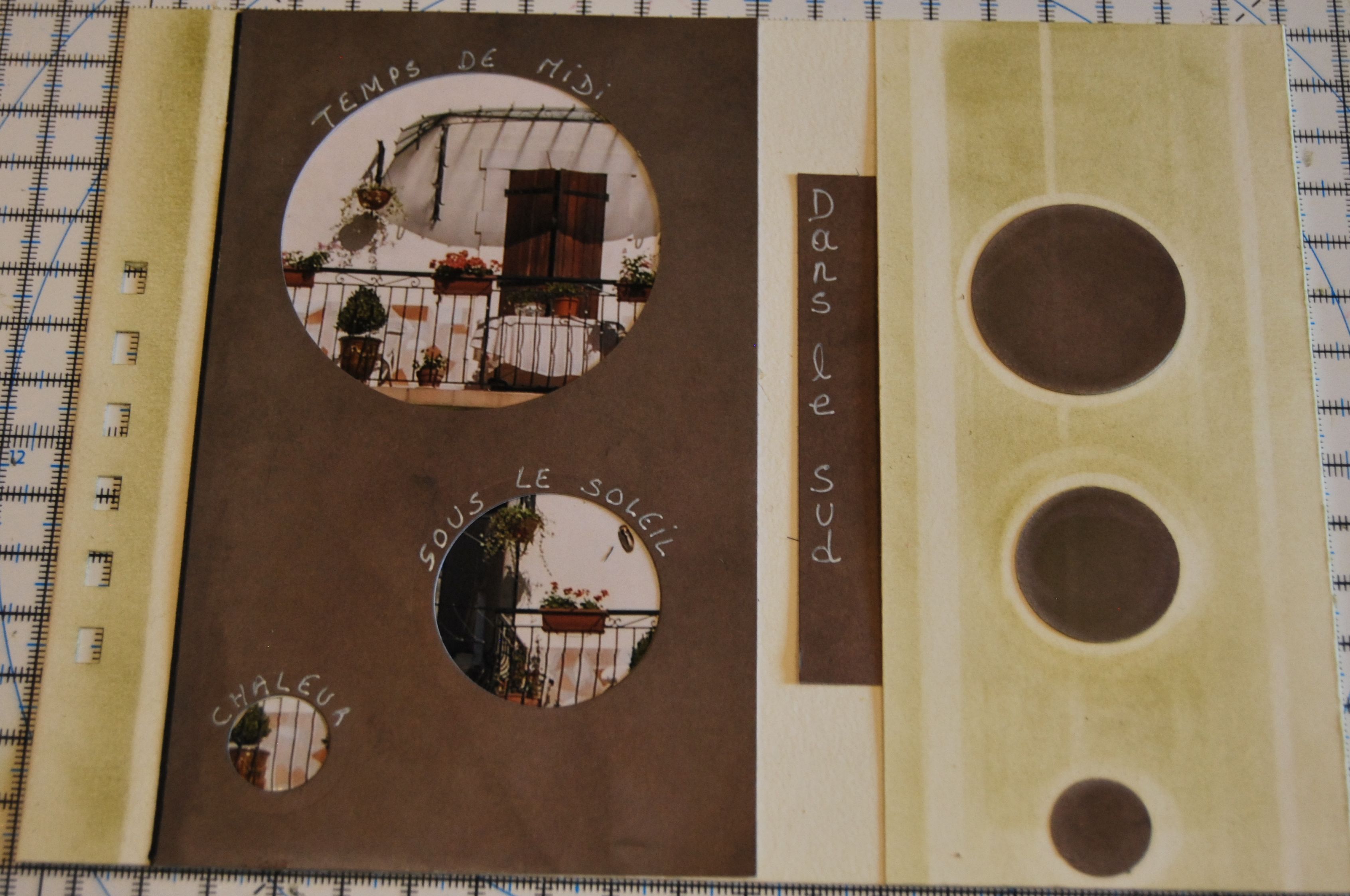 Les ronds ont été prédécoupés à la Sizzix dans du papier épais brun. Et contrairement à ce que l’effet bleuté pourrait faire penser, je n’ai pas utilisé le crayon bleu pour définir les découpes de mes photos !! C’est juste un effet dû à la lumière artificielle.