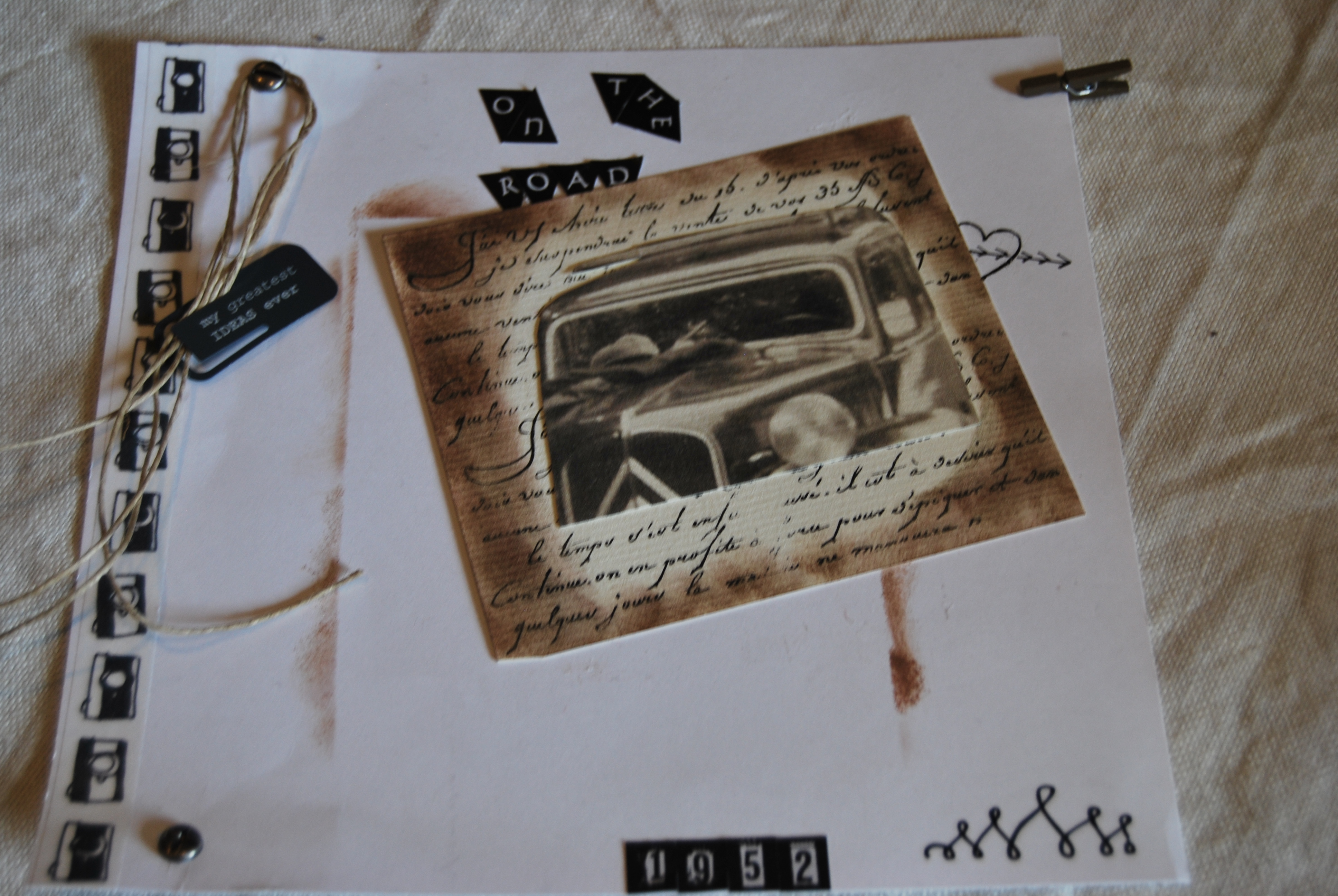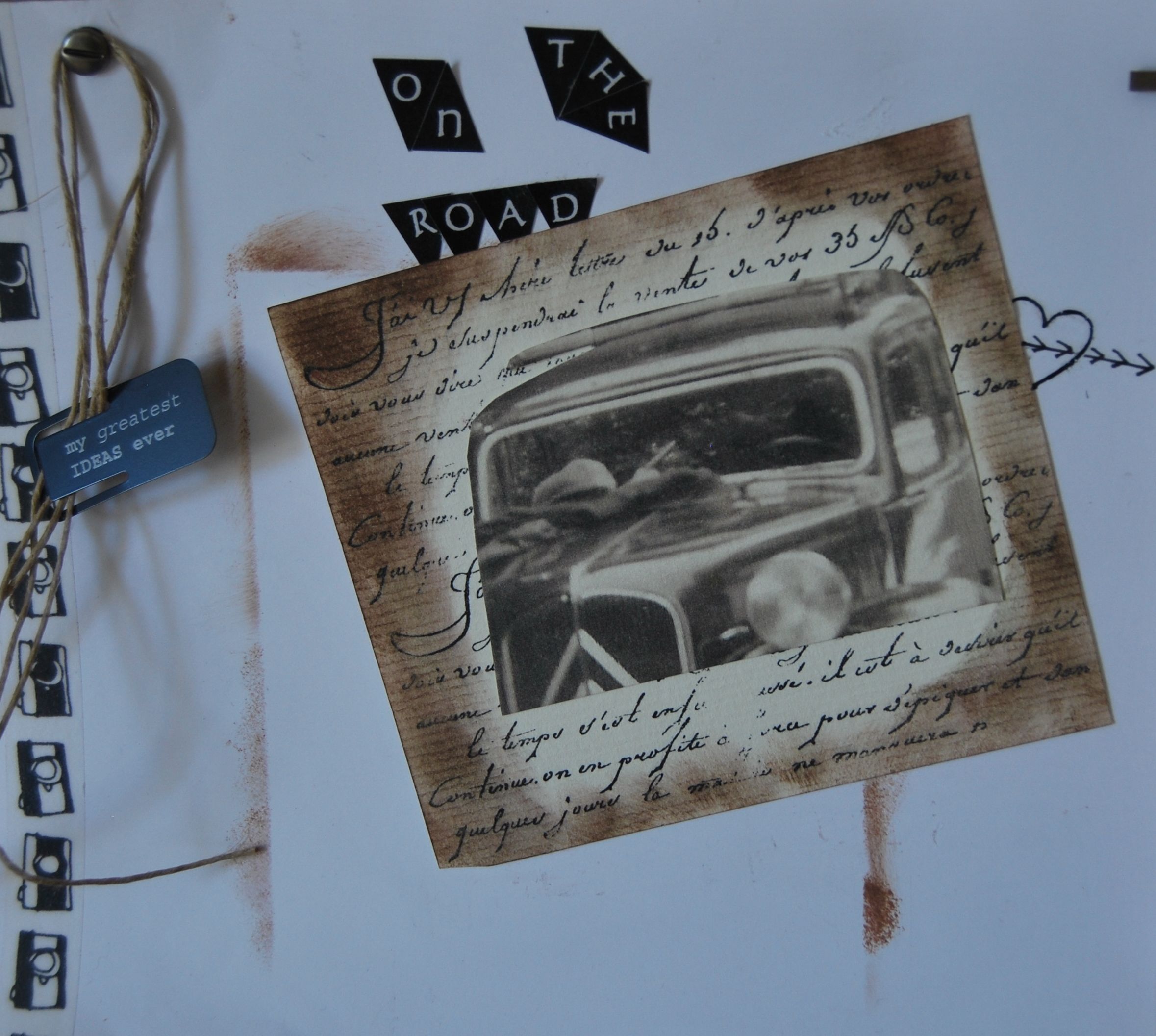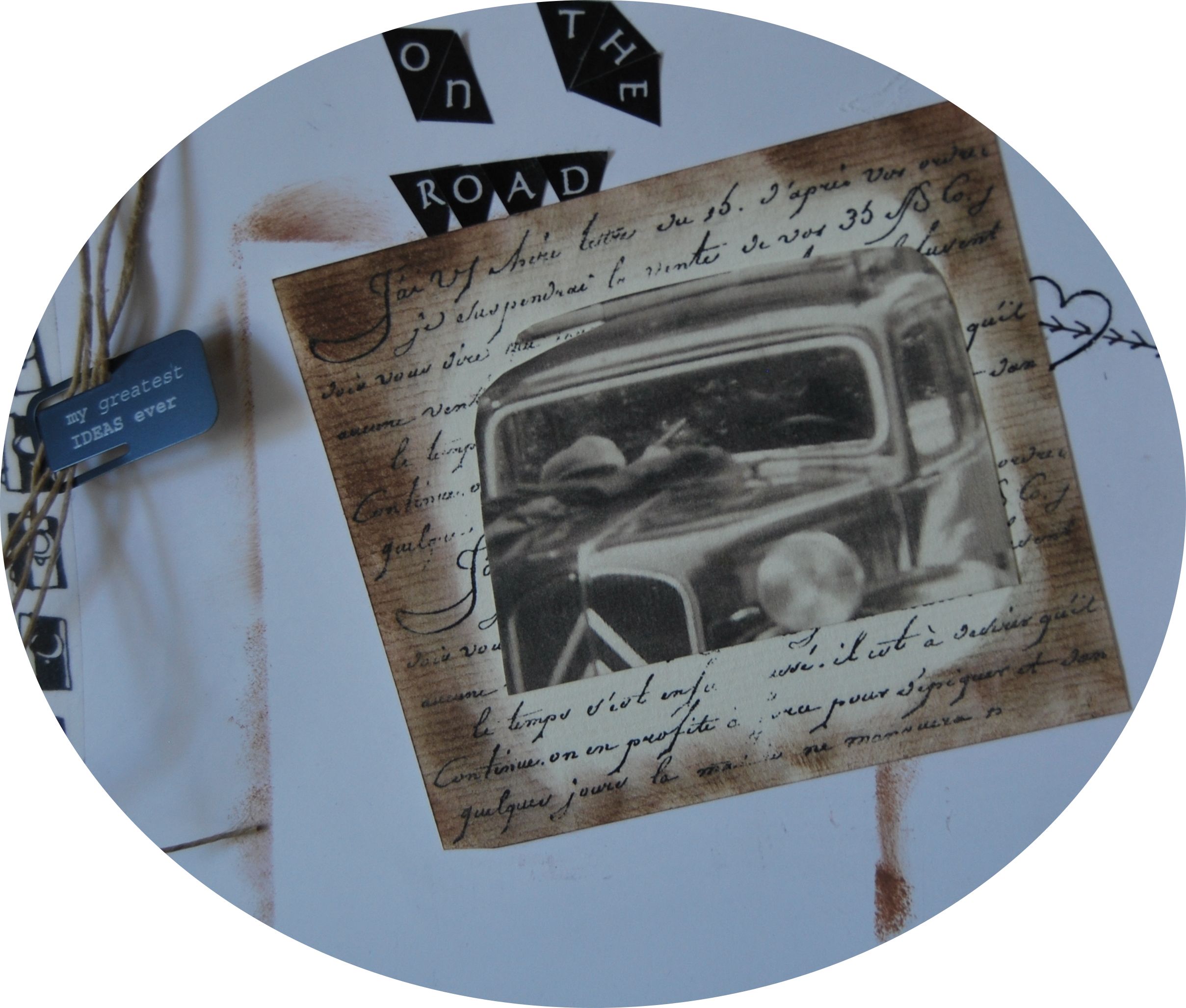 On the road … une p’tite photo de la traction avant Citroën de mon beau-père, qui date de plus de 50 ans … Je l’imagine filant à toute allure sur les routes de nos campagnes … Je l’ai détourée pour la mettre en valeur sur la page, toujours en 20 sur 20 cms.