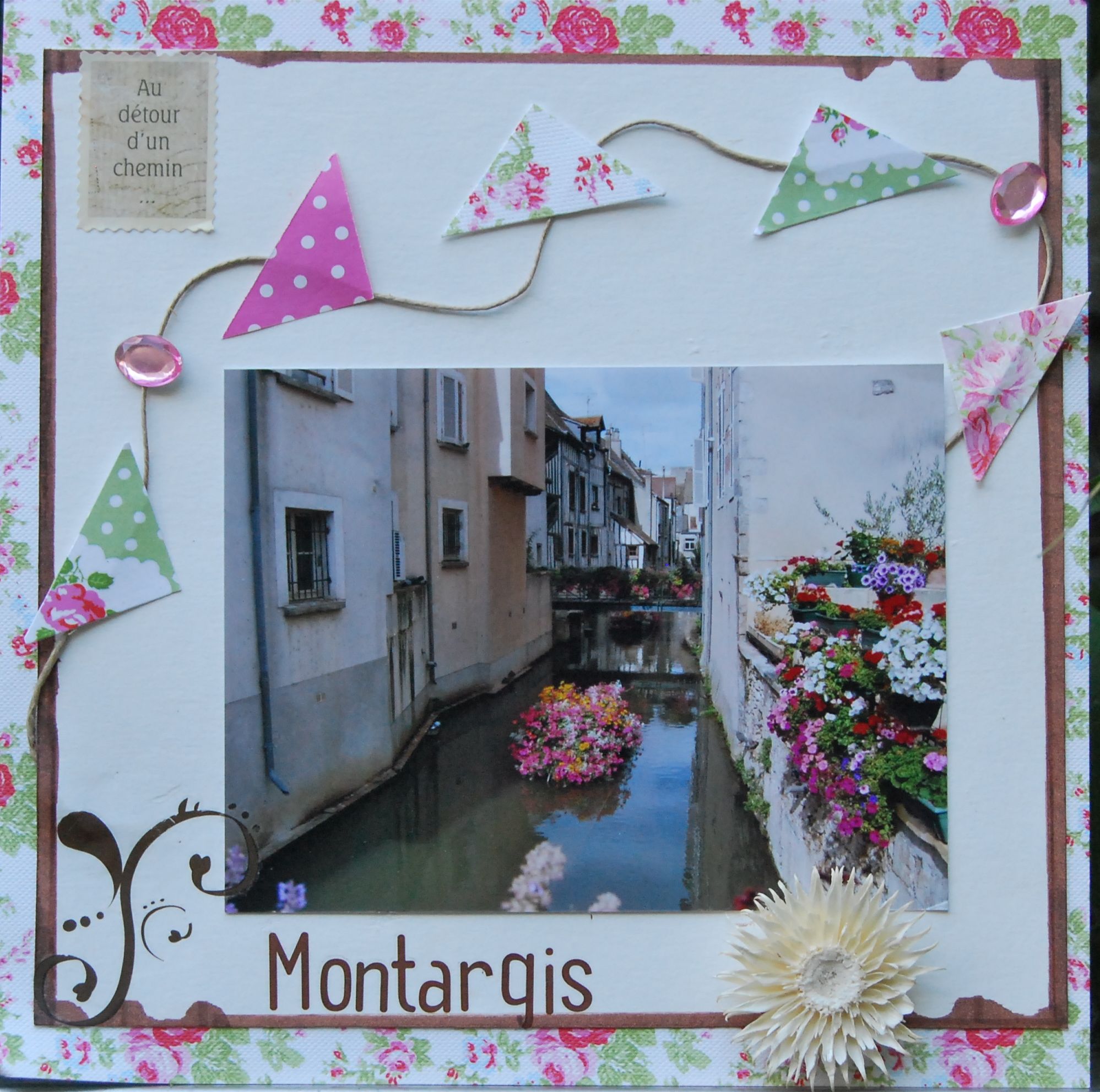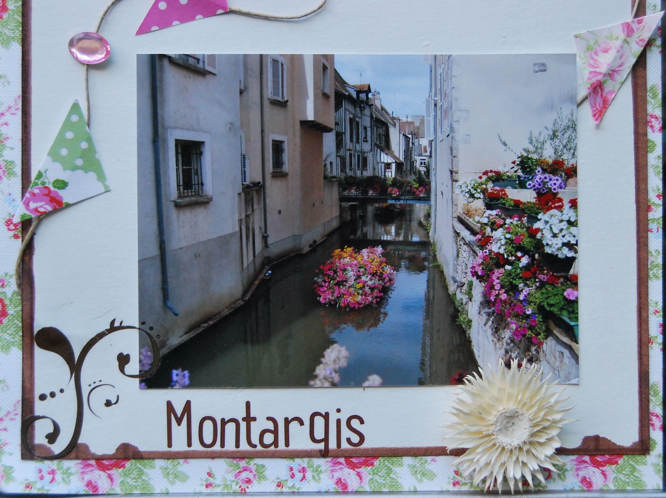 En 2013, il nous a pris la fantaisie de rejoindre la N 7 en-dessous de Paris pour rejoindre Lyon … Sur le trajet, nous nous sommes arrêtés par hasard à Montargis, petite ville provinciale. Ce lieu nous a vraiment séduit par son charme, sa rivière fleurie et sa convivialité. Le petit café typique le long de ce qui nous a semblé être la grand-rue nous a laissé un agréable souvenir. Il me semblait donc tout à fait approprié de scrapper cette prise de vue en accord avec le thème floral de ma composition de cette après-midi de congé !!