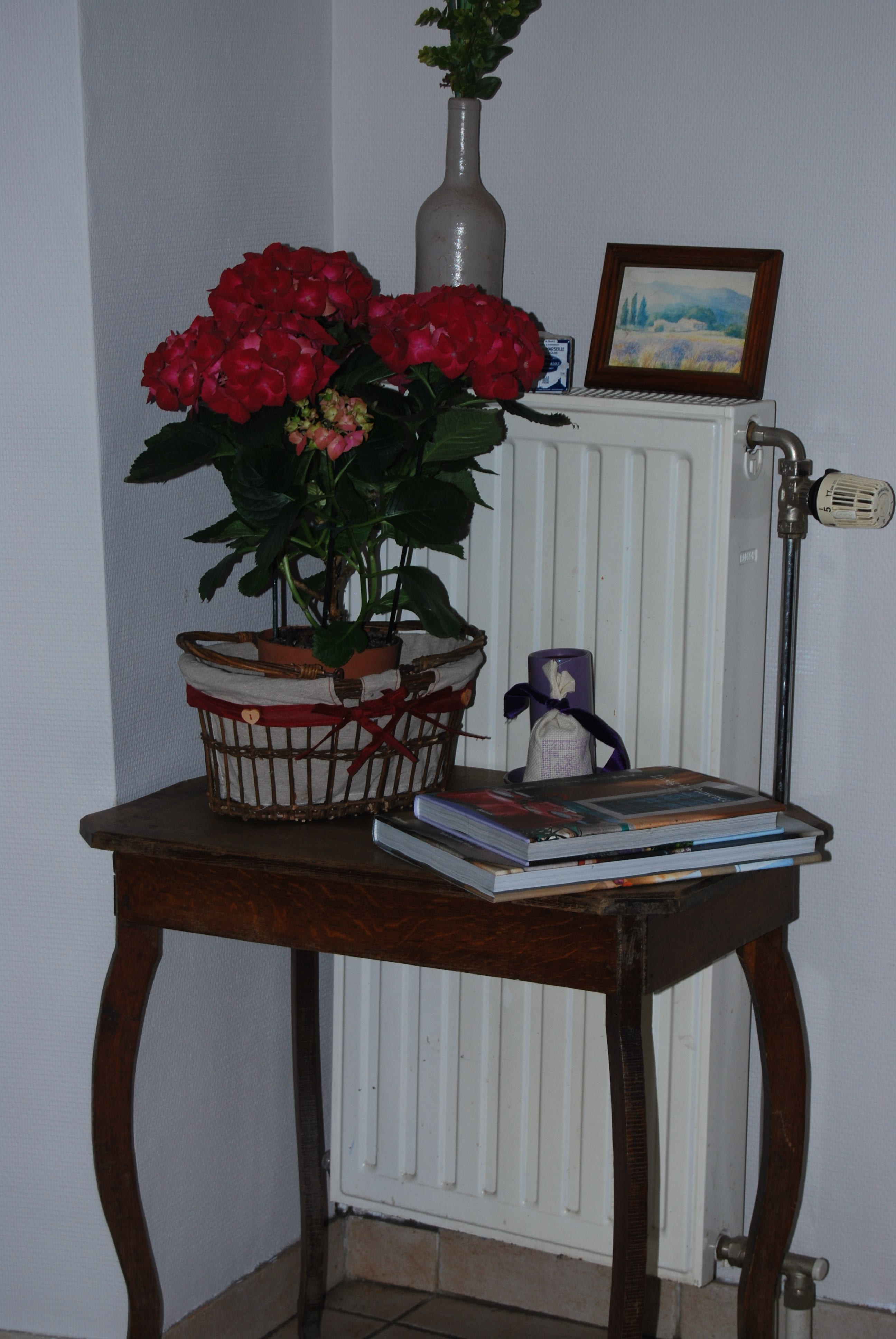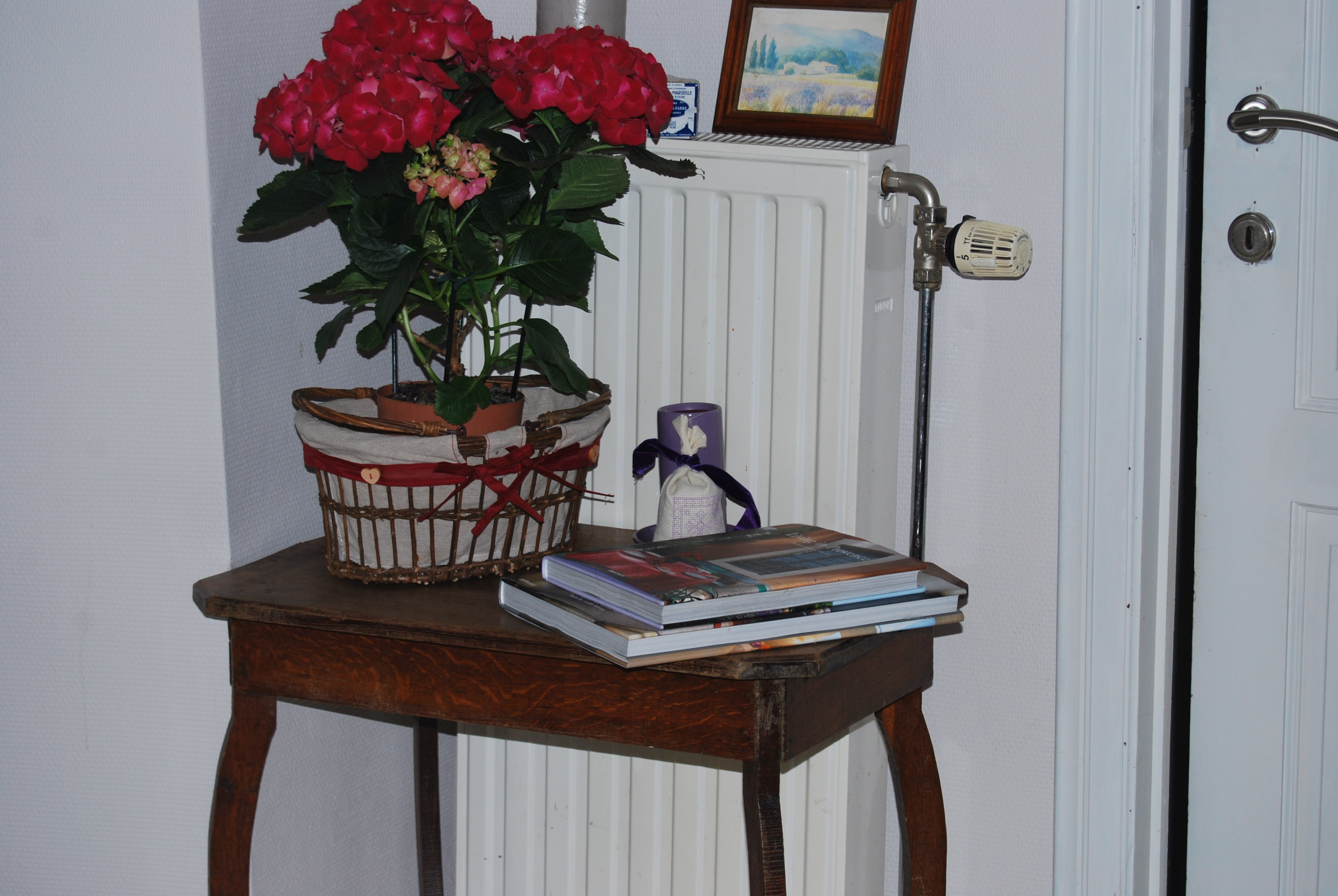 une petite table ancienne en chêne sans prétention mais qui m’a charmée un matin de brocante frisquet et embrumé, que j’ai laissée dans son jus après un bon nettoyage à la lessive saint marc et que j’ai placée dans l’entrée …. en guise de « mon petit coin provençal » J’ai trouvé les pieds légèrement arrondis assez élégants et la dimension convenant bien à l’endroit choisi pour être exhibé …