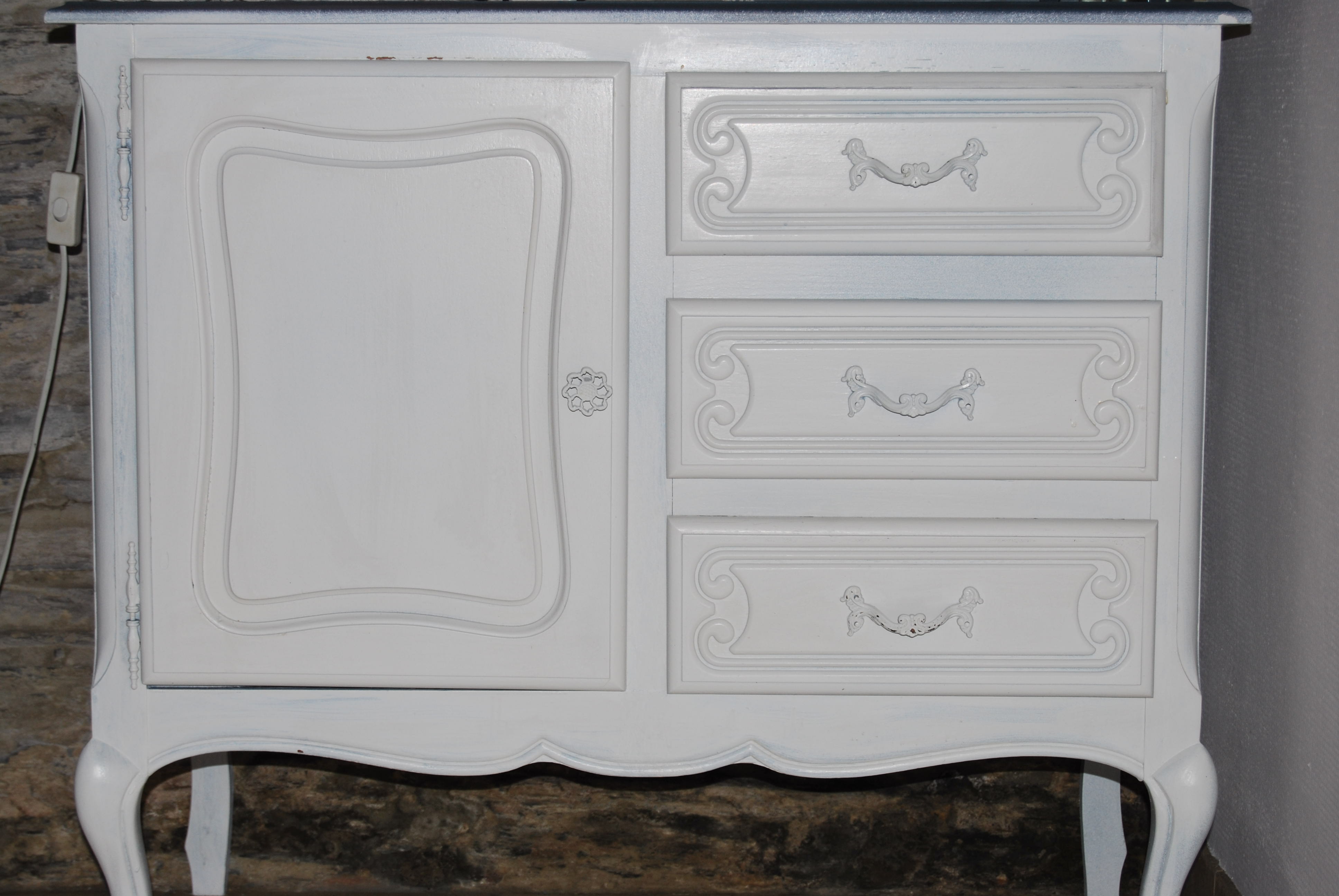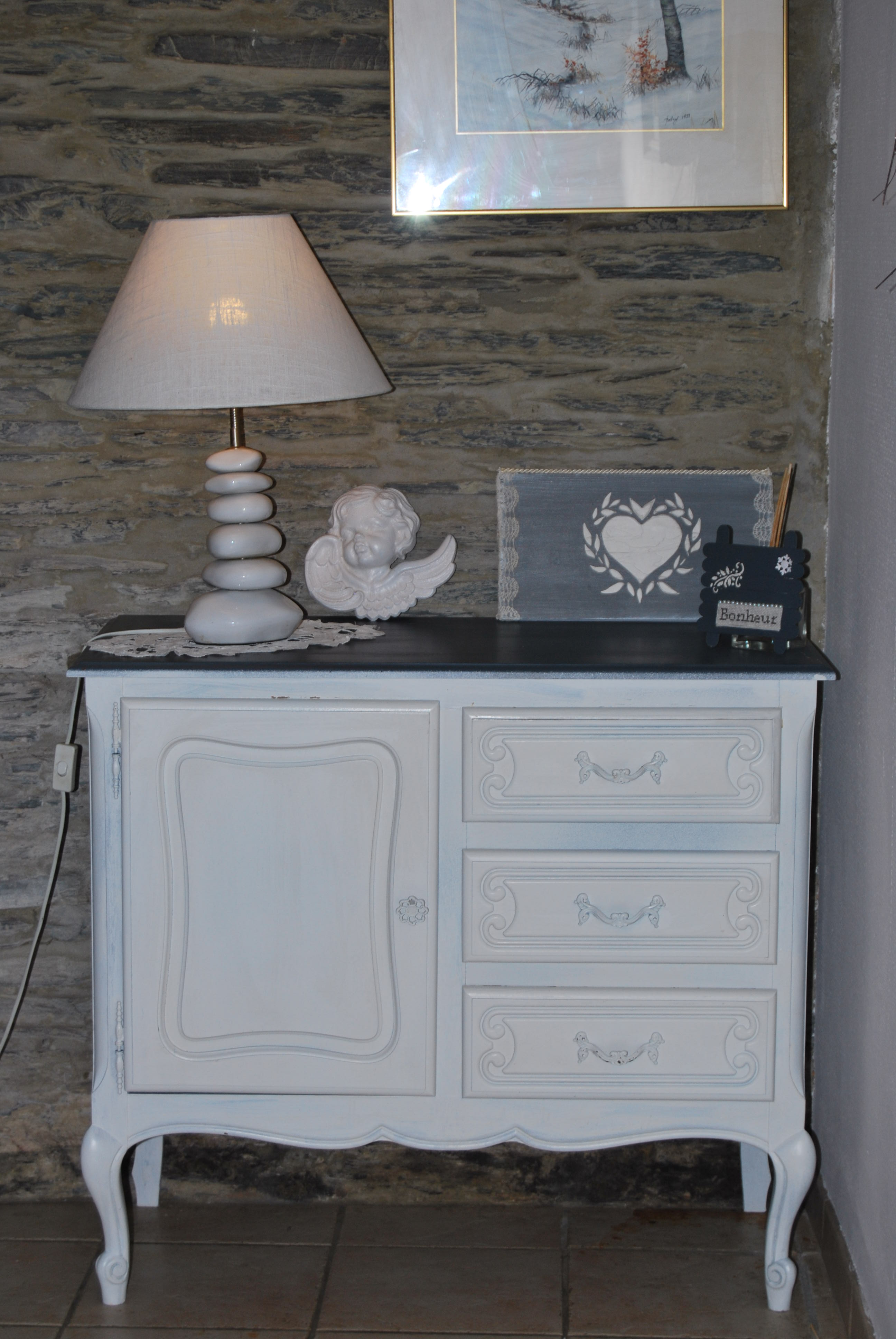 le meuble de famille repeint voici déjà un moment qui orne enfin le fond du couloir d’entrée, le plateau est en gris de suède et le corps en craie (ma couleur de prédilection du moment) de chez Eleonore Deco comme d’habitude  :