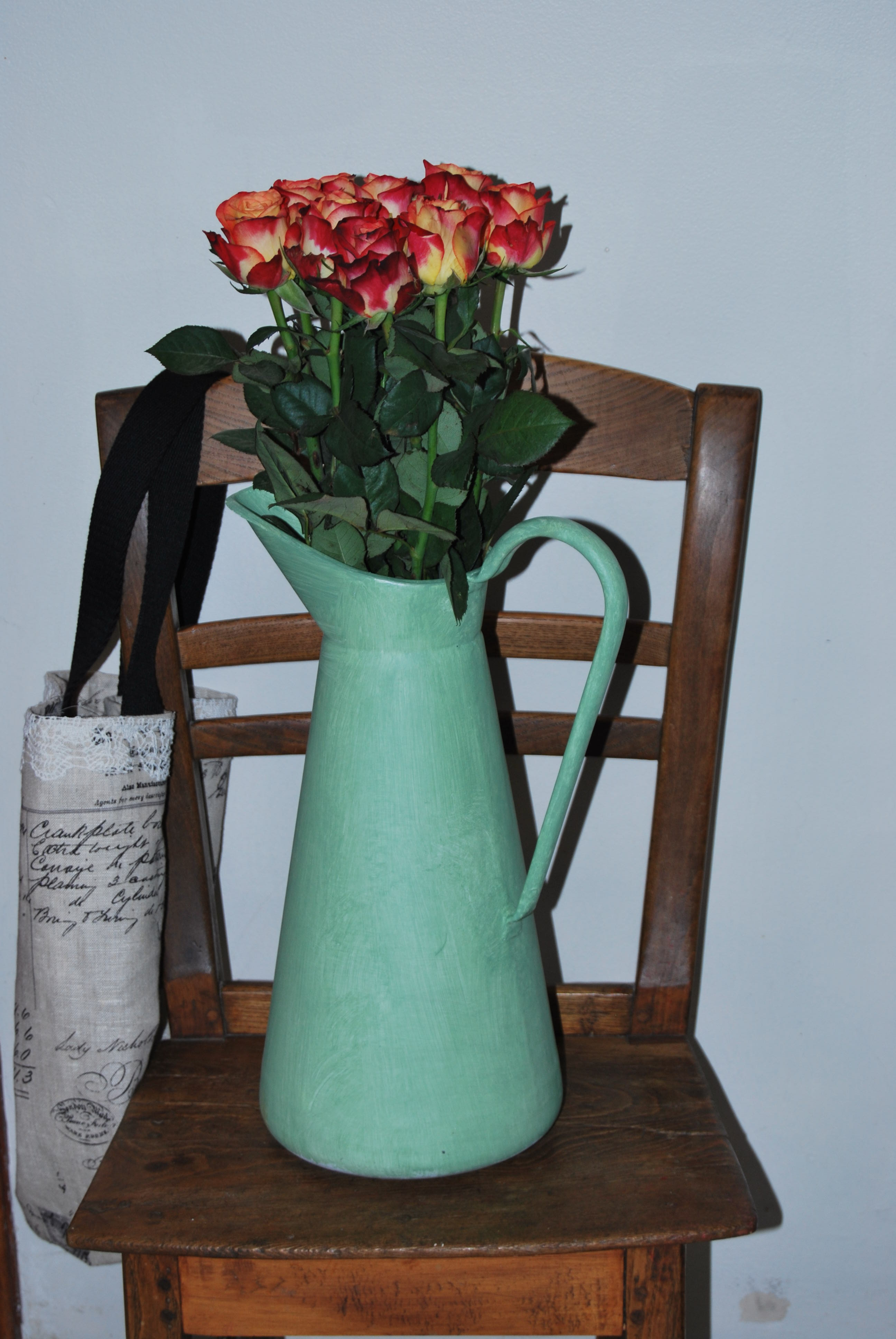 Enfin, une vieille cruche en fer émaillé blanc cerclée à l’origine de fins traits bleus sur le bec qui manquait d’allure (j’entends encore les commentaires peu élogieux de notre fille : « quoi, vous avez acheté « ça  » ?… c’est moche !!!) et repeint avec un beau vert « avocat », nouveauté Eleonore Deco, il y manque encore une petite couche de couleur, un peu de pochoir et de vitrificateur pour être achevé mais … la fête des mères de ce dimanche m’ayant fait don d’un beau bouquet de roses, je n’ai pu résister à l’inaugurer tel quel … et je trouve l’ensemble assez esthétique :