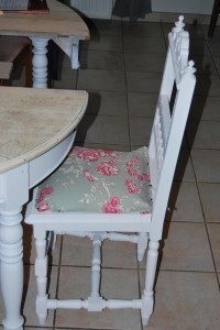 La table a elle aussi été relookée, mais pas de photos d’avant …. le plateau a été poncé jusqu’au bois brut qui demeurera tel quel après vitrification et le reste mis en couleur identique à celle des chaises.