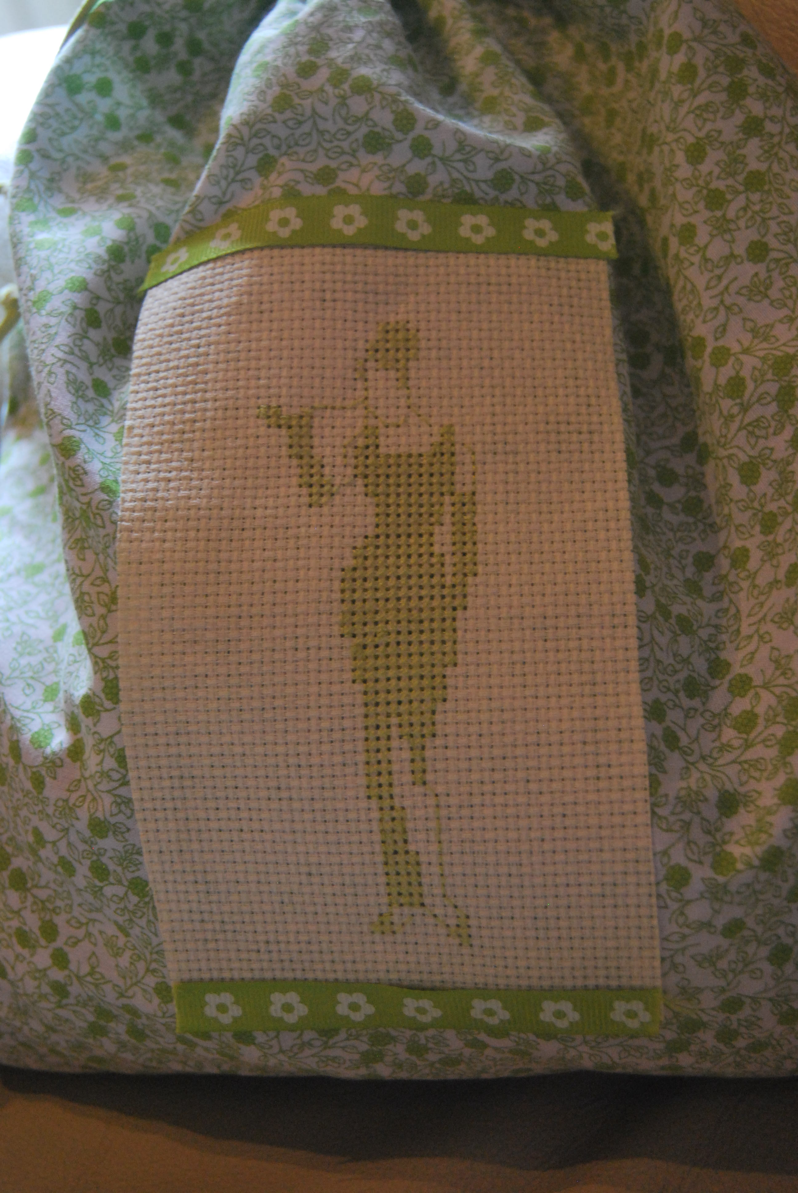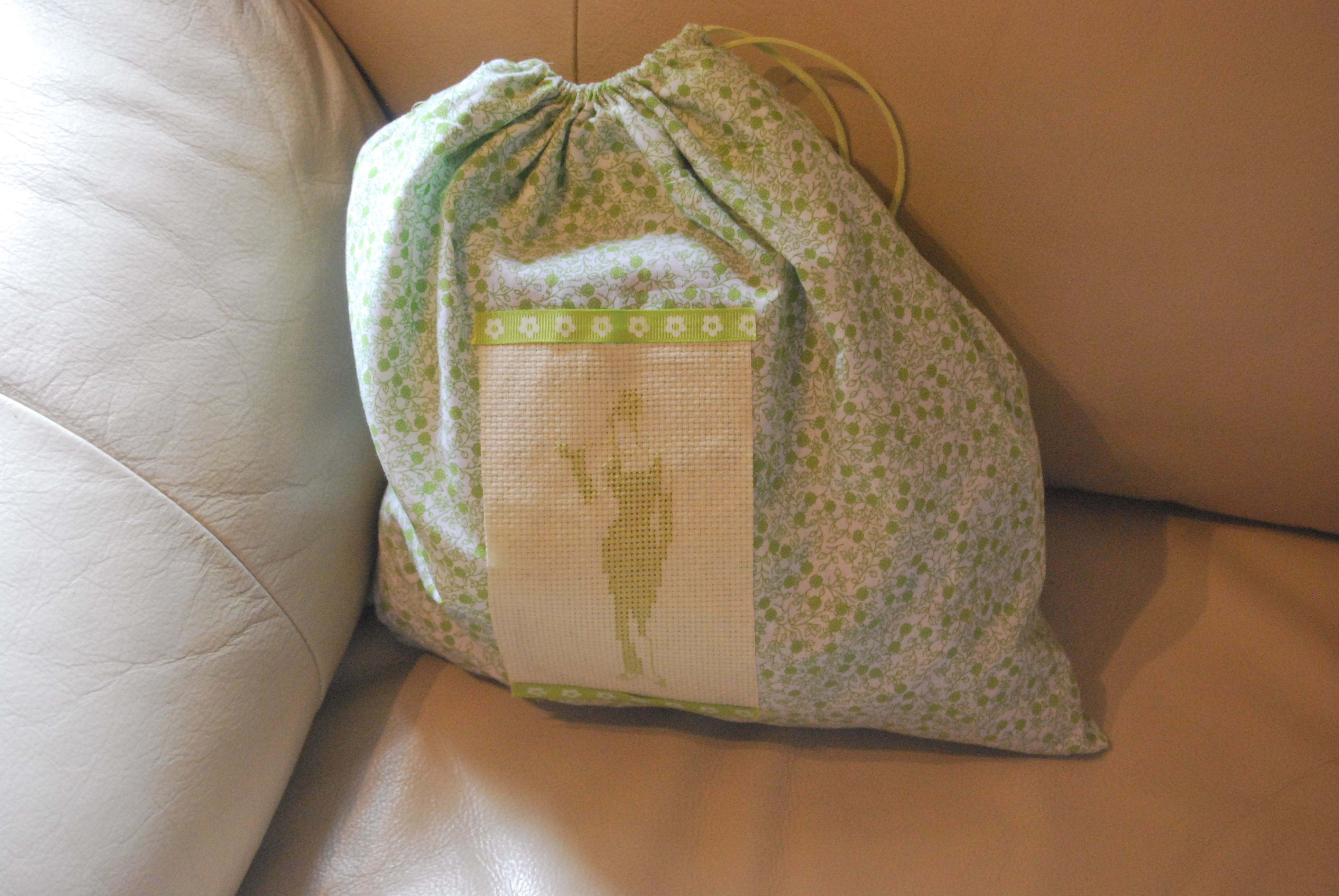 Un pochon qui recueille toutes mes dentelles et autres rubans, j’ai bien aimé broder le personnage (free trouvé sur le net), je trouve que la dame a de la classe !!!