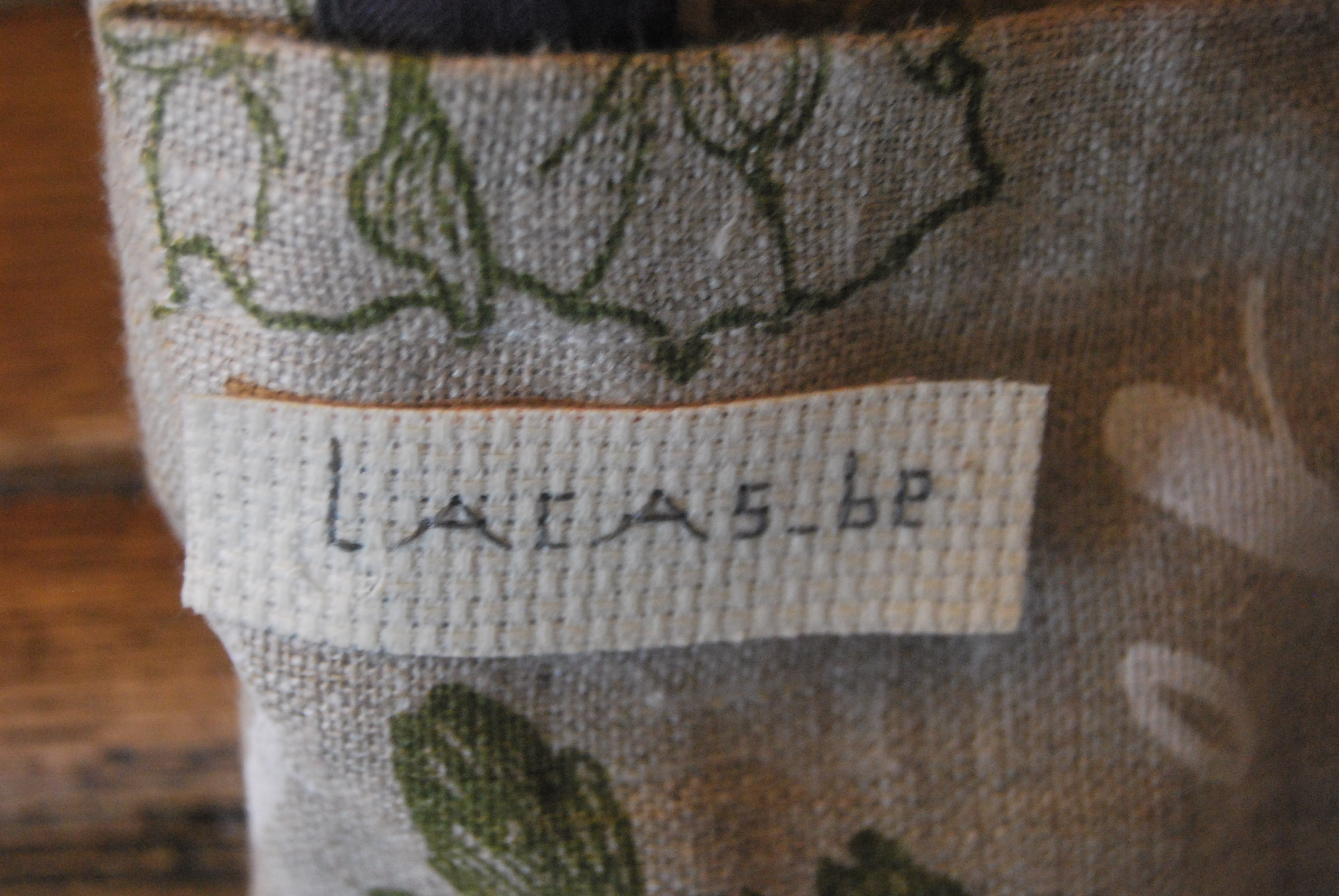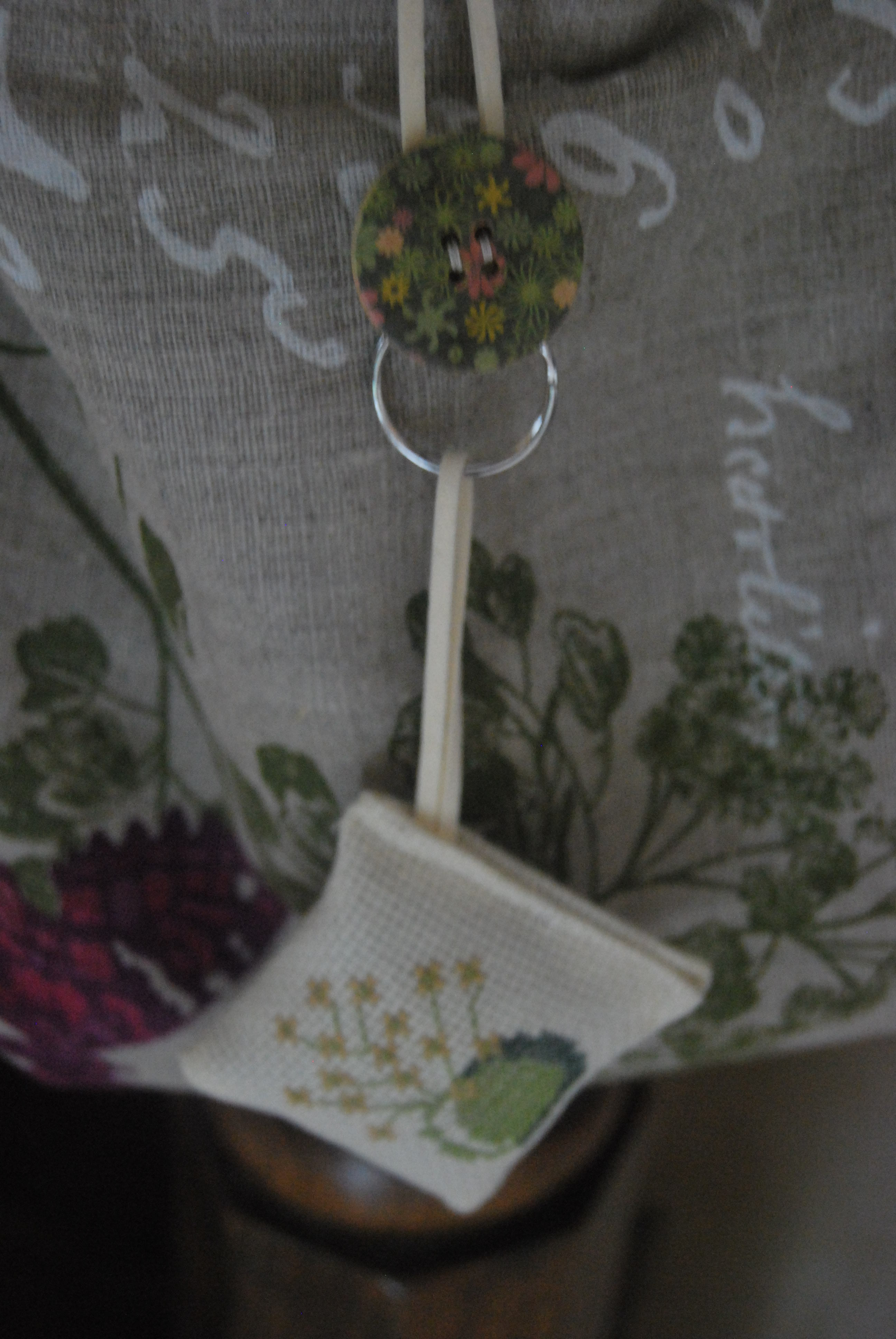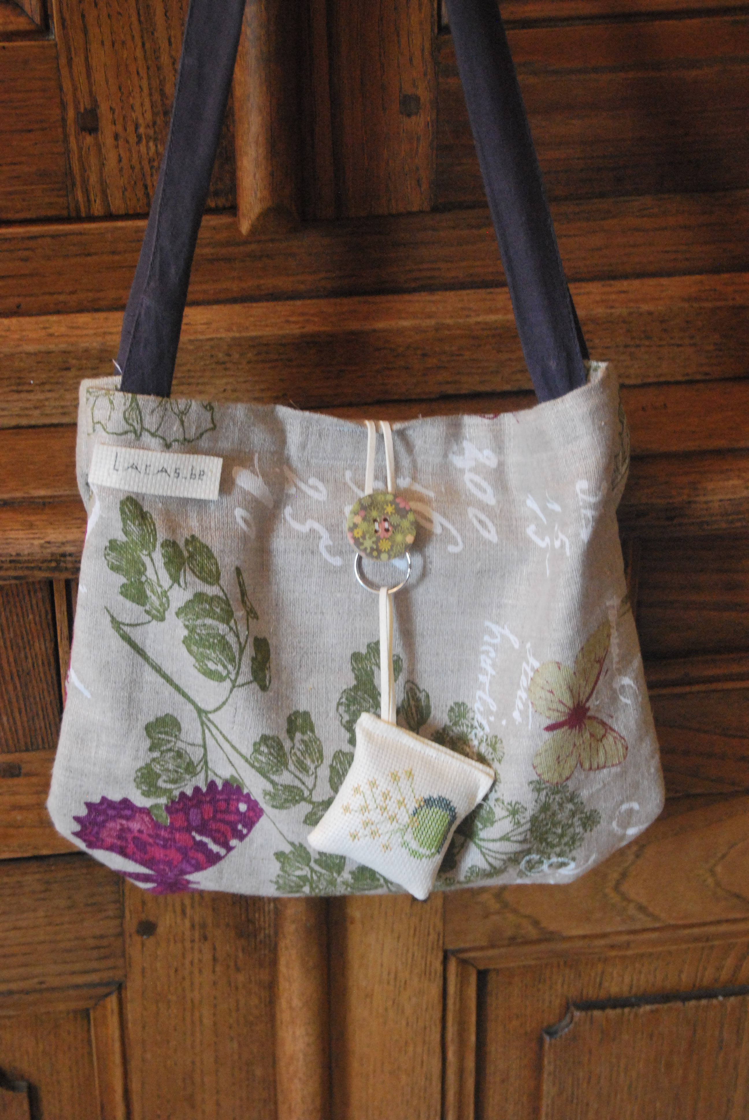 une petite étiquette home made, un coussinet décoratif et un bouton fleuri complètent l’ensemble. L’anse est à l’origine une ceinture en tissu que j’ai récupérée.