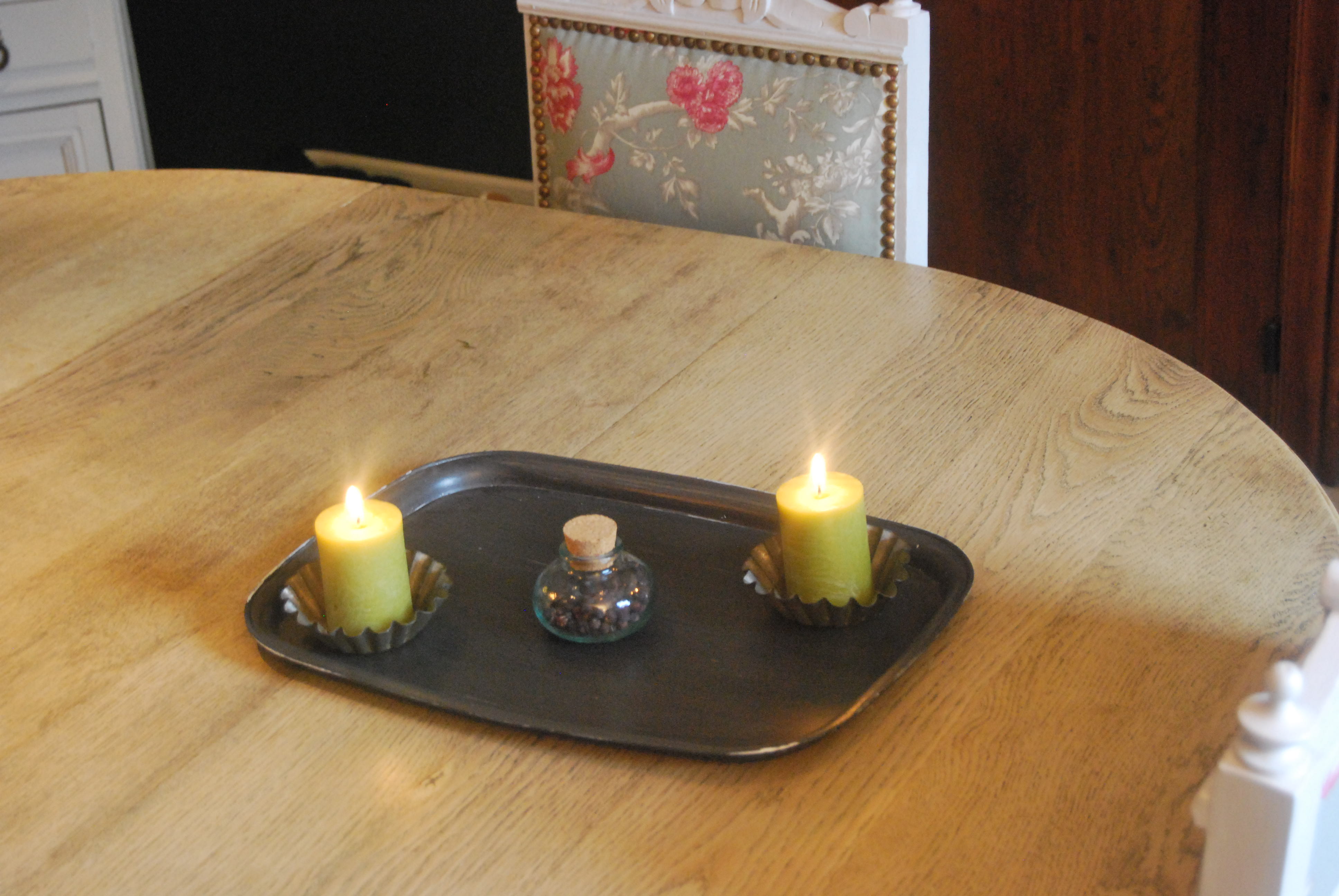 Et pour le plaisir d’une petite mise en scène, un plateau en métal tout rouillé que j’ai customisé à ma façon avec un mélange de métaline étain et de satinelle noire (1 dose d’étain, 1 dose de satinelle noire et 3 doses d’eau) et avec un bref passage à l’éponge métallique, juste pour un effet vieilli.