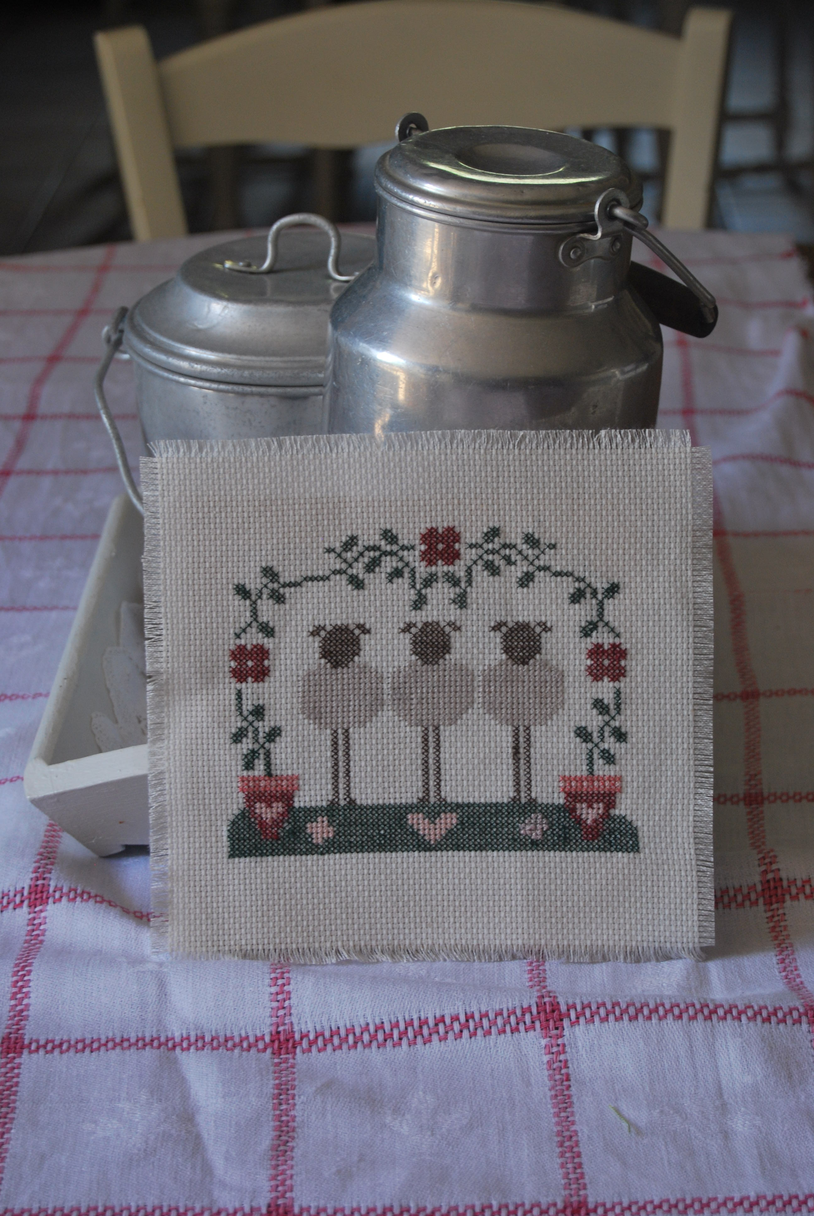 Celles-ci sont tirées du livre « Trésors de brodeuse » de C. Rigaudeau et M. Suarez. La broderie des moutons ne respecte pas tout à fait l’original, car j’ai tout simplement fait l’impasse sur certaines parties du modèle …. un oubli !