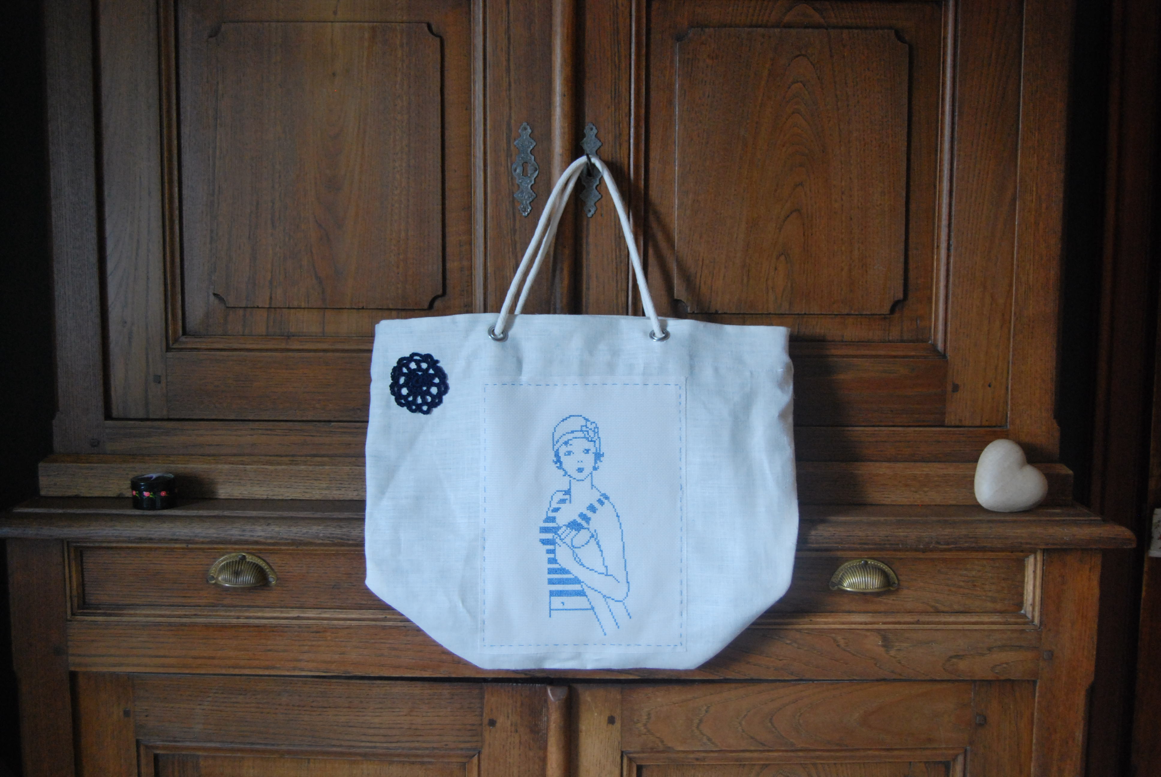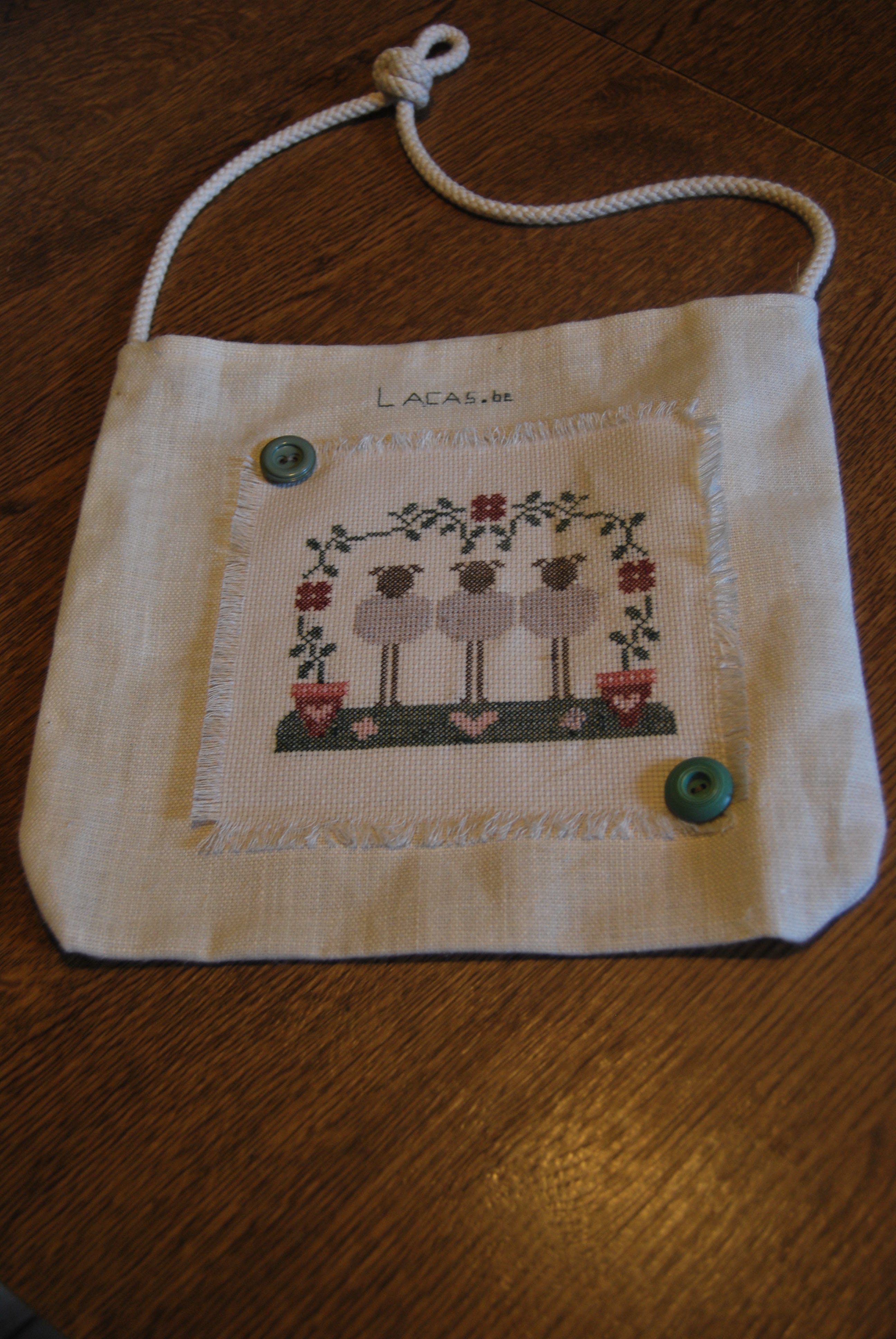 J’ai également monté la broderie des moutons sur un sac de lin (home made !) qui me servira de rangement.