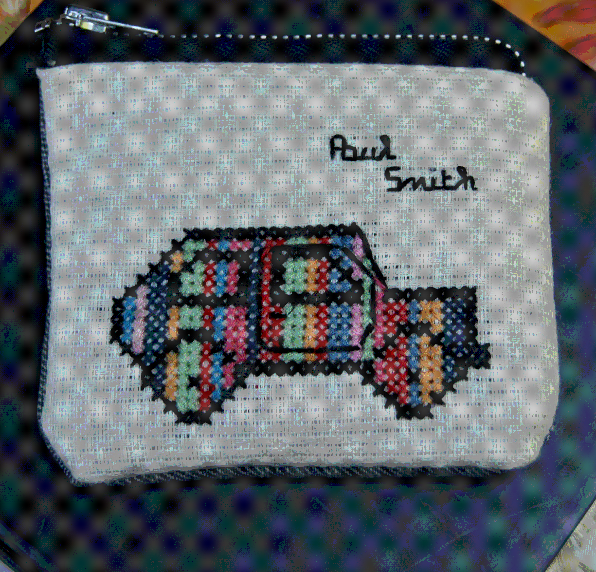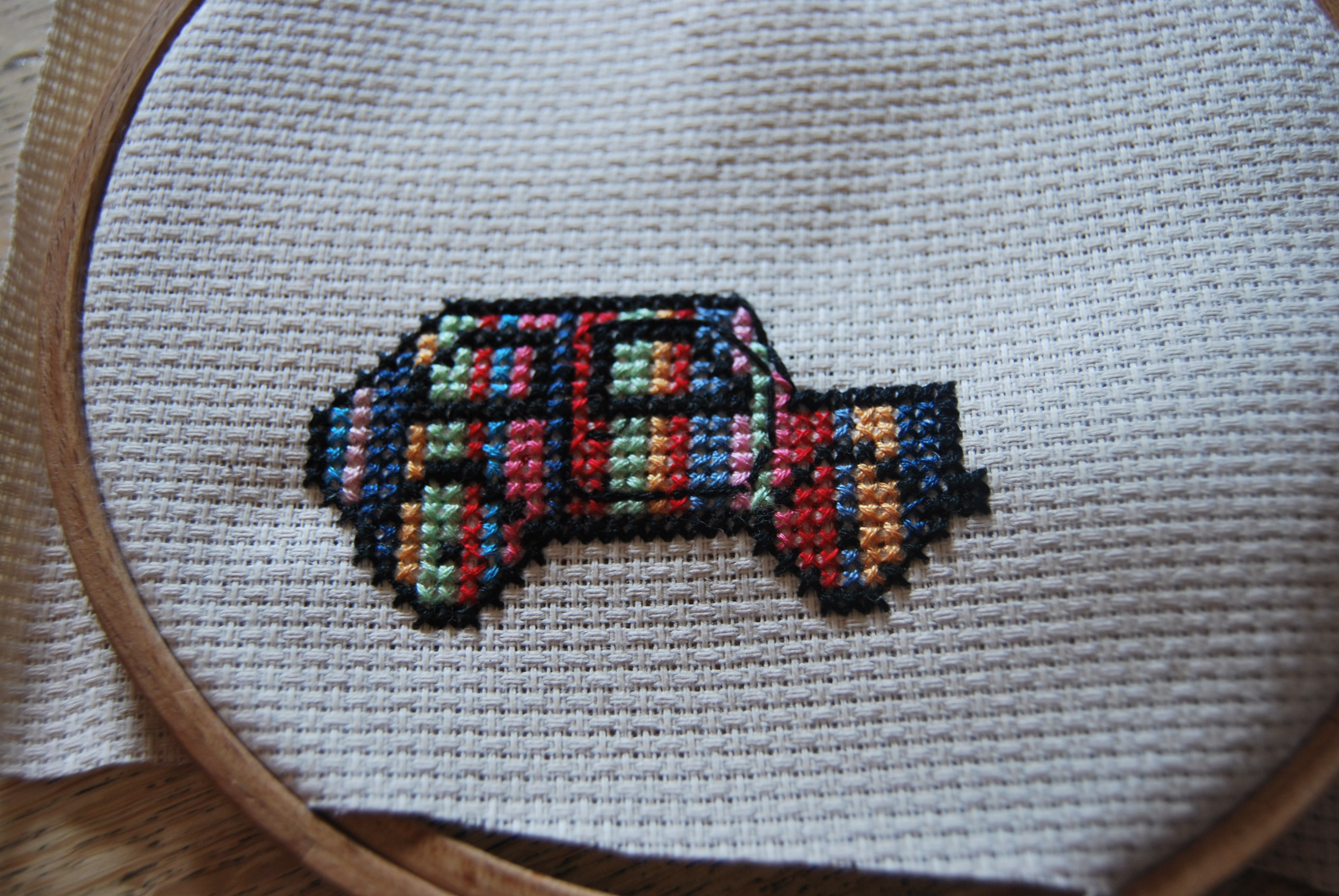 Ci-dessous une création de ma progéniture, brodée à l’instinct en parallèle avec son portefeuille (dessin identique) et je trouve, super réussie tant dans les couleurs que dans les proportions.