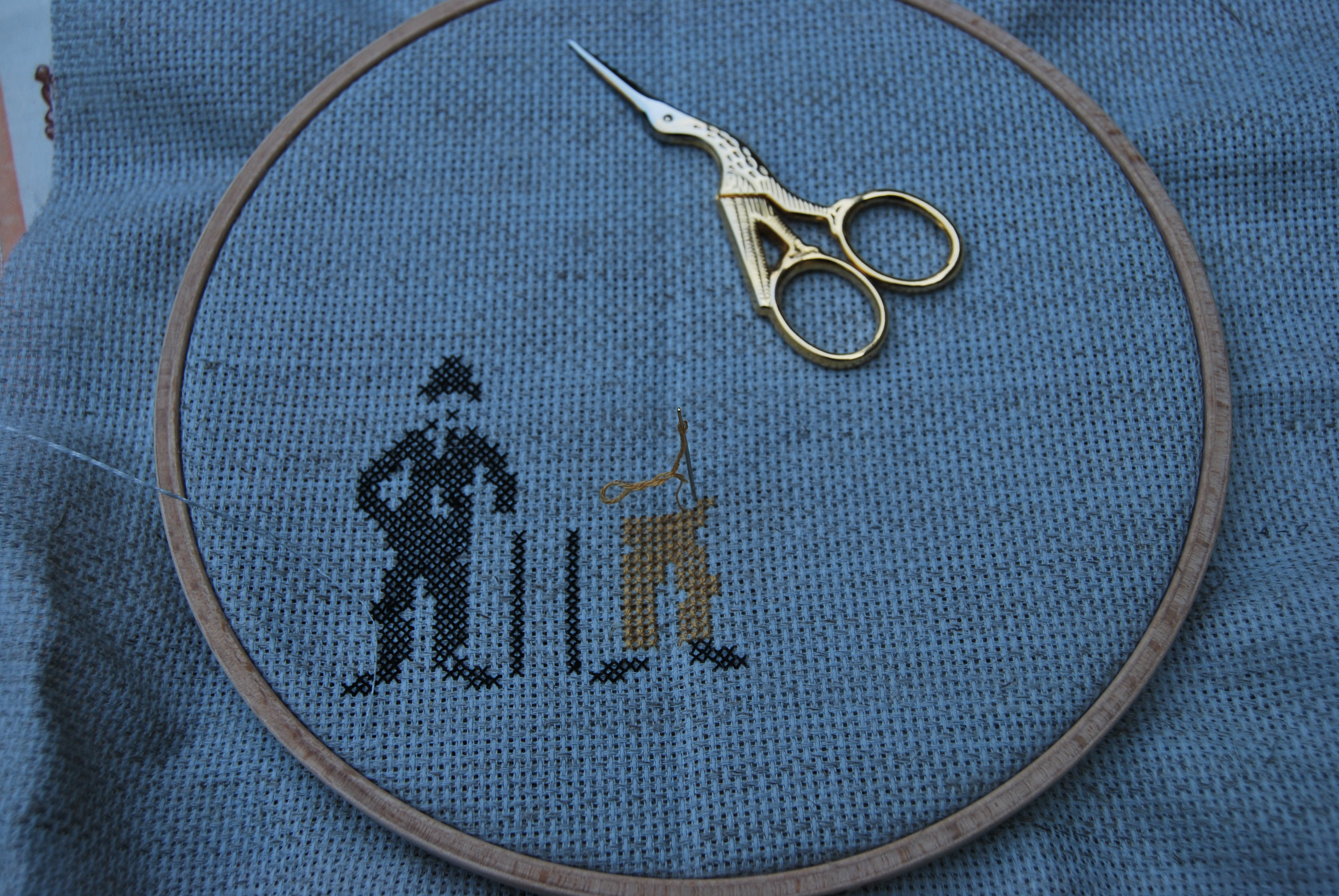 Quant à mon « encours » – encore une grille gratuite du net -, le reconnaissez-vous ? j’ai dans la tête d’orner mon couloir de l’étage de plusieurs broderies montées en cadre sur le thème du cinéma (peut être un Marylin Monroe ou un James Dean, c’est à voir …)