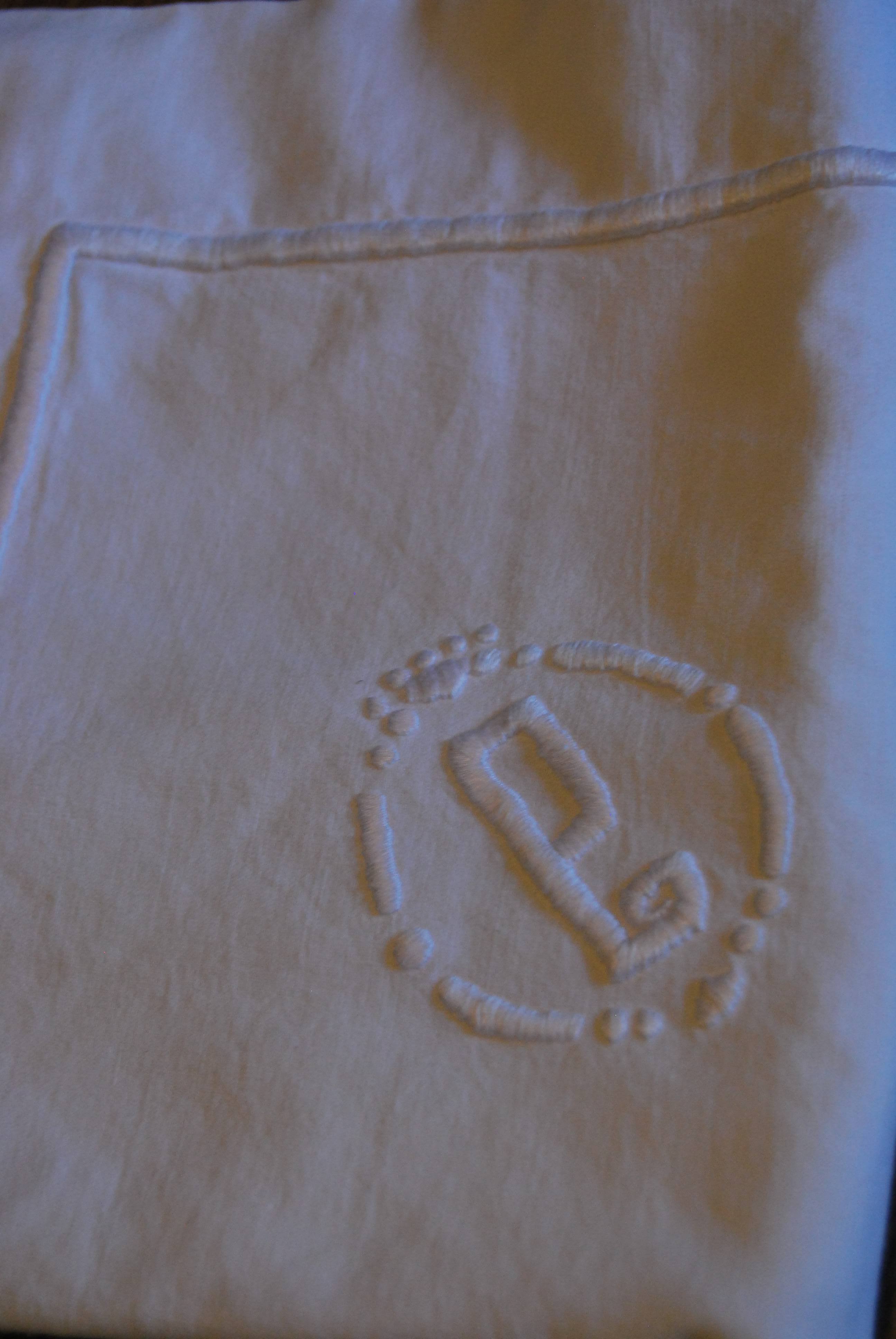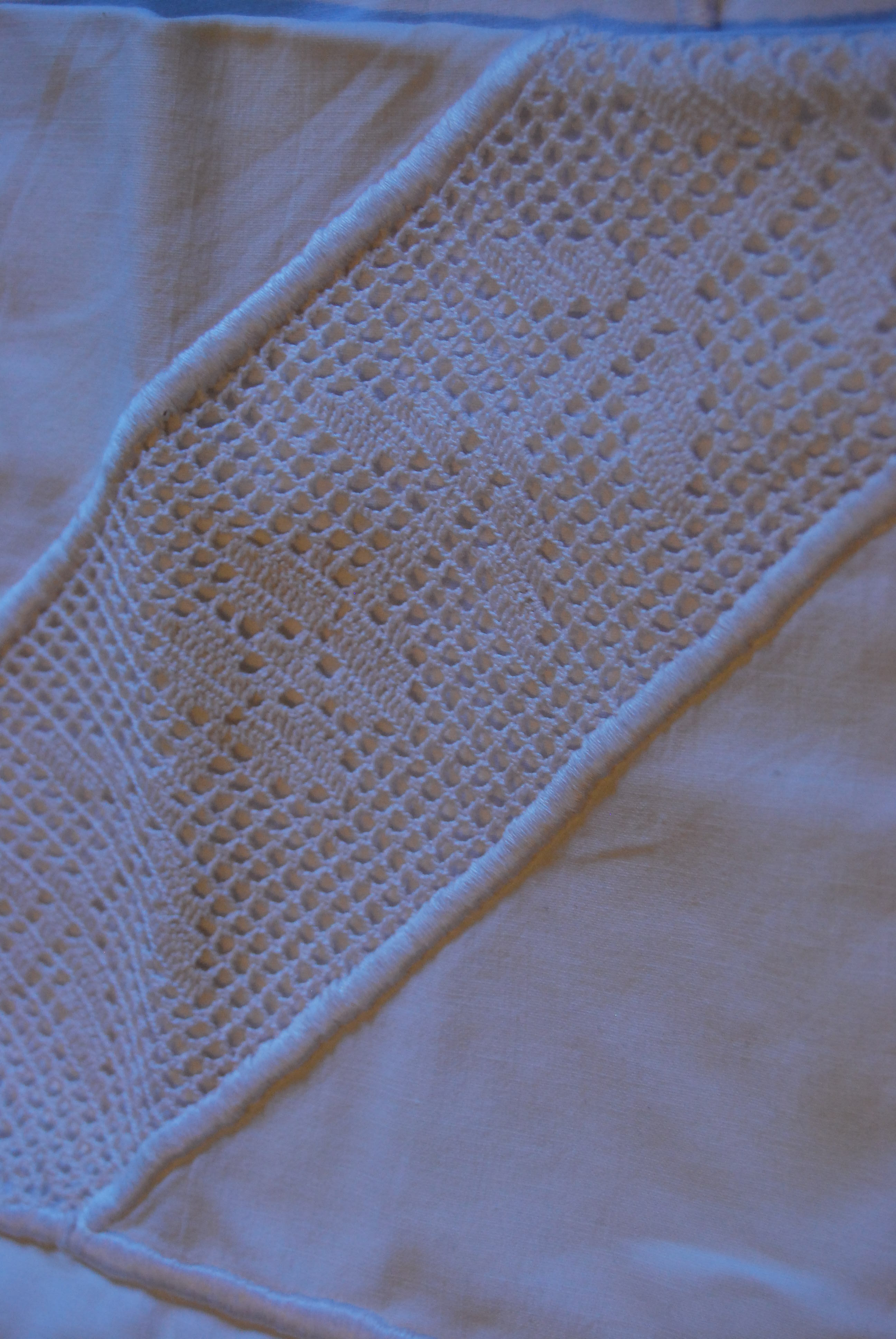 J’ai également « hérité » de deux taies d’oreiller de famille, monogrammées et garnies de crochet au filet, le tout fait main par une de mes grandes tantes.