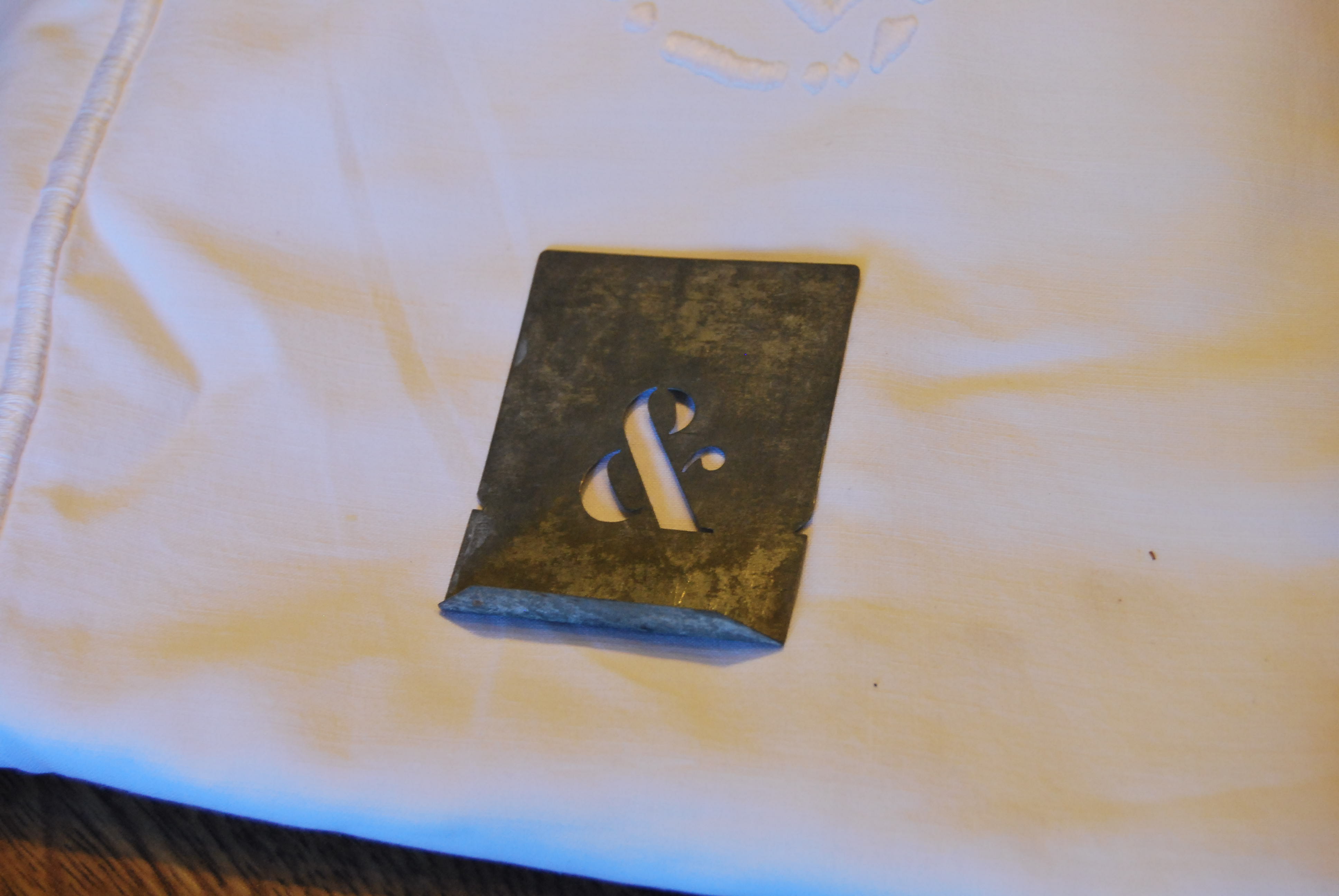 Ca y est, mes congés d’été sont à présent définitivement et irrémédiablement consommés. La brocante dominicale sous les averses a été fructueuse, j’ai déniché des pochoirs alphabétiques et numériques en zinc, assez anciens, ils ont servi, c’est sûr !! Cela faisait longtemps que j’en cherchais et j’ai eu la chance d’en trouver pour une somme très modique. Ici, un exemple avec l’esperluette qui accompagnait le « pack » :