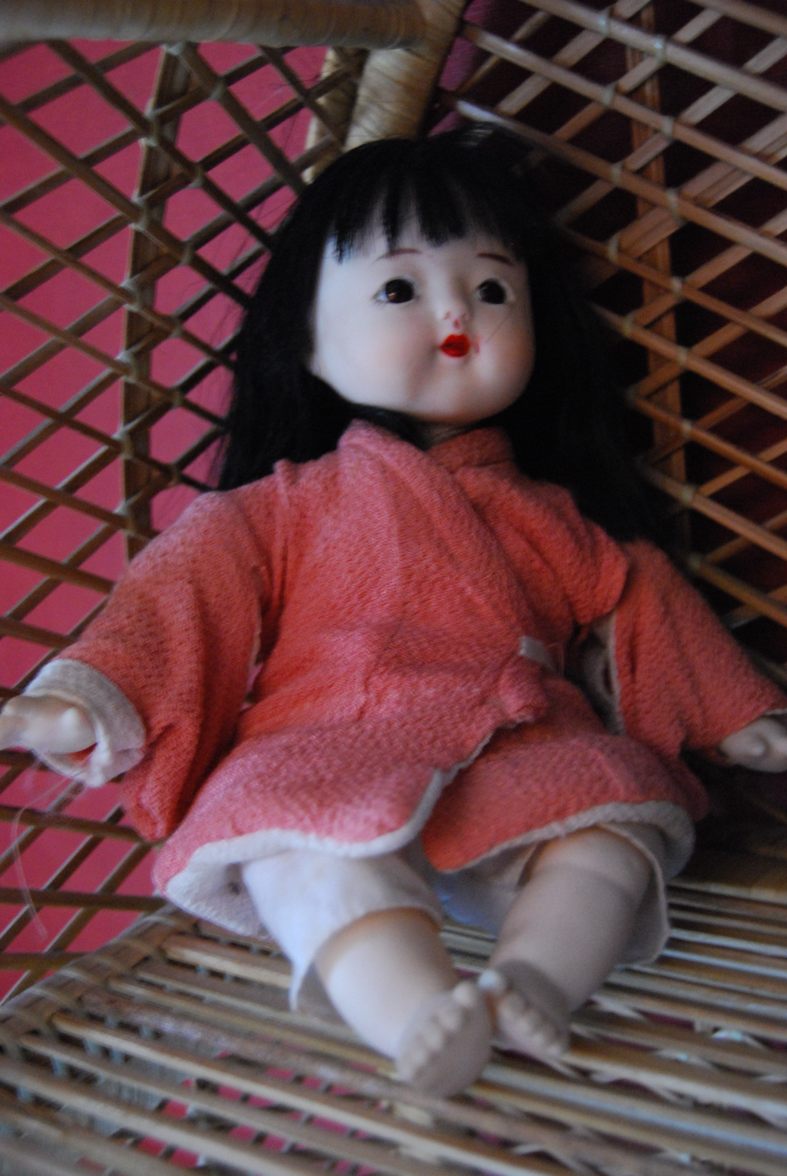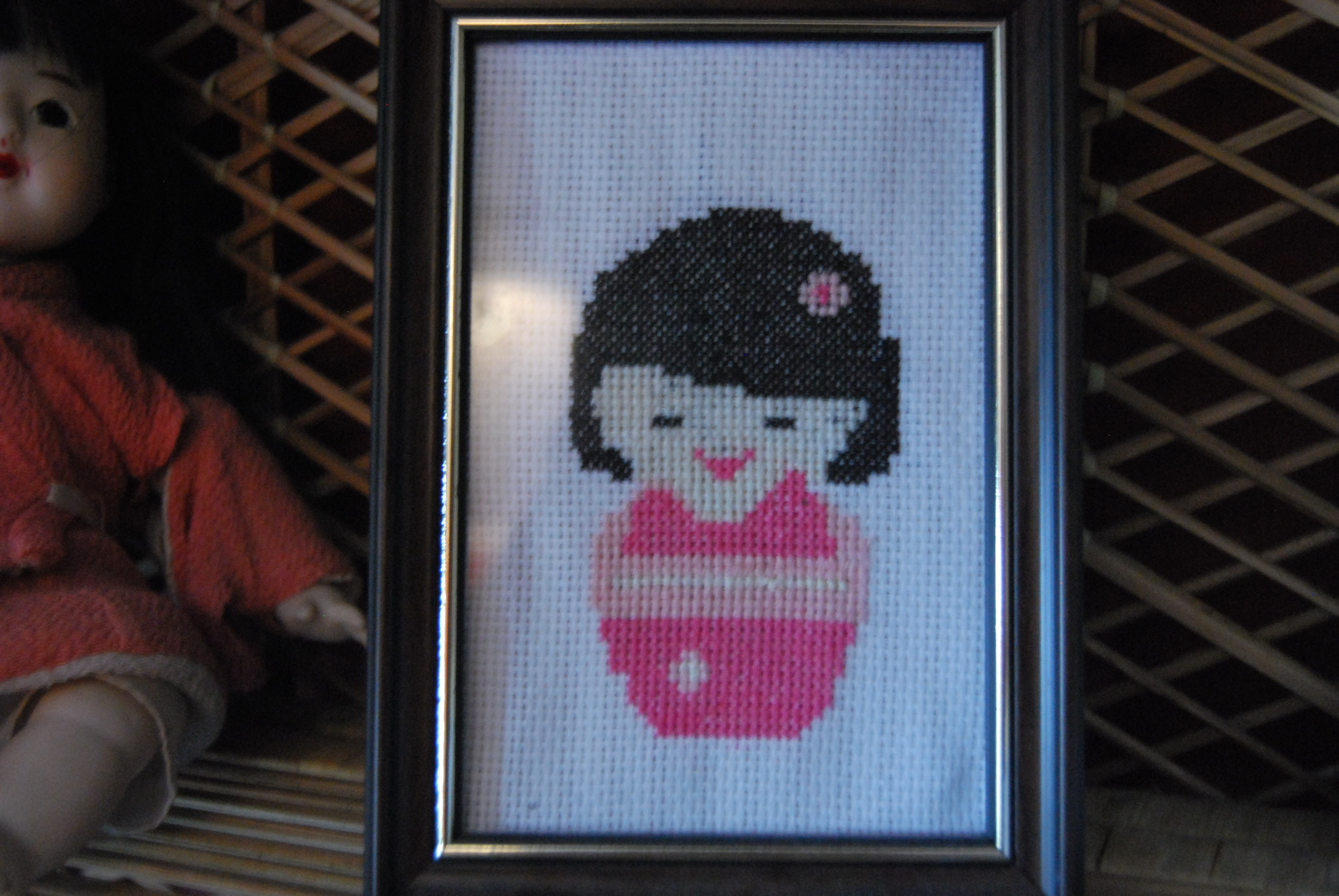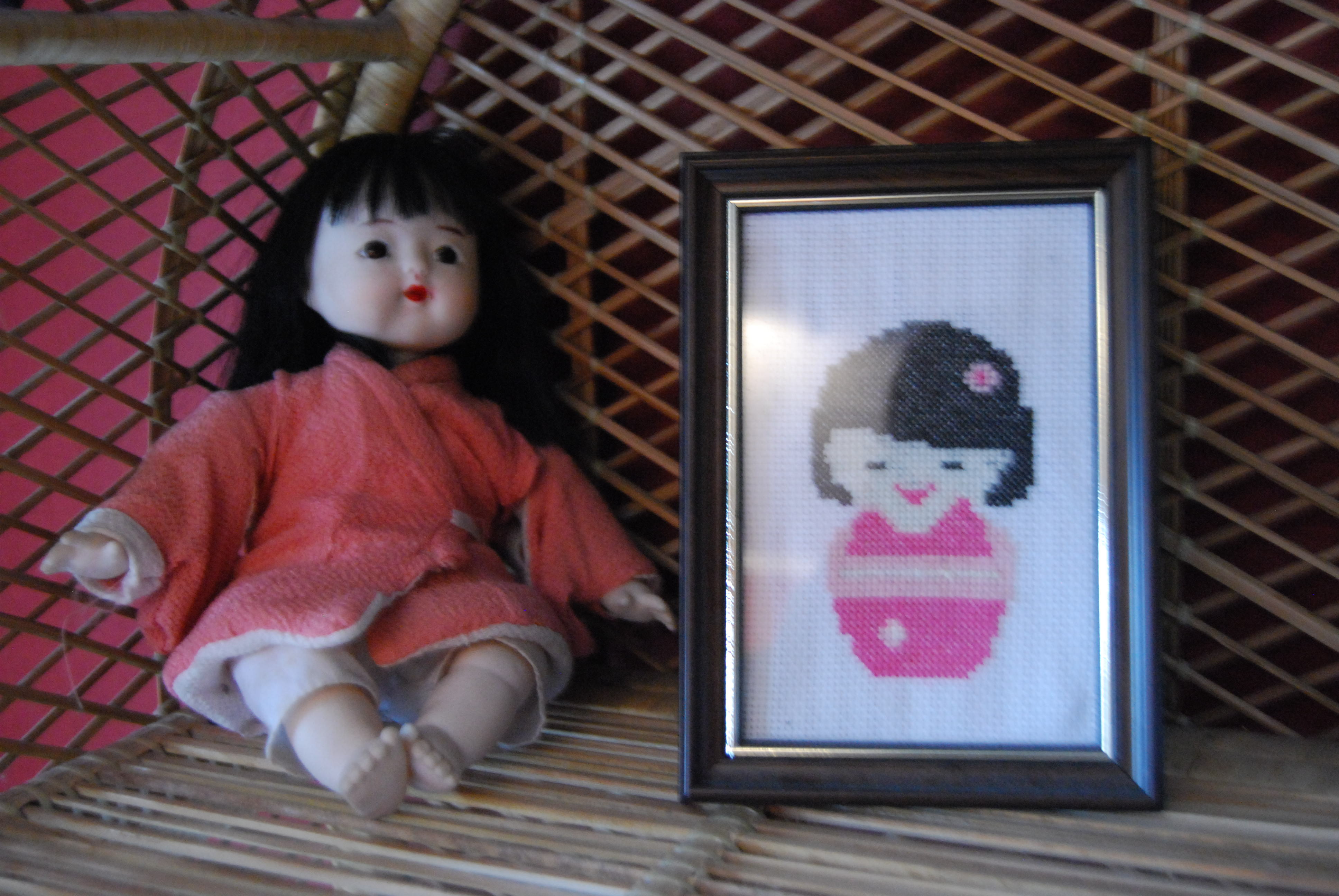 Et voici une kokeshi posant aux côtés d’une authentique poupée japonaise (cadeau rapporté il y a des années du Japon !!), brodée à grande vitesse l’an dernier pour décorer le kot d’une étudiante éprise de mangas et autres topics japonisants !