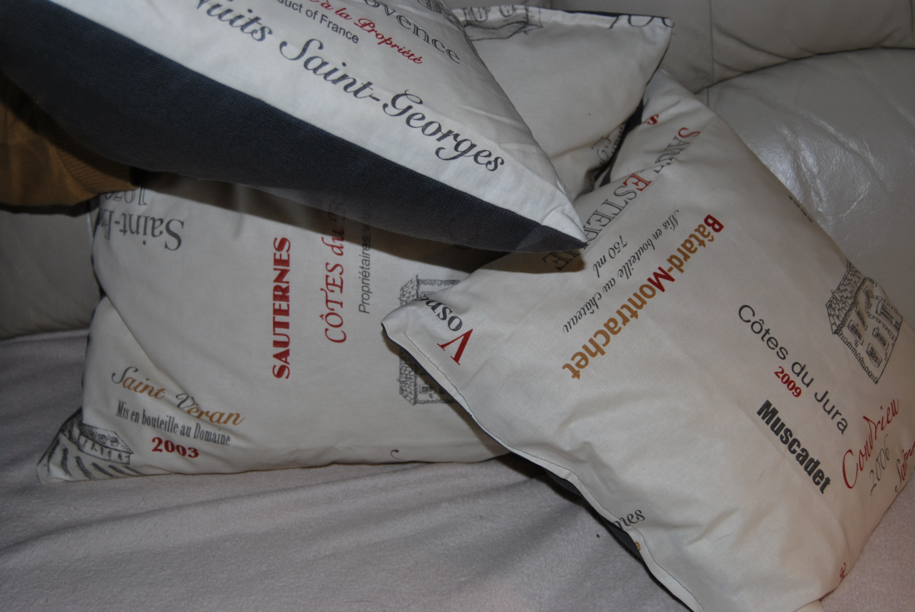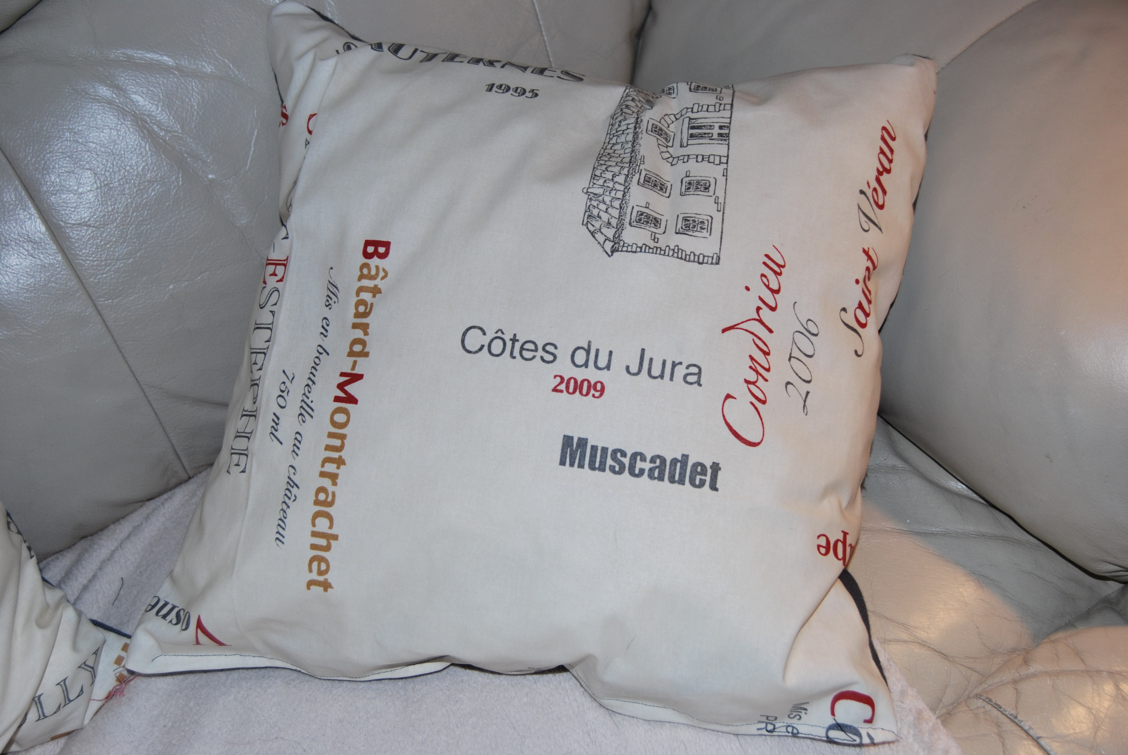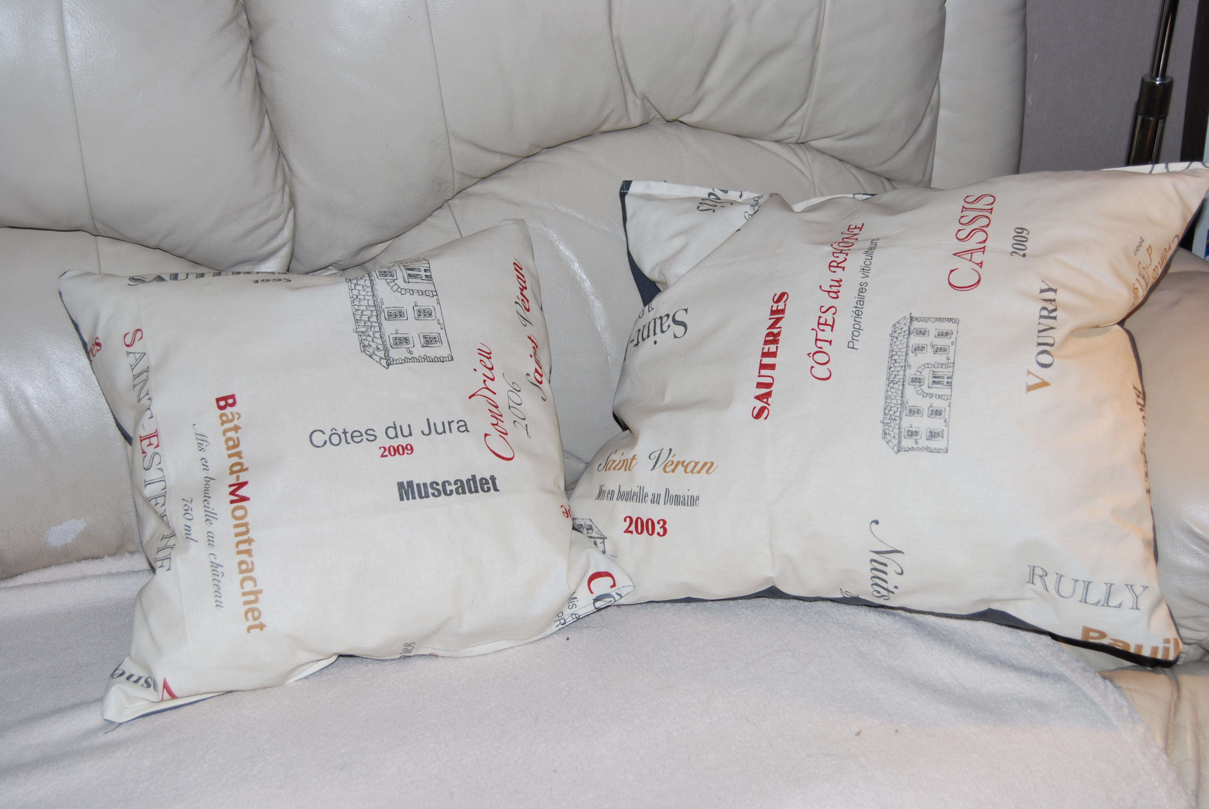Outre de nouveau un week end passé à installer cette fois notre deuxième du nom à « seulement à 125 kms » de la maison (et à coudre encore et toujours une nouvelle paire de tentures, celles du kot d’origine étant plus que vieillottes …), j’ai quand même pu réaliser quelques coussins dont le tissu se pâmait d’impatience au fond de mon placard depuis plusieurs mois, un petit voyage vinicole pour égayer le salon :