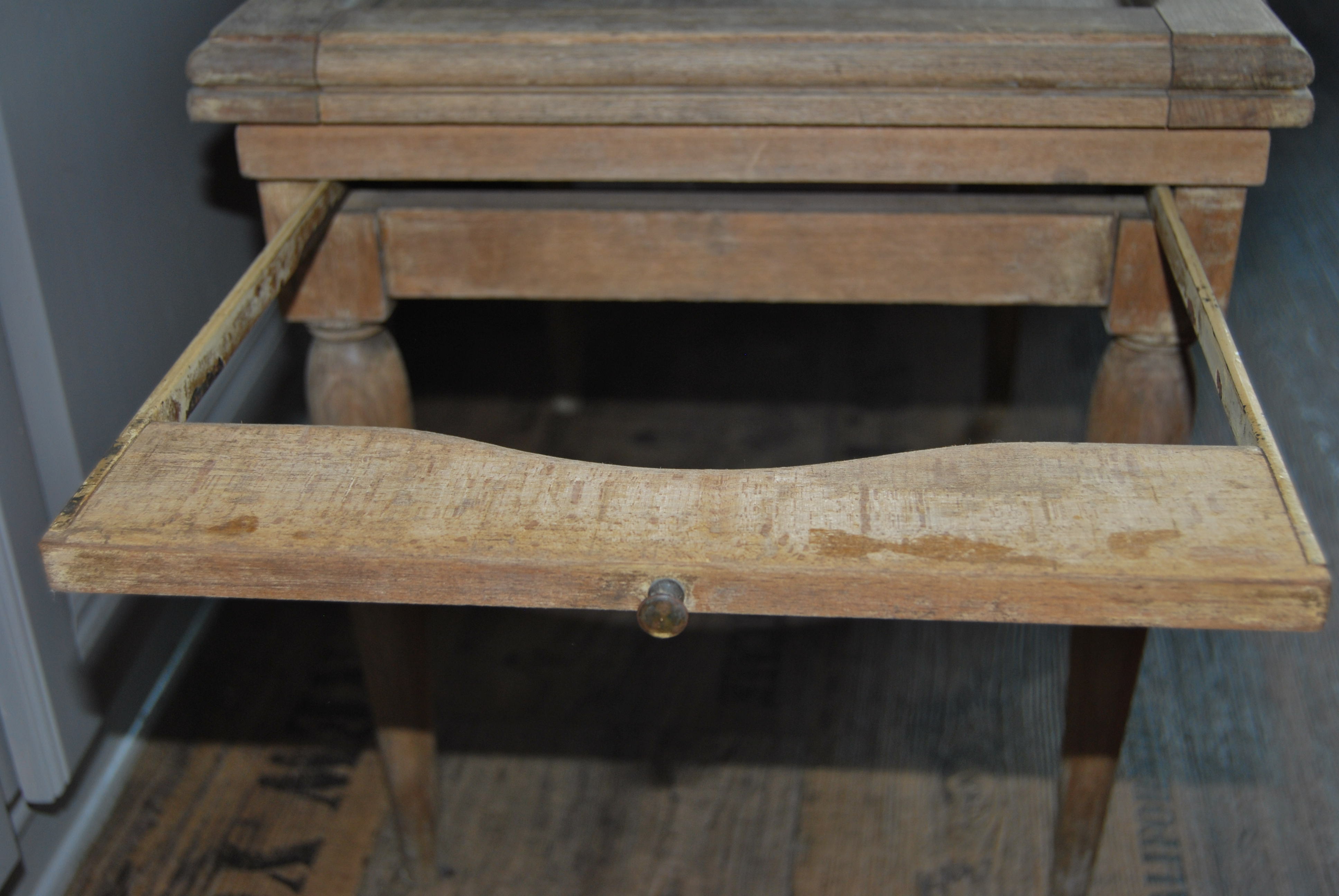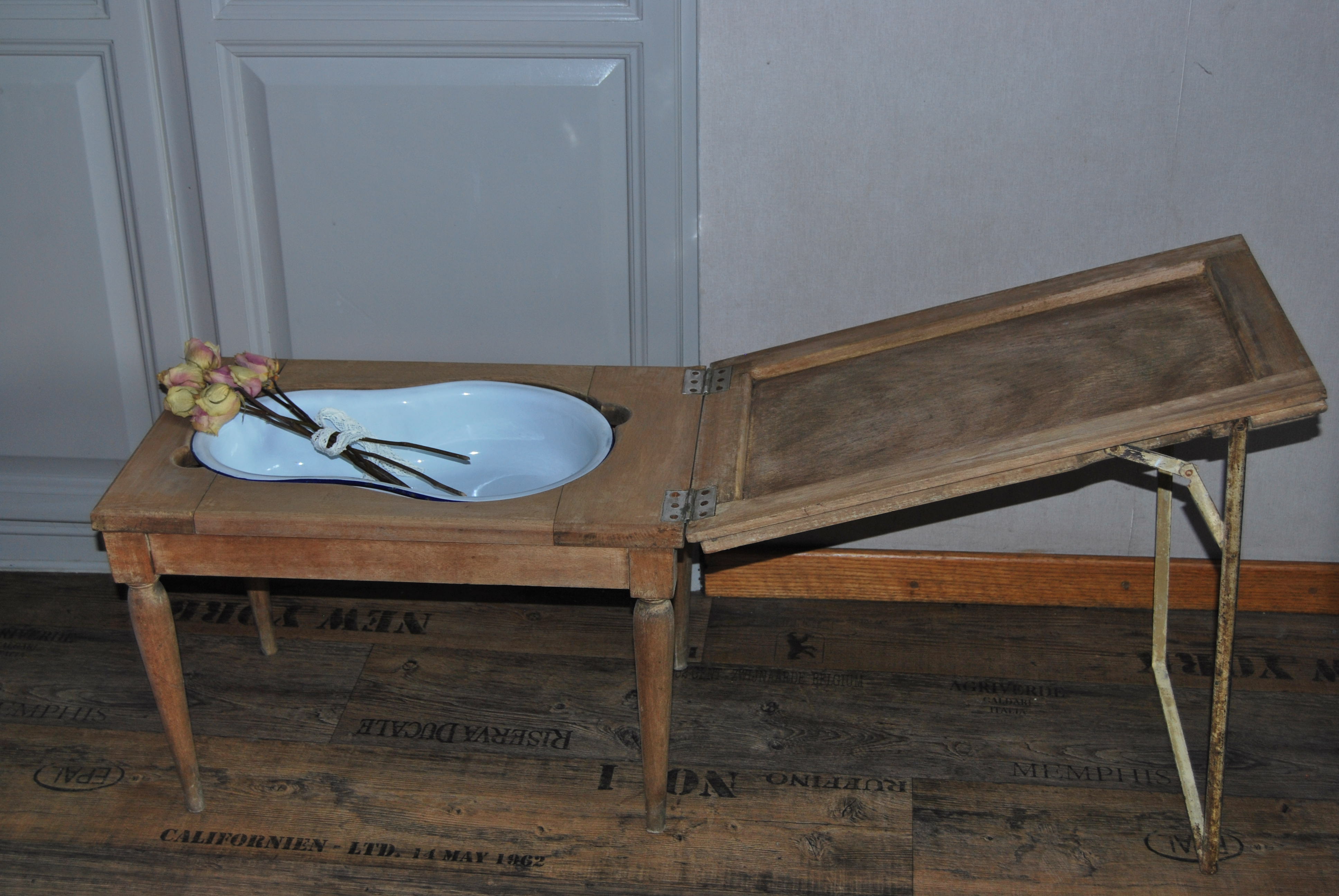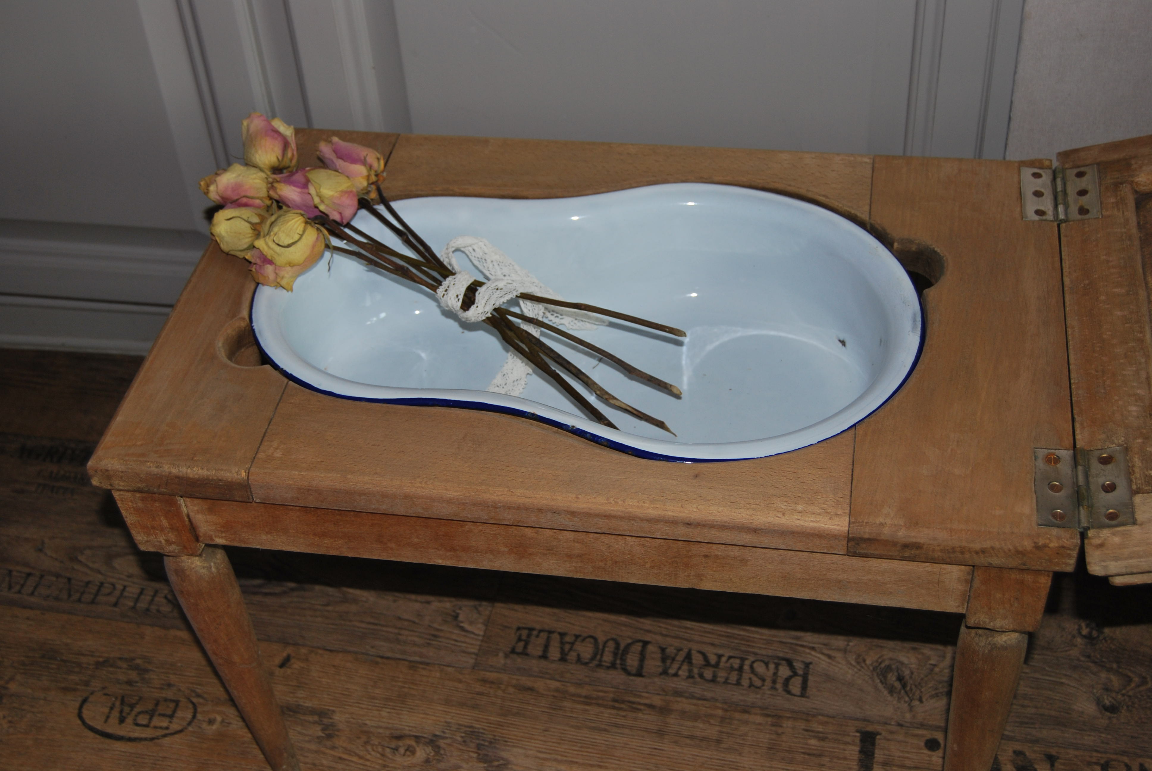 Il s’agit d’un ancien bidet en bois encore en très bon état. Il est même pourvu d’un étendoir qui se glisse à l’intérieur de l’encadrement. L’originalité de ce petit meuble laissé dans son jus après un bon lessivage – dans l’attente d’un relookage éventuel – nous a séduits sur une brocante cet été. Je réfléchis au recyclage de la cuvette en émail qui au départ était destinée à accueillir des plantes … mais comme la place manque pour laisser le tout ouvert … pour l’instant, le bidet nous sert de table d’appoint.