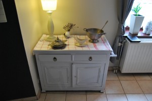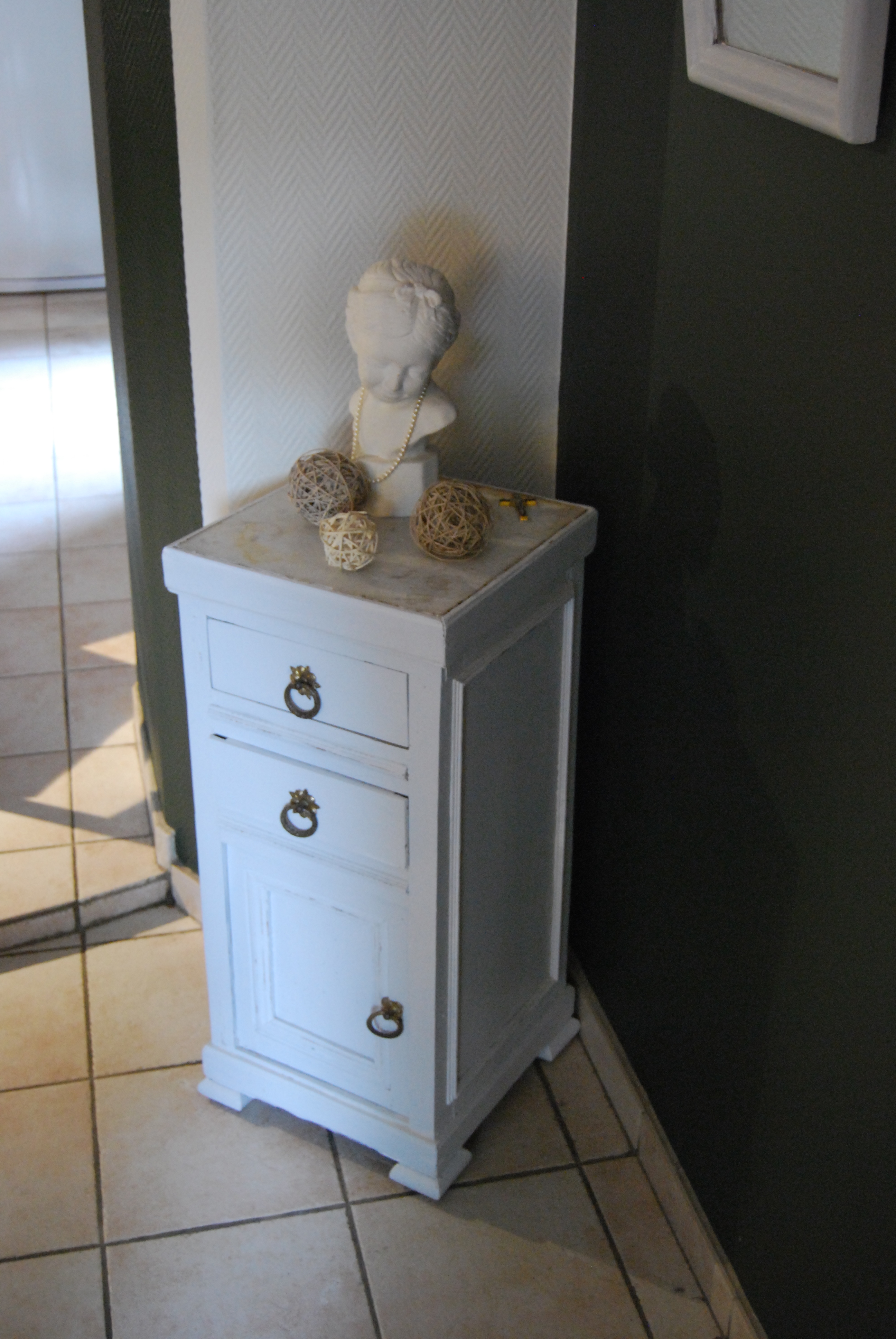 Deux petits meubles rénovés l’an dernier et littéralement « sauvés » in extremis de l’oubli au fond d’une grange … Aucune valeur marchande mais strictement sentimentale .Il s’agit en effet d’une fabrication « home made » par le grand père de mon mari, avec les moyens du bord de l’époque… différentes planches de bois de qualité inégale les composent. A l’origine, une commode « lavabo » et une table de nuit assortie….