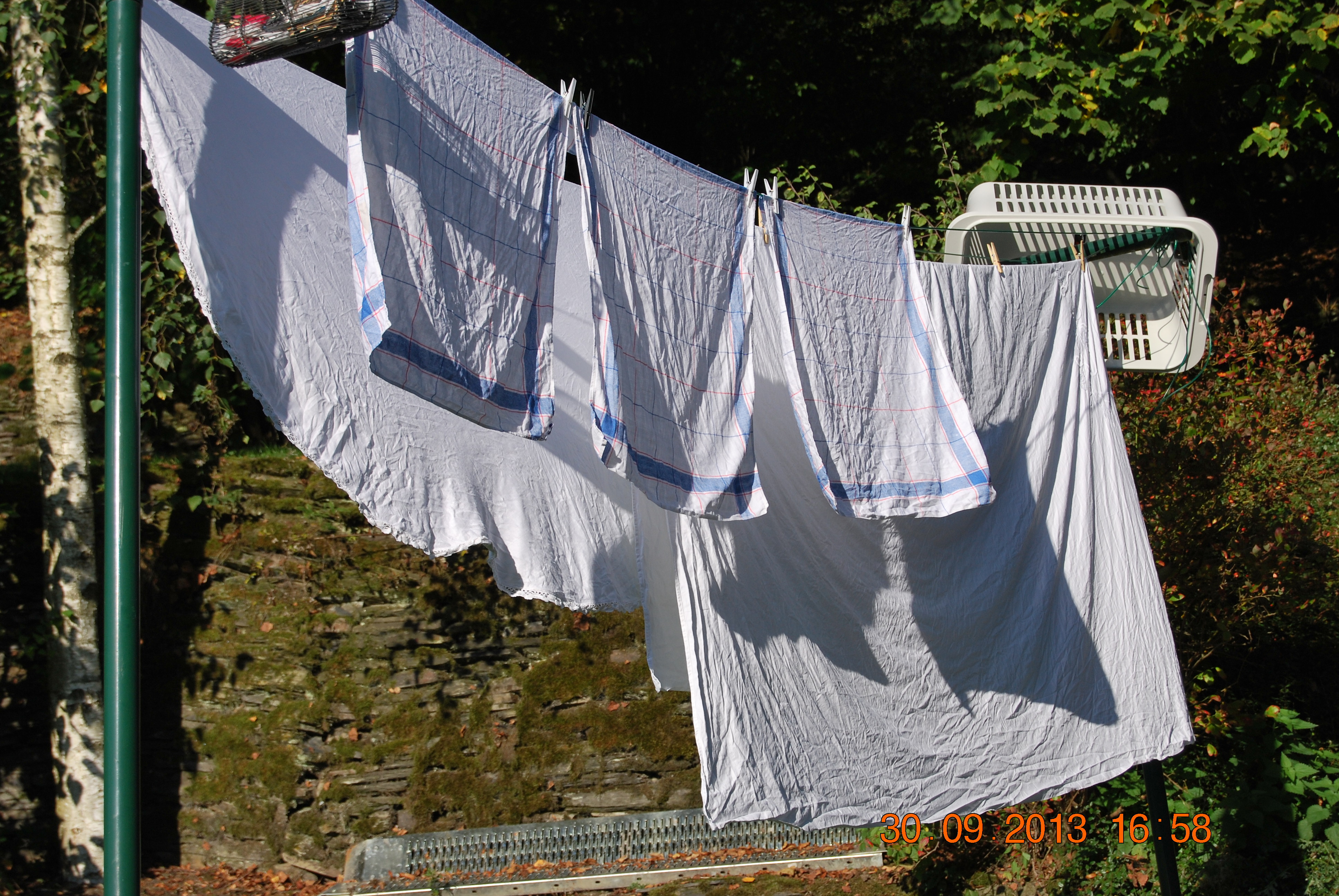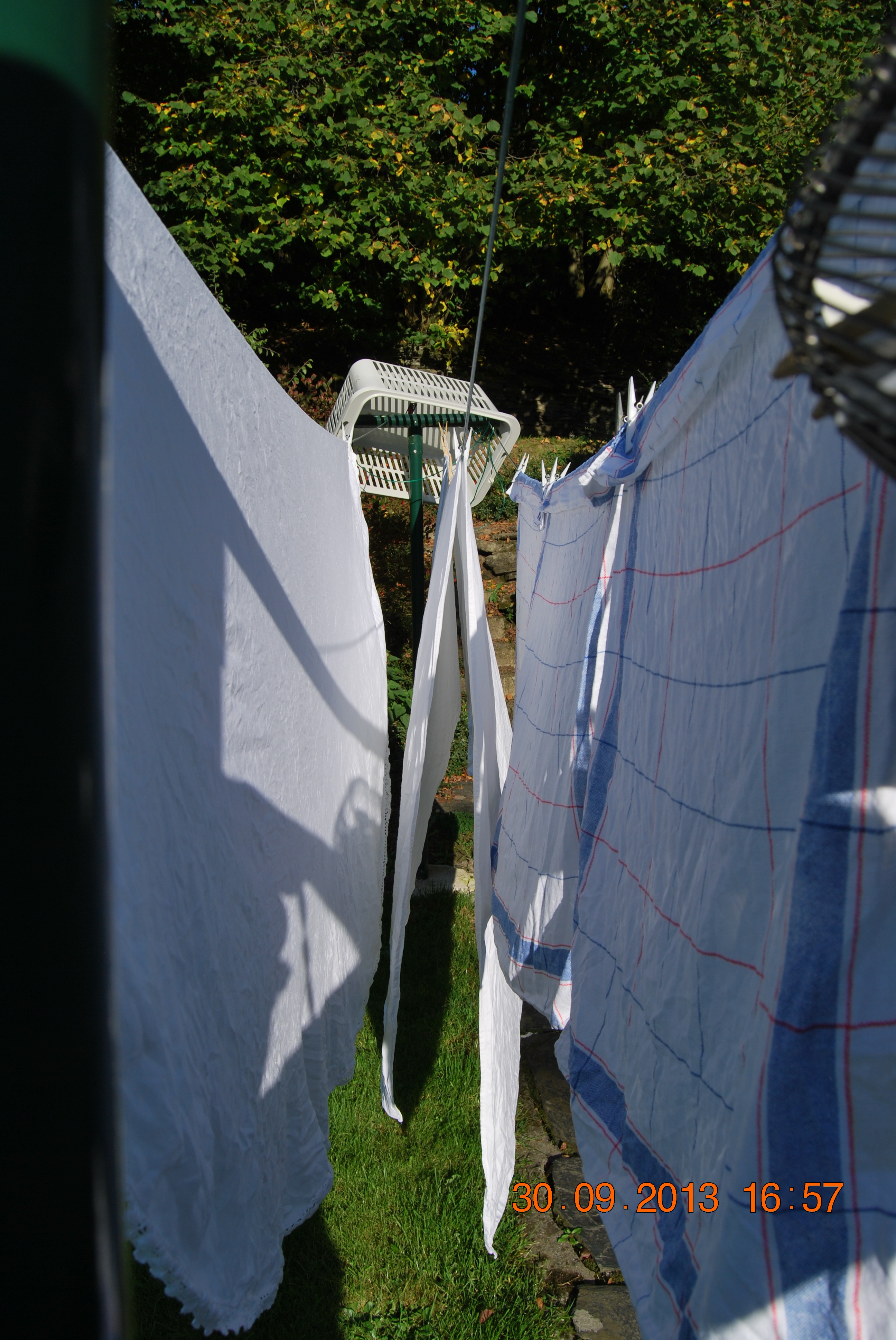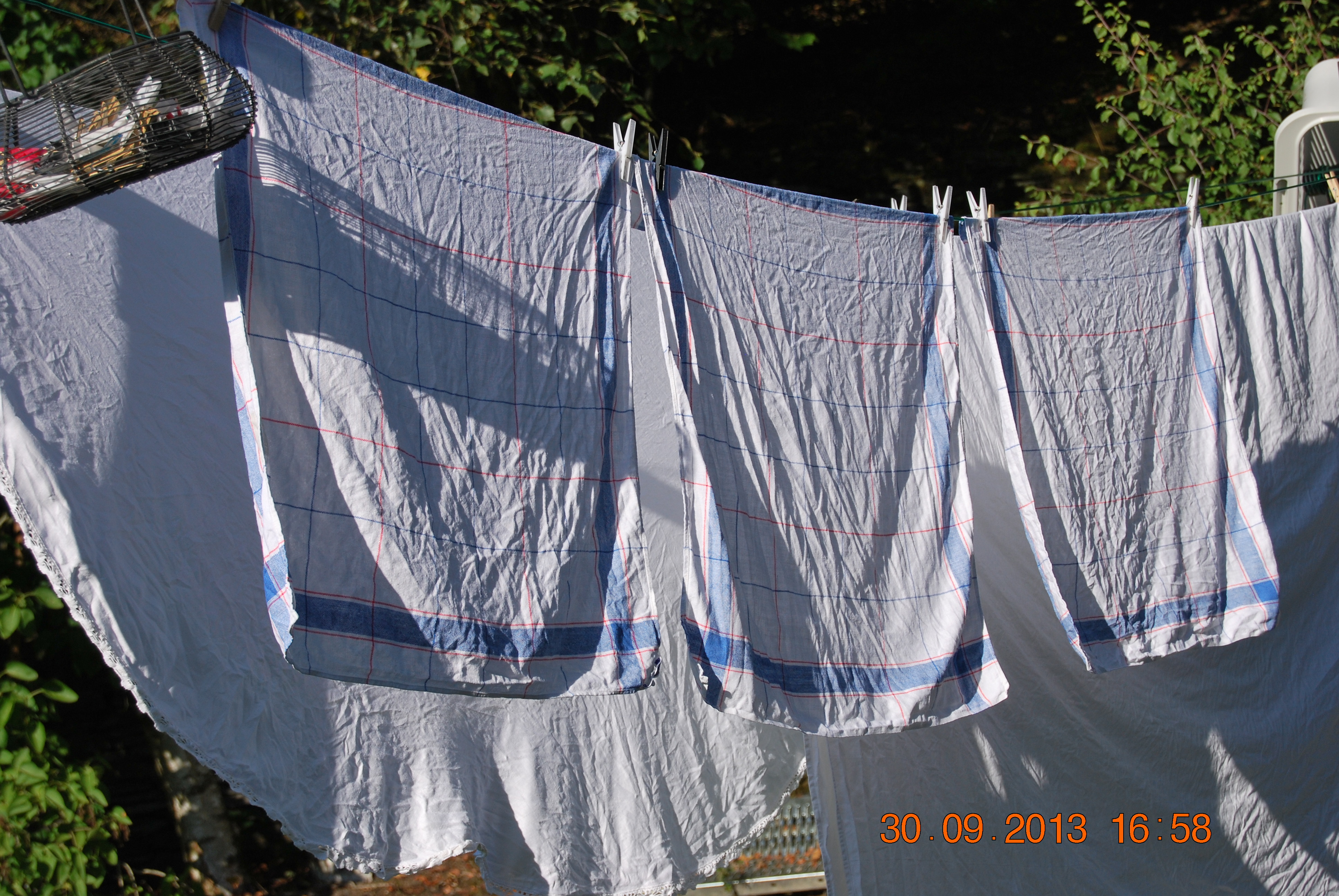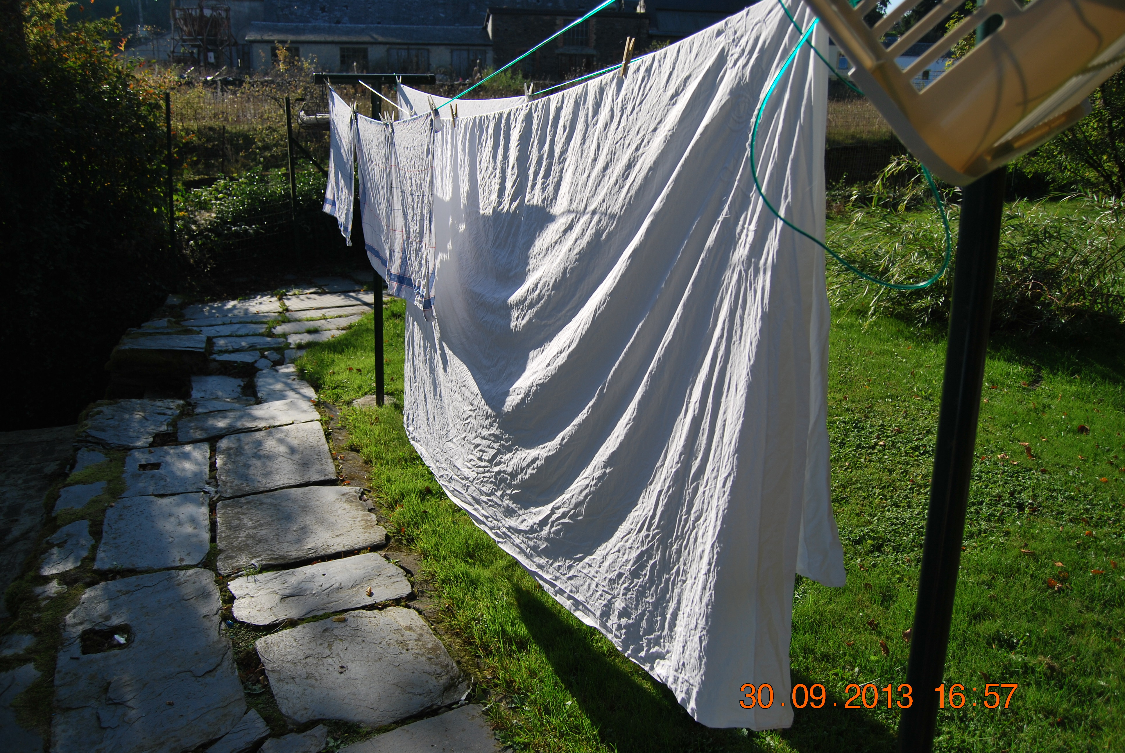 Quelques photos  de mes achats séchant au vent d’automne lors d’une brocante matinale ce dimanche. Drap brodé, nappe galonnée de dentelle (une ovale ! Juste ce qu’il faut pour recouvrir ma table !) et torchons en lin constituent mon « butin » du jour.085 094 088 095