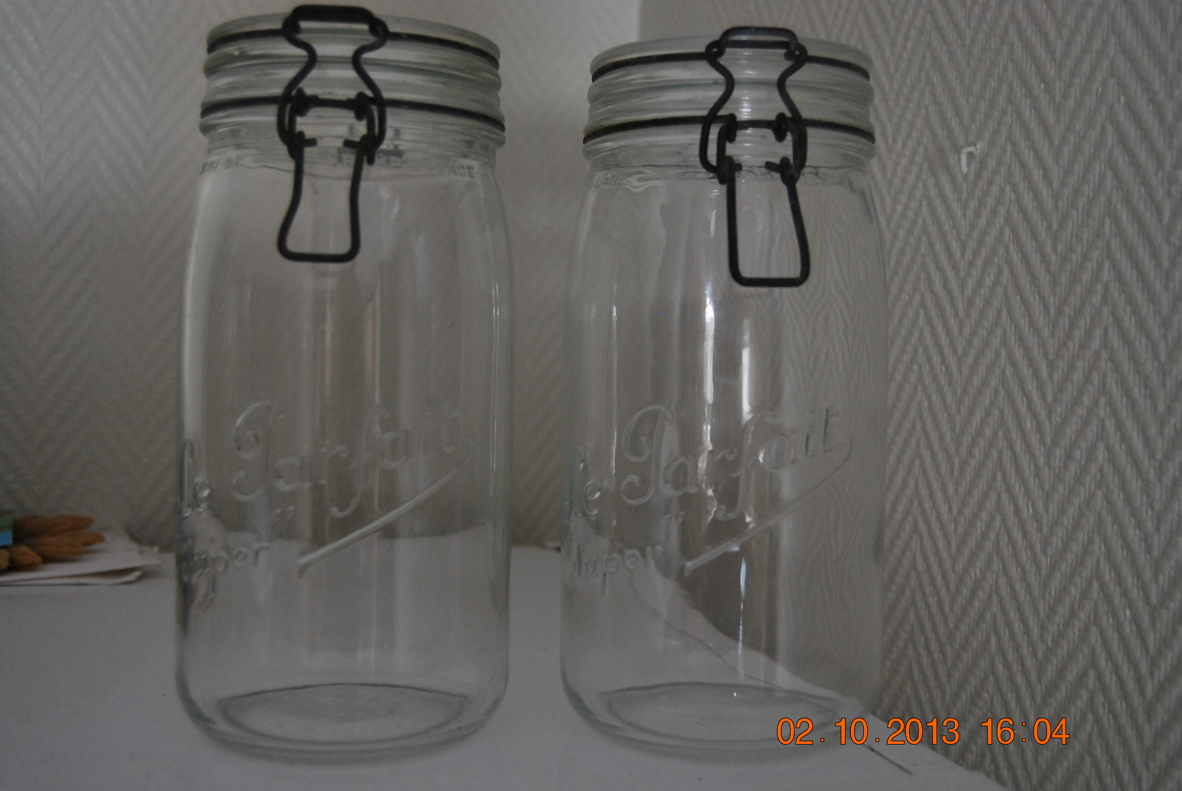 De cette brocante, j’ai également ramené deux bocaux « Le Parfait » d’une contenance de 1,5 litre chacun. Après lavage minutieux et surtout, désinfection et séchage en plein air, ils paradent sur le dessus de mon frigo pour l’instant en attendant de leur trouver une utilité … Mais j’ai déjà une petite idée « cadeau » en maturation …