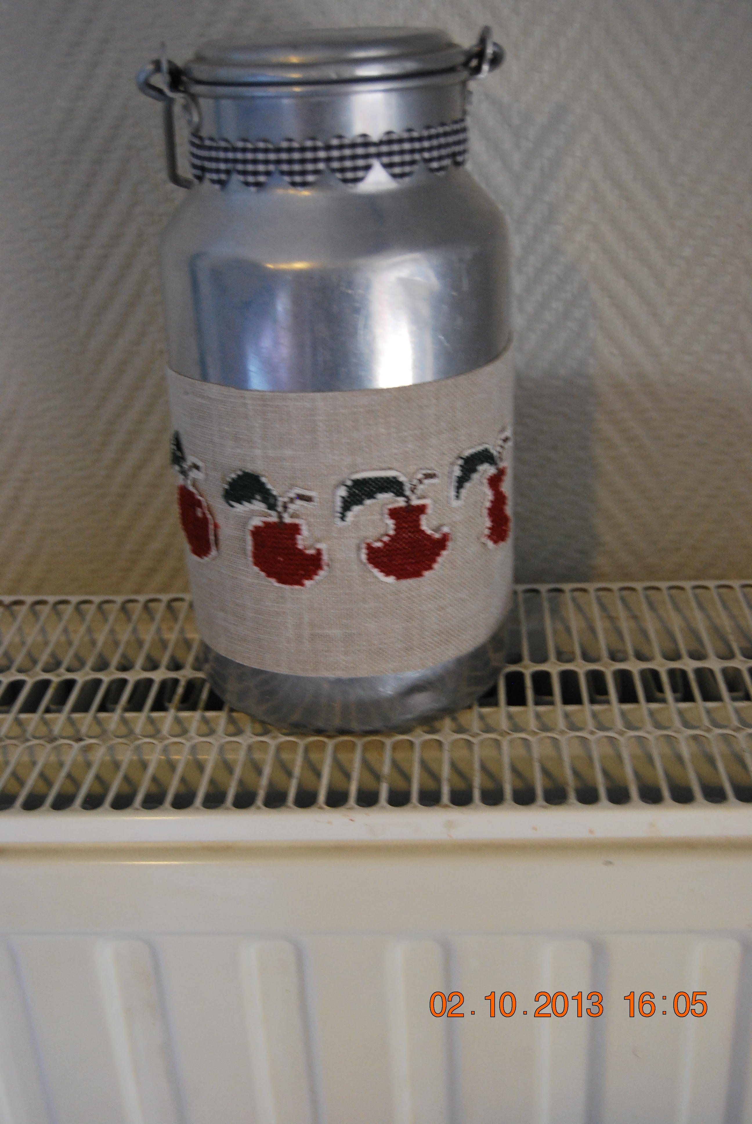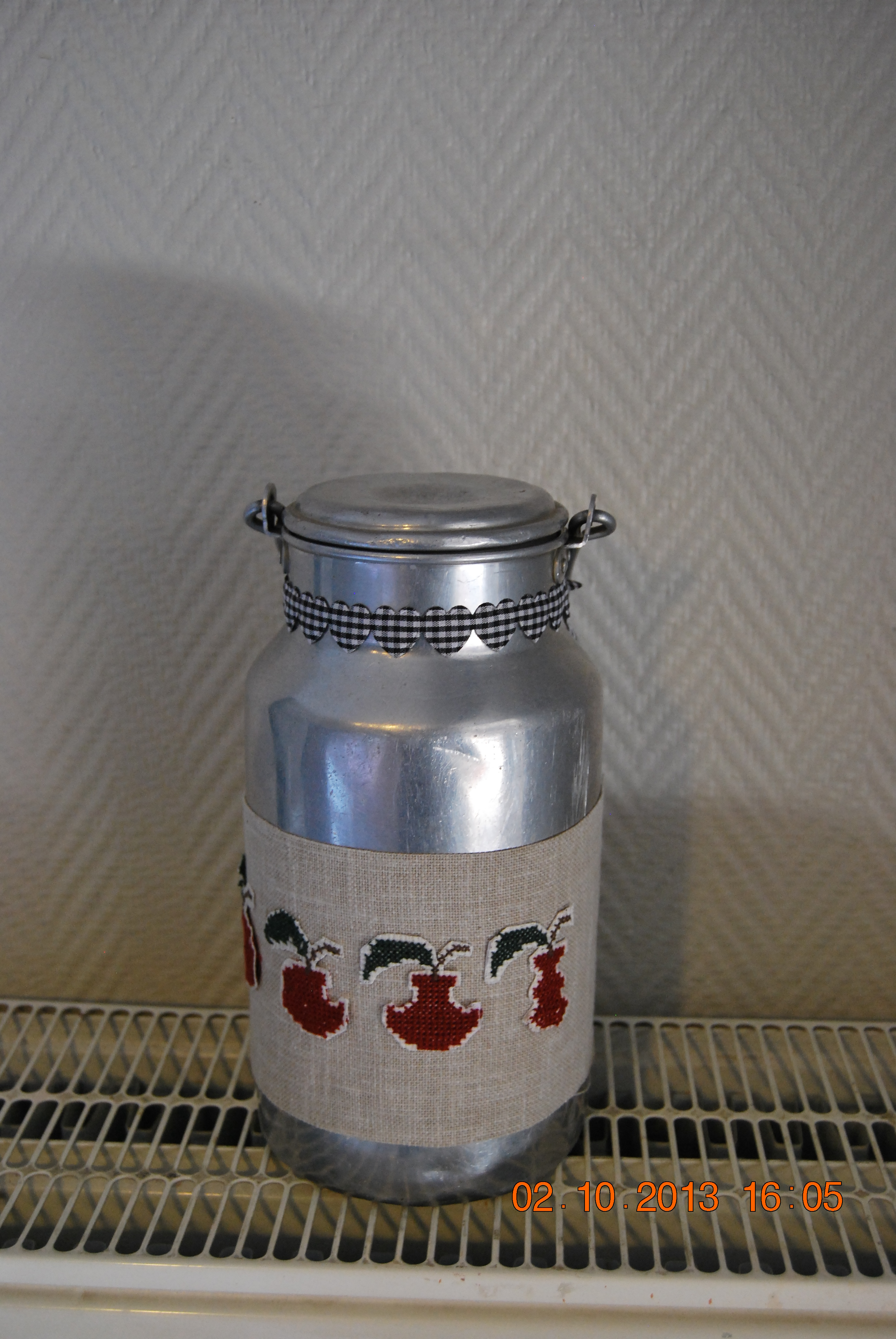 Je me suis aussi dernièrement « amusée » à vêtir le pot à lait en alu. J’ai découpé séparément les motifs de la broderie, je les ai collés sur du carton pour avoir un effet relief, repositionnés sur un morceau de lin et hop … un adhésif double face a fait l’affaire.