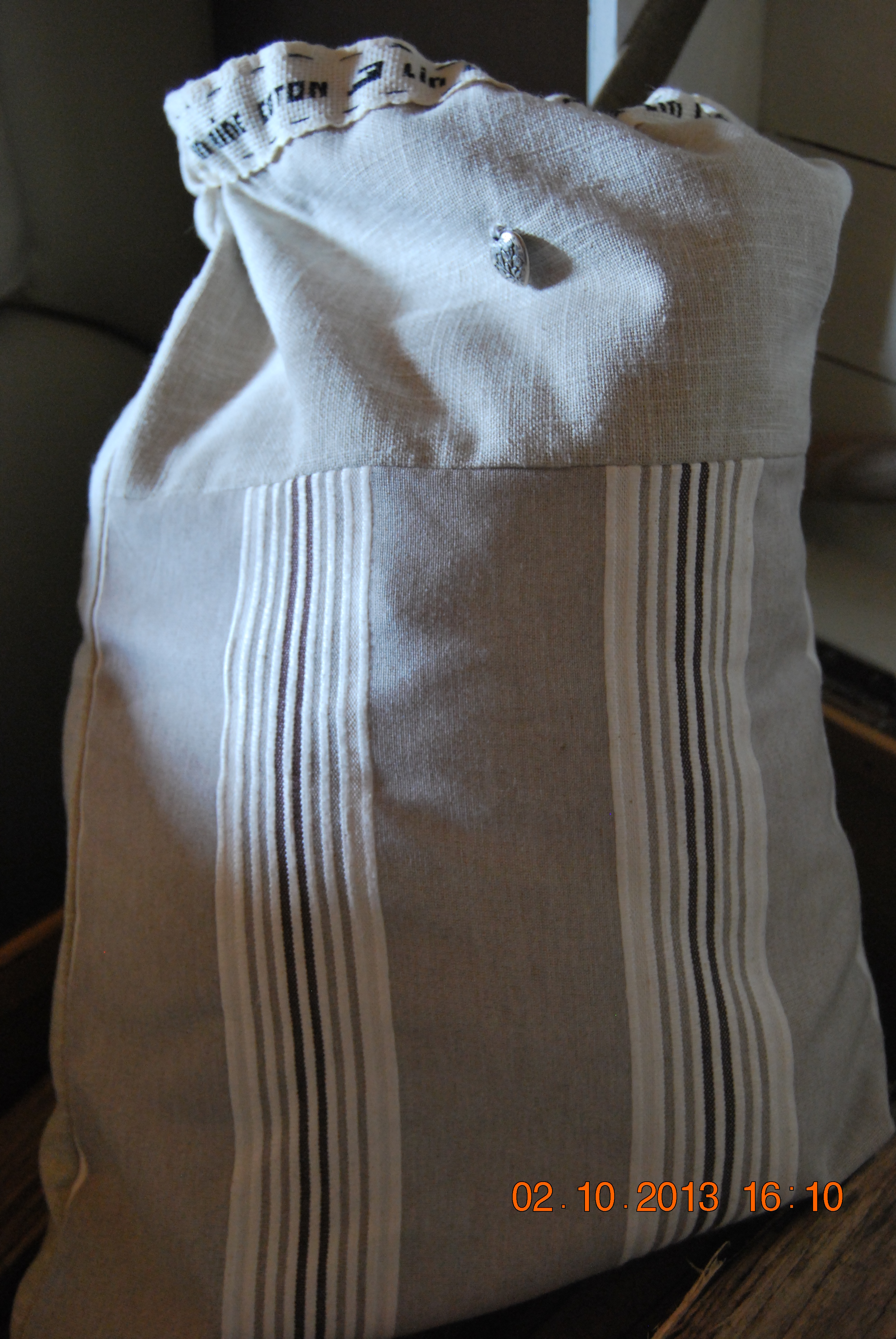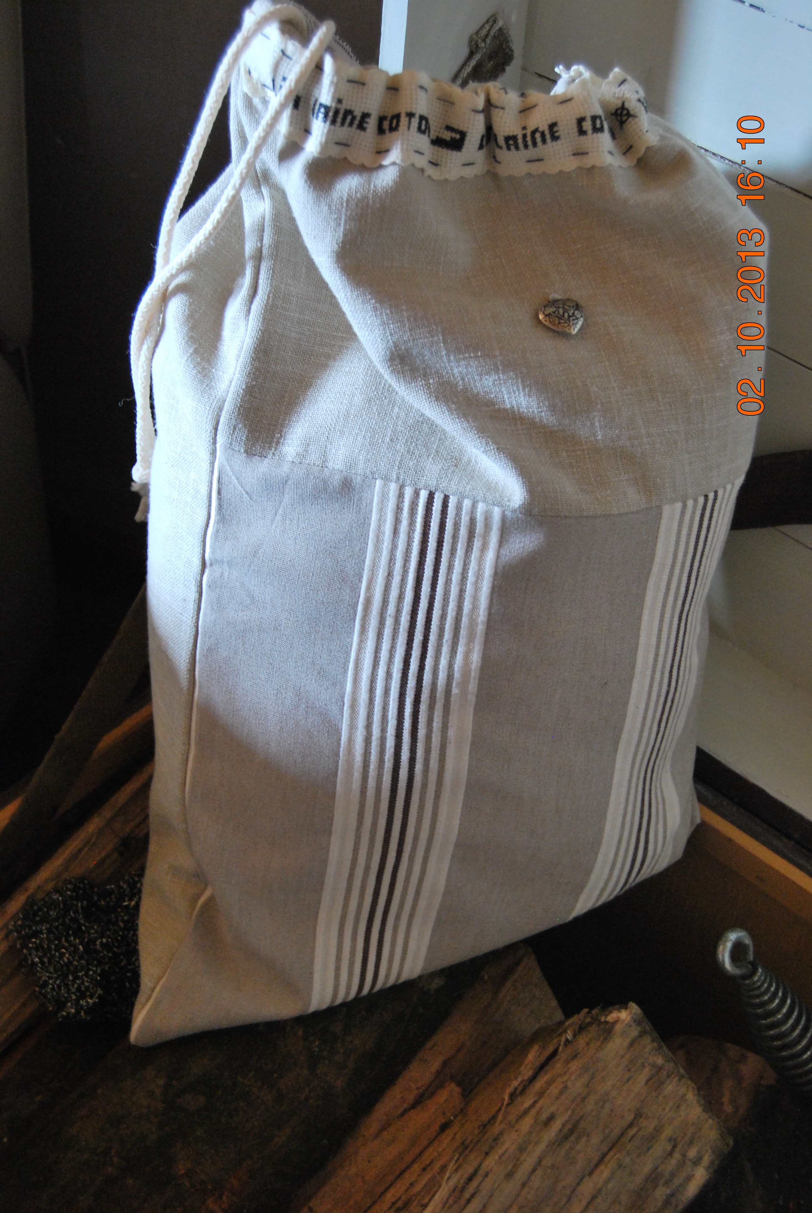 Dernièrement, j’ai réalisé un petit pochon avec mes restes de lin beige et de gros coton rayé.