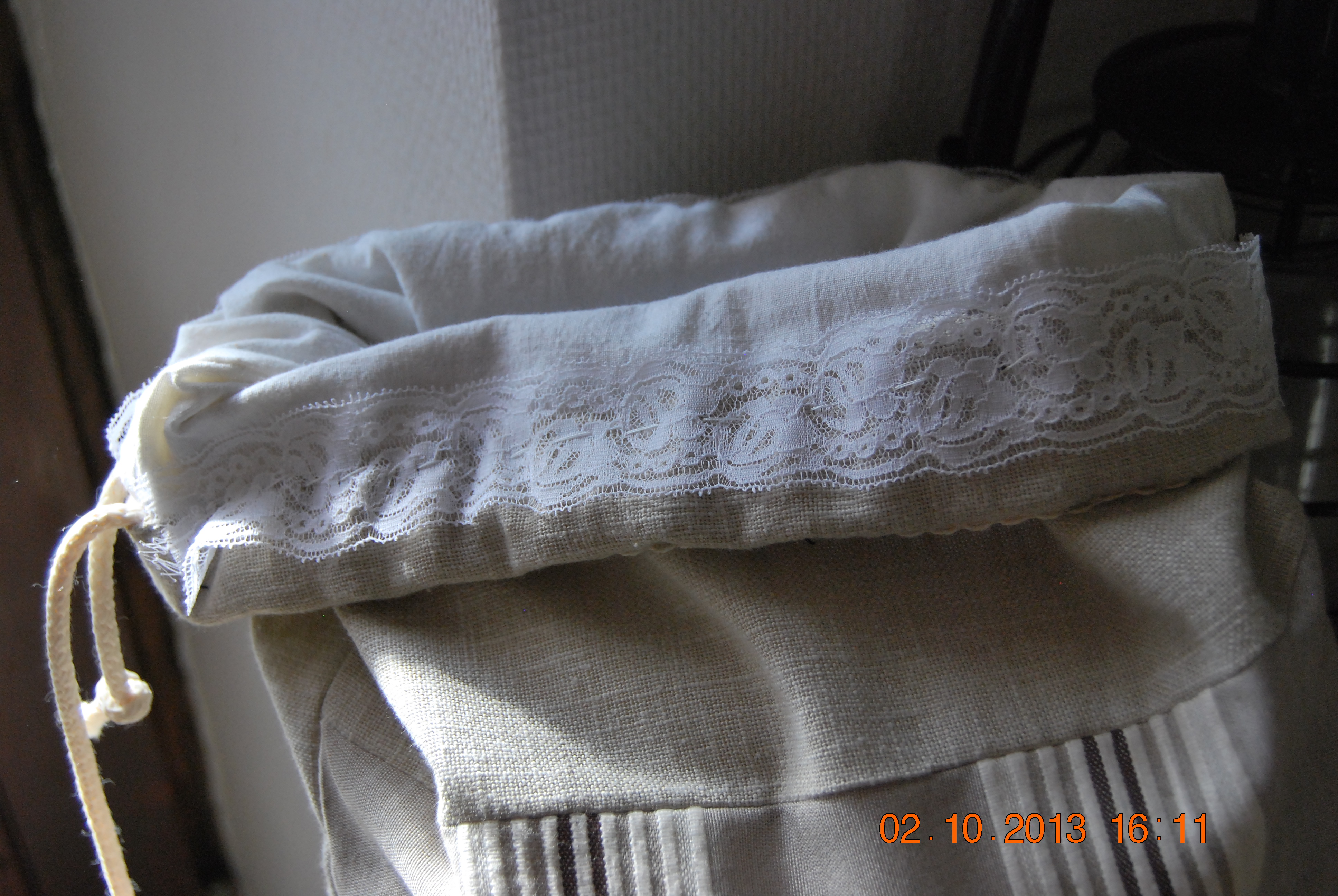 Il est entièrement doublé avec du coton blanc provenant des draps tout simples trouvés en brocante et j’ai intégré une dentelle pour recouvrir les coutures intérieures.